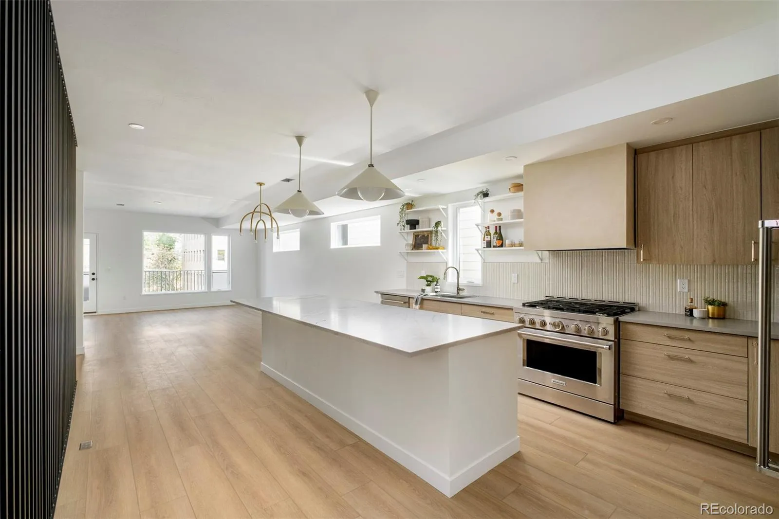 The chef’s kitchen is a true centerpiece, with a quartzite island, quartz-topped cabinetry, open shelving, stainless steel appliances, and a walk-in pantry- all designed for both beauty and function. The adjoining living and dining space glows with natural light from east-facing windows, anchored by a lime-washed fireplace that adds texture and sophistication.