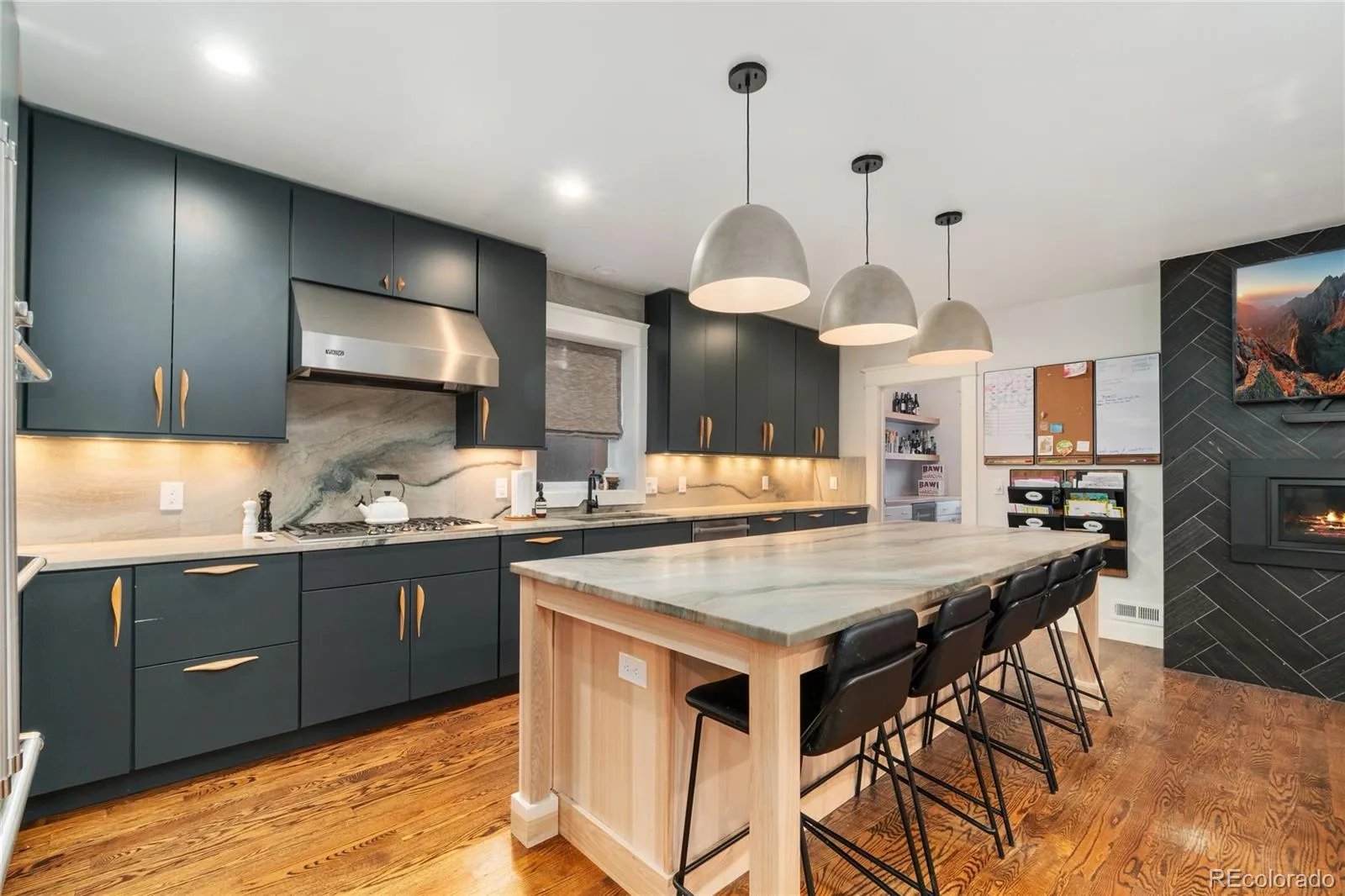 The heart of the home is a striking chef’s kitchen featuring dark custom cabinetry, dramatic stone countertops, and a spacious island with bar seating, opening to a warm and inviting living area with a sleek fireplace. From the dining space, step outside to a beautifully designed backyard patio—perfect for al fresco dining and relaxed evenings under the string lights.