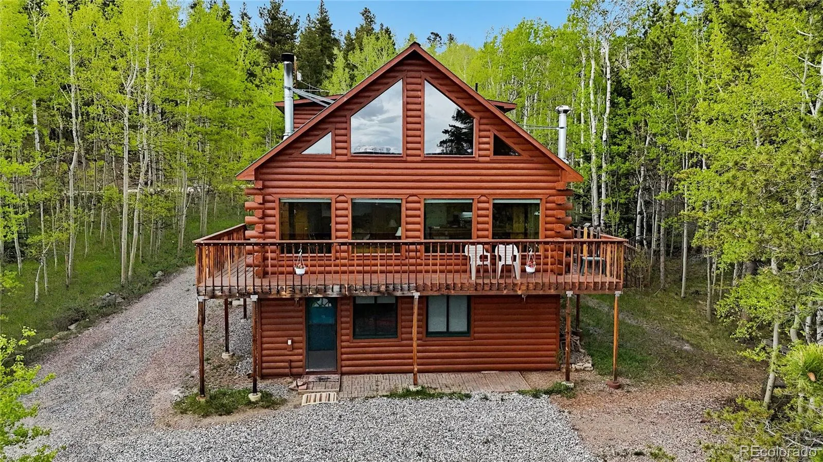 Live your dream in a custom log home in the Colorado Rockies amid a beautiful mix of pine and aspen and front view of the Indian Peaks! Located 20 miles west of Golden in Gilpin County. The chalet-style construction features a main level open kitchen with custom pine cabinets and dining and living areas where large picture windows bring the outdoors in. Observe wildlife from the wrap-around deck as you sip refreshing water from your own well. The master suite on the upper level boasts a spacious walk-in closet and bathroom with stylish corner tub. A cozy loft adjoins with a breathtaking view of Mt. Evans (Mt. Blue Sky), perfect for relaxing. The lower level includes a pine-paneled family room, home office/4th bedroom, & a laundry/utility area that is plumbed for a third bathroom. Updates include interior 6-panel pine doors, kitchen and bathroom fixtures, contemporary lighting, tiled kitchen counter, and water filtration system. Sturdy D-shaped spruce logs lend a genuine log-cabin feel. There are wood floors on the upper level and wood planking and beamed ceilings on the main level. Two wood-burning stoves create a cozy ambience, along with natural gas heat. Storage is generous throughout—the detached log-sided two-car garage has a walk-in attic, & a 9×20 shed provides even more storage! The driveway has space to park multiple vehicles. The lot is configured so no one can build in front of your view! Thoughtfully planned for fire mitigation, and the main station of Timberline Fire Dept. is just one mile away- a plus for insurance purposes. This property, in the Gilpin County School District, has the advantage of low property taxes. It’s a convenient 10-minute drive from the gaming and historic mining towns of Black Hawk and Central City, near Golden Gate State Park and the Arapahoe Nat. Forest. The charming mountain towns of Rollinsville and Nederland are 20 minutes away, & Golden, Evergreen & Idaho Springs each within a 30-min drive & Denver 1 hour. NEW FURNACE 2025