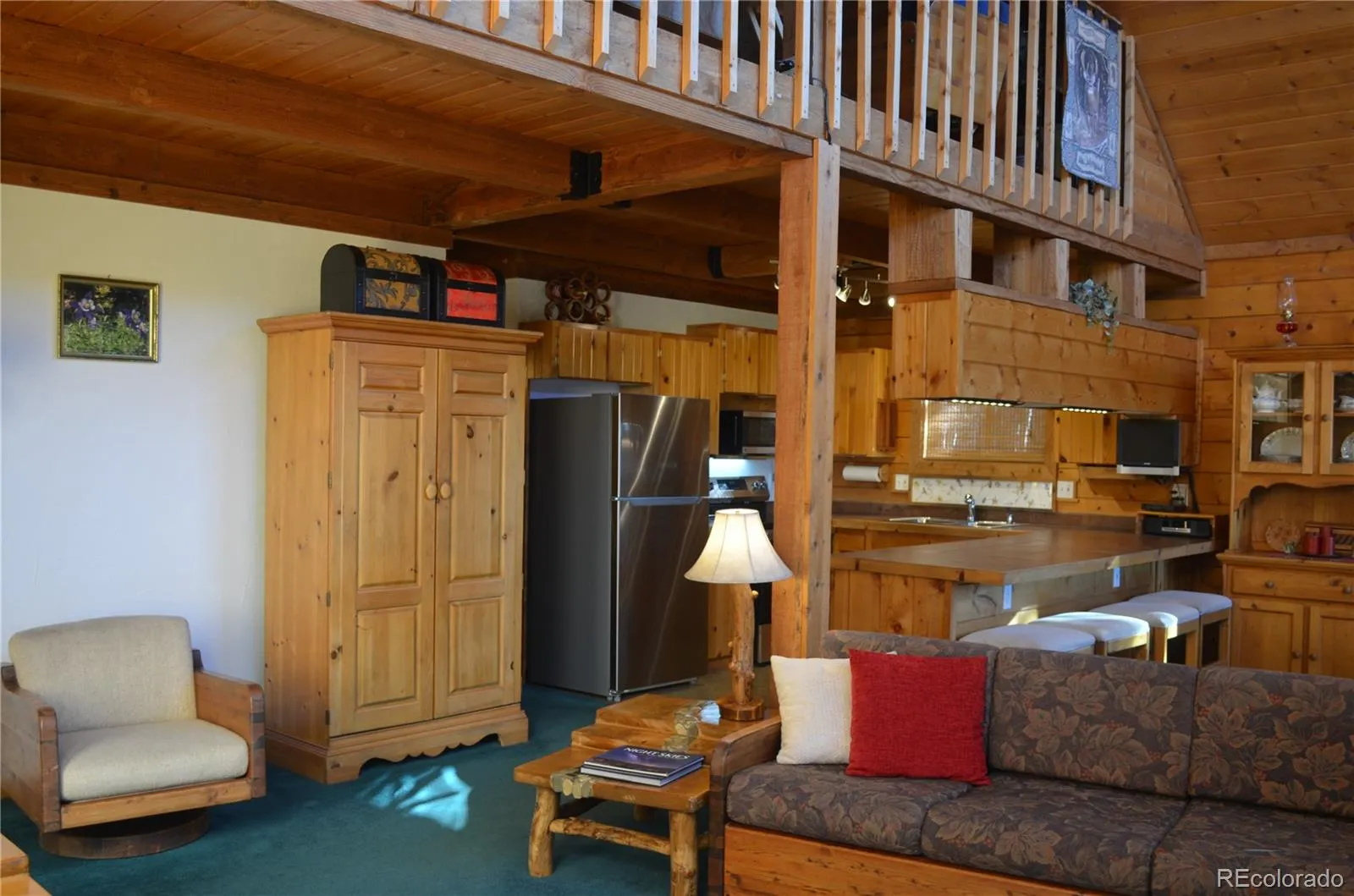 Updates include new stainless steel kitchen appliances, interior six-panel pine doors, kitchen and bathroom fixtures, contemporary lighting, tiled kitchen counter, water filtration system, new furnace and hot water heater 2025. D-shaped spruce log walls make it a genuine mountain experience. Upper level has wood floors, main level has beamed ceilings. Natural gas heat.