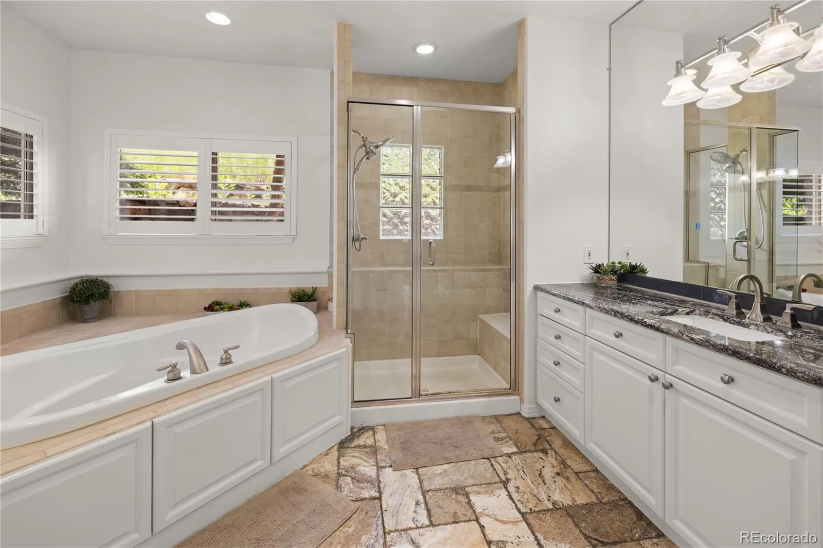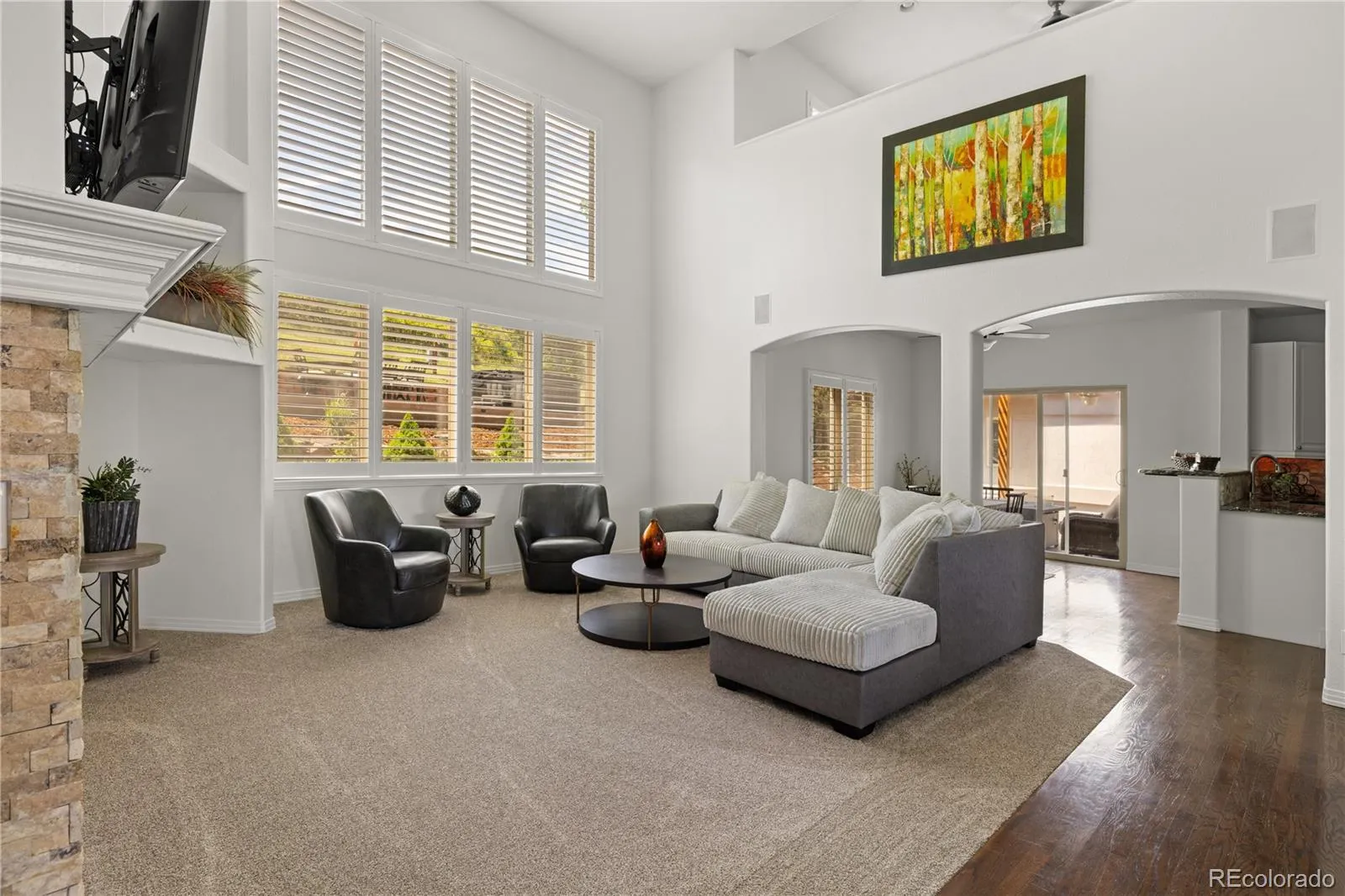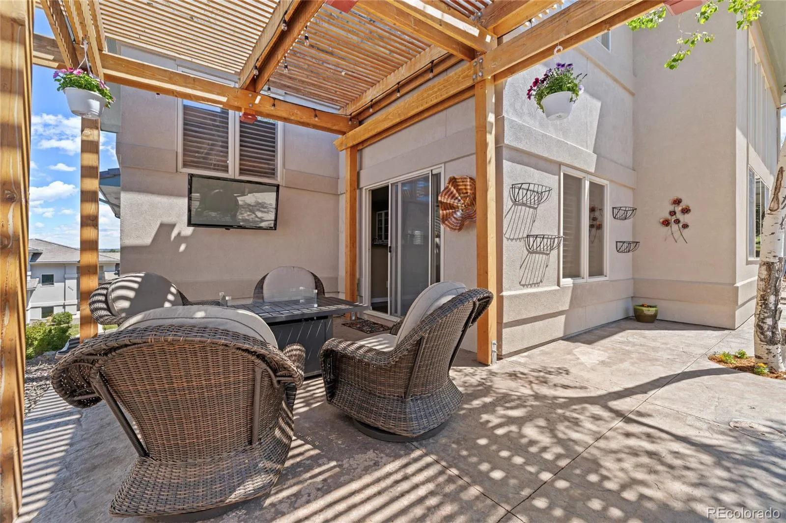Step into this stunning semi-custom contemporary home, nestled in the highly sought-after gated community of Roxborough Park a neighborhood celebrated for its dramatic red rock formations, just down the road from the famed Arrowhead Golf Course, this location is a golfer’s paradise and a nature lover’s respite. 2 minute walk to Arrowhead Golf Course Clubhouse. Play a round of golf or dine at the club house and enjoy amazing views! Wildlife galore! Deer, wild turkeys, black bears and more! Boasting 4,500 total square feet, this residence features 5 bedrooms, 3.5 bathrooms, and a spacious 3.5-car garage. It backs to open space and is directly below the 9th tee box of Arrowhead Golf Course, offering both privacy and scenic views. The vaulted great room welcomes you with a cozy gas log fireplace, rich hardwood flooring, and a stylish carpet inlay—perfect for relaxing or entertaining. New carpet and paint! through out! The adjacent kitchen features granite countertops, an island, and a walk-in pantry for extra storage, plus plantation shutters! The main-floor primary suite is a luxurious retreat, complete with dual granite top vanities, an oversized Jacuzzi tub, and a large walk-in closet. Upstairs, two generously sized bedrooms share a Jack-and-Jill bathroom with tile flooring and granite countertops. A loft area opens to the great room below, adding a sense of openness and light. The fully finished basement offers exceptional flexibility, designed as a fully functional Next Gen Suite with 2 bedrooms, a full bathroom with a jetted soaking tub, a full kitchen, and a large living/entertainment space ideal for guests. The 3.5-car garage features high ceilings, built-in cabinets, and a designated workspace, ideal for hobbies or storage. Outside, enjoy virtually maintenance-free hardscape, with amazing views and a great patio pergola to enjoy!