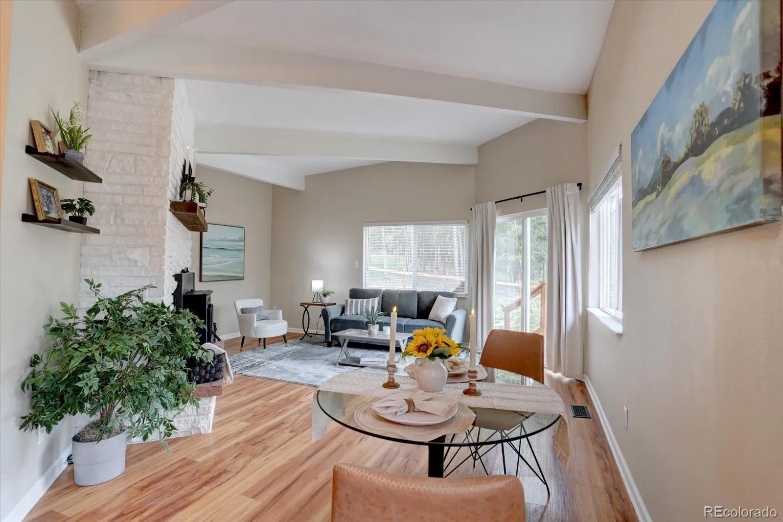 PRICE REDUCTION! on this charming 4-bedroom, 2-bathroom mountain contemporary nestled on 1.11 usable acres in Black Mountain Ranch Estates subdivision in desirable Jefferson county. This inviting home offers a partial fenced-in yard perfect for pets and a blend of comfort and style with thoughtful updates throughout, including an updated white brick fireplace with a pellet stove for those cozy winter nights. The beautifully remodeled kitchen features rich soapstone countertops, a crisp white tile backsplash, a new sink, and stainless steel appliances. Fresh interior paint, updated lighting, and modernized bathrooms add a clean, refreshed feel. A bonus guest suite or potential mother-in-law space with a private entrance offers flexibility for guests or multi-generational living. Upstairs, the open loft area includes two distinct spaces—ideal for a bedroom, home office, den, or flex area with a sliding glass door that opens to one of four private decks, each offering peaceful outdoor retreats. Enjoy ample parking, an attached storage room on the east side, and two additional sheds that remain with the property. Whether you’re entertaining, relaxing, or soaking in the mountain air and watching local wildlife, this property offers it all. Close access to hiking and biking trails and Conifer & Evergreen shopping and amenities. Don’t miss the opportunity to make this mountain gem your own!