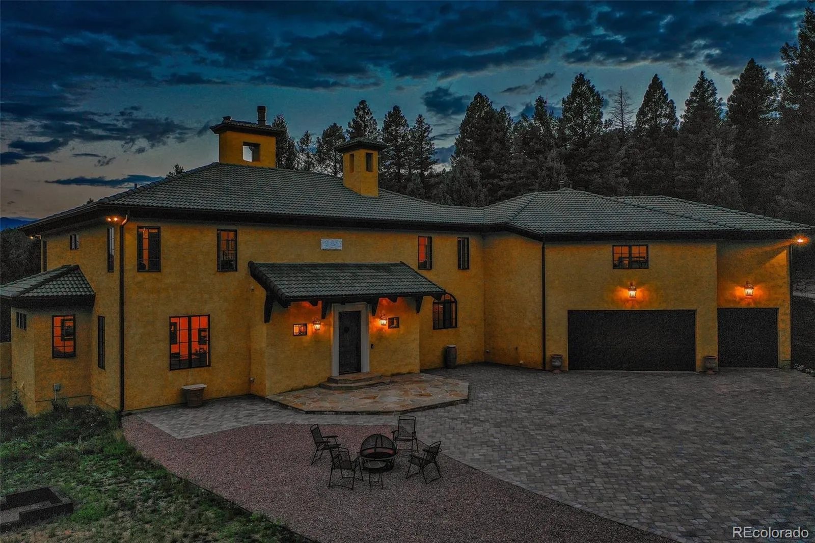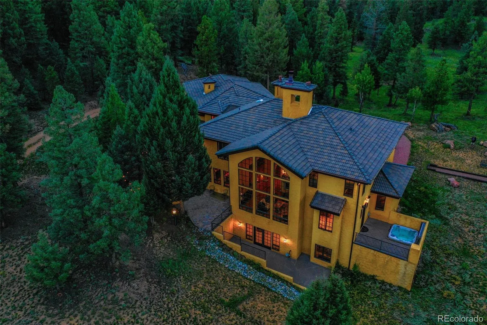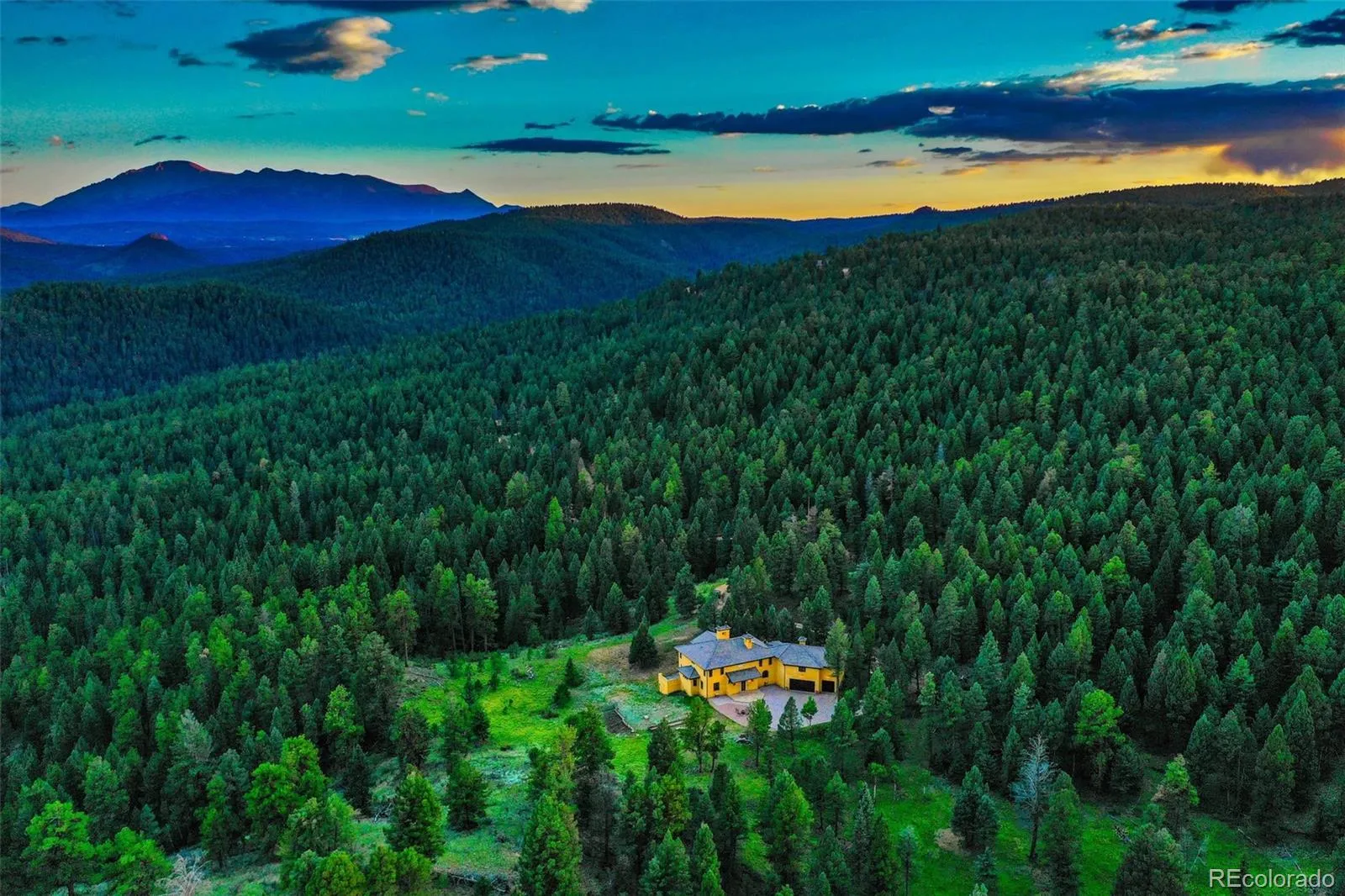 This meticulously designed luxury estate sits on 40 acres of wooded land zoned A-1 (agricultural), bordered by National Forest on 2 sides and BLM land on the third, and only 10 minutes from Woodland Park, offering a unique blend of elegance and tranquility. This custom home was constructed in 2004 and has been used as a second home by the original owners. A heated 3-car garage, new cobblestone driveway, flagstone entry, and exterior copper gutters add a touch of grandeur to your arrival. The gourmet kitchen is equipped with top-of-the-line appliances, including two Bosch dishwashers, a Subzero refrigerator, and a Wolf gas range with double ovens. The decorative features such as hand-painted Italian backsplash tile and hand-trowled stucco walls are set against custom alder cabinets and oak flooring. The spacious living areas provide stunning views of Pike’s Peak. Cozy up by one of the two fireplaces indoors or enjoy the outdoor stone fireplace in the patio kitchen, perfect for alfresco dining. Immerse yourself in the natural beauty surrounding the property. Engage in outdoor activities like horseshoes, unwind in the serenity of your private hot tub, or take a short 10-minute drive to play golf. This home is perfect for a couple’s solitude or hosting friends and family (easily providing lodging for 16-20). A few of this home’s unique features include a wine cellar, limestone columns/fireplace mantle, a “bunkhouse” (or exercise room, quilting room, or whatever you desire), 2 laundry facilities, and a mudroom/butler’s pantry/bar with lighted mullion cabinet doors. Structural integrity and insulation are ensured with exterior walls 18 inches thick, providing durability and peace of mind. New security system installed in 2024. This Tuscan-inspired masterpiece offers a sanctuary where luxury, comfort, and natural beauty converge seamlessly. Escape to this idyllic retreat where convenience meets seclusion in the heart of Colorado’s beautiful landscape.