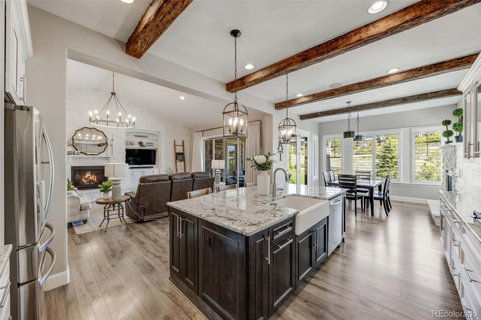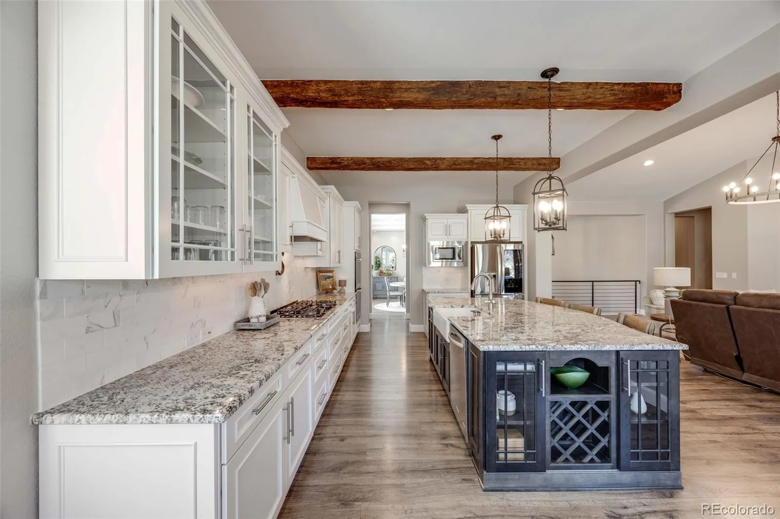 Situated on a corner lot that backs to open space in the Backcountry neighborhood, this exceptional ranch-style residence blends comfort and thoughtful design. From the moment you arrive, the home’s curb appeal and beautifully landscaped exterior set the tone. Step through the front door into a warm, inviting foyer that opens to curated living spaces. A bright main-floor office features French doors, soaring ceilings, and custom built-in shelving—perfect for remote work or creative pursuits. Guests will enjoy a private retreat at the front of the home with a spacious bedroom and attached 3/4 bath. The formal dining room is elegant with crown molding and direct access to a butler’s pantry with beverage fridge, ideal for entertaining. The heart of the home is the well-appointed kitchen, featuring white cabinetry, gas cooktop, newer refrigerator, and a large island perfect for gathering. A cozy fireplace anchors the eat-in area, which flows into the vaulted living room with a white-washed stone fireplace and a wall of sliding doors that open to the backyard oasis—complete with built-in grill, patio space, and open views. The primary suite offers vaulted ceilings, patio access, an updated 5-piece bath, and custom walk-in closet. Descend the elegantly curved staircase, accented by a modern iron railing, the finished lower level includes a wet bar with a beverage fridge, another fireplace, spacious home gym, two bedrooms, and a full bath. Whether you’re entertaining guests or working from home, or simply seeking a peaceful retreat that balances modern amenities with natural surroundings, this stunning 4-bedroom, 4-bathroom home truly delivers, from the layout to the finishes and the location that offers access to exceptional neighborhood amenities, including pools, trails, parks, and scenic open space; this is more than just a house—it’s a lifestyle! This remarkable home is one that the most discerning buyer will undoubtedly fall in love with.