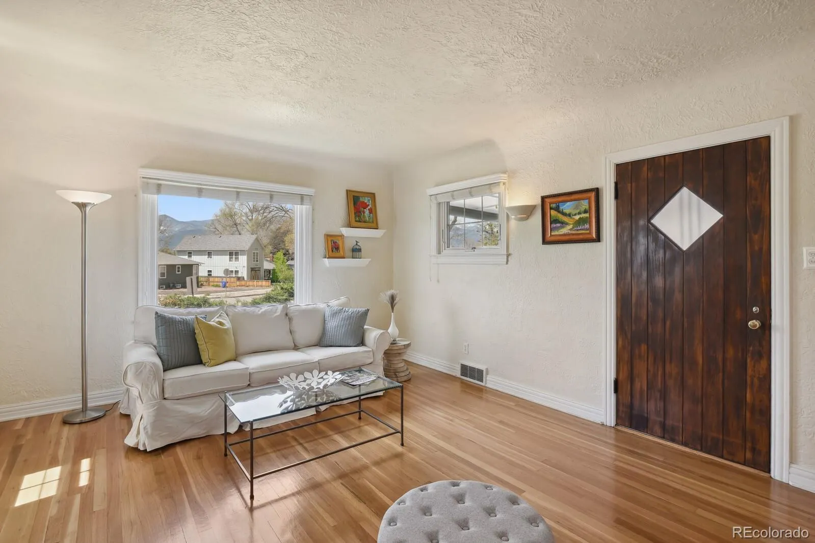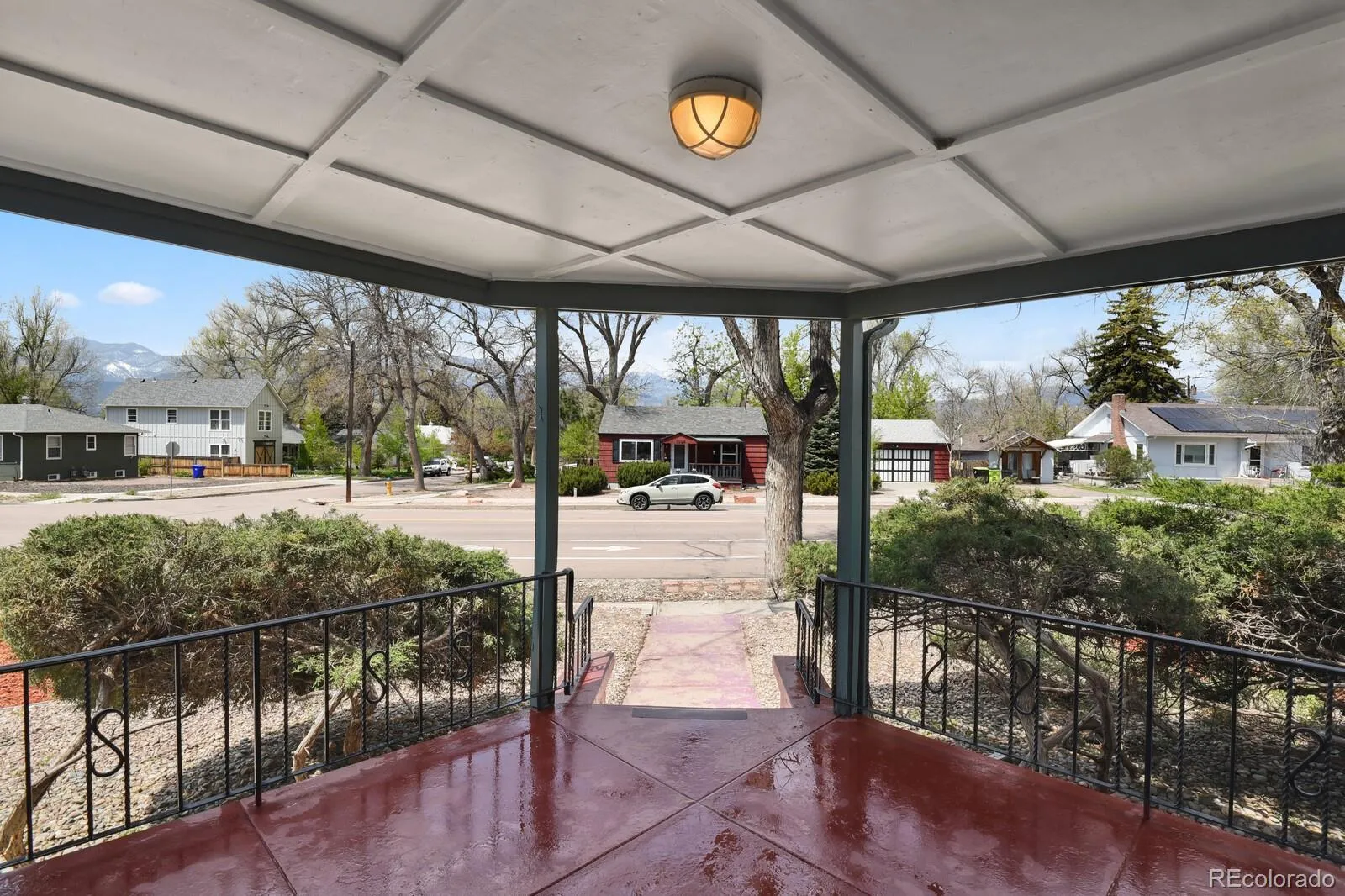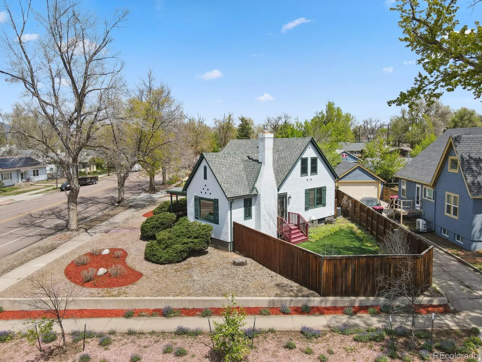 Charming 1938 Tudor home situated on a corner lot with Pikes Peak Views, covered front porch, and a fully fenced in yard. Located in the desirable Shooks Run neighborhood, this beauty has four bedrooms, four bathrooms, and a two car garage. Upon entering the home, you will be bathed in warm and abundant light from the large bay window and stunning Pikes Peak views. Original wood floors, quaint architectural period details, coved ceilings, and gas fireplace complete the picture book charm of the living room. French doors from the living room lead to the private backyard with mature landscaping and artificial grass for seasonal low maintenance. The living room opens up to the large dining room and leads to the kitchen with new stainless steel dishwasher, tile flooring, recessed lighting, refrigerator, gas range, and overhead microwave. There is access from the kitchen to the driveway and two car garage for extra added convenience. There are two main level large bedrooms and a 3/4 bathroom, one of the bedrooms could be used as a primary. Upper level bedroom suite has an adjoining full bathroom with soaking tub and walk-in closet. The lower level has original cedar wood ceilings/wall surround with an oversized family room and additional bedroom/bath. The 4th bedroom has an en-suite with a walk-in closet, full adjoining bathroom, and an egress window. The full bathroom has been updated with tile flooring, subway tile surround, fixtures, and a pedestal sink. Beautiful hard flooring throughout—no carpet to worry about. Some updates include, new Anderson windows, new roof (20), A/C (24), furnace (12), lighting, gutters (20), radon mitigation, and professional landscaping. There is additional storage in the attic with a door for easy access. This home offers exceptional walkability, with easy access to nearby parks, scenic trails, restaurants, coffee shops, hospital, Olympic Training Center, entertainment, and the vibrant downtown area—all just a short stroll away!