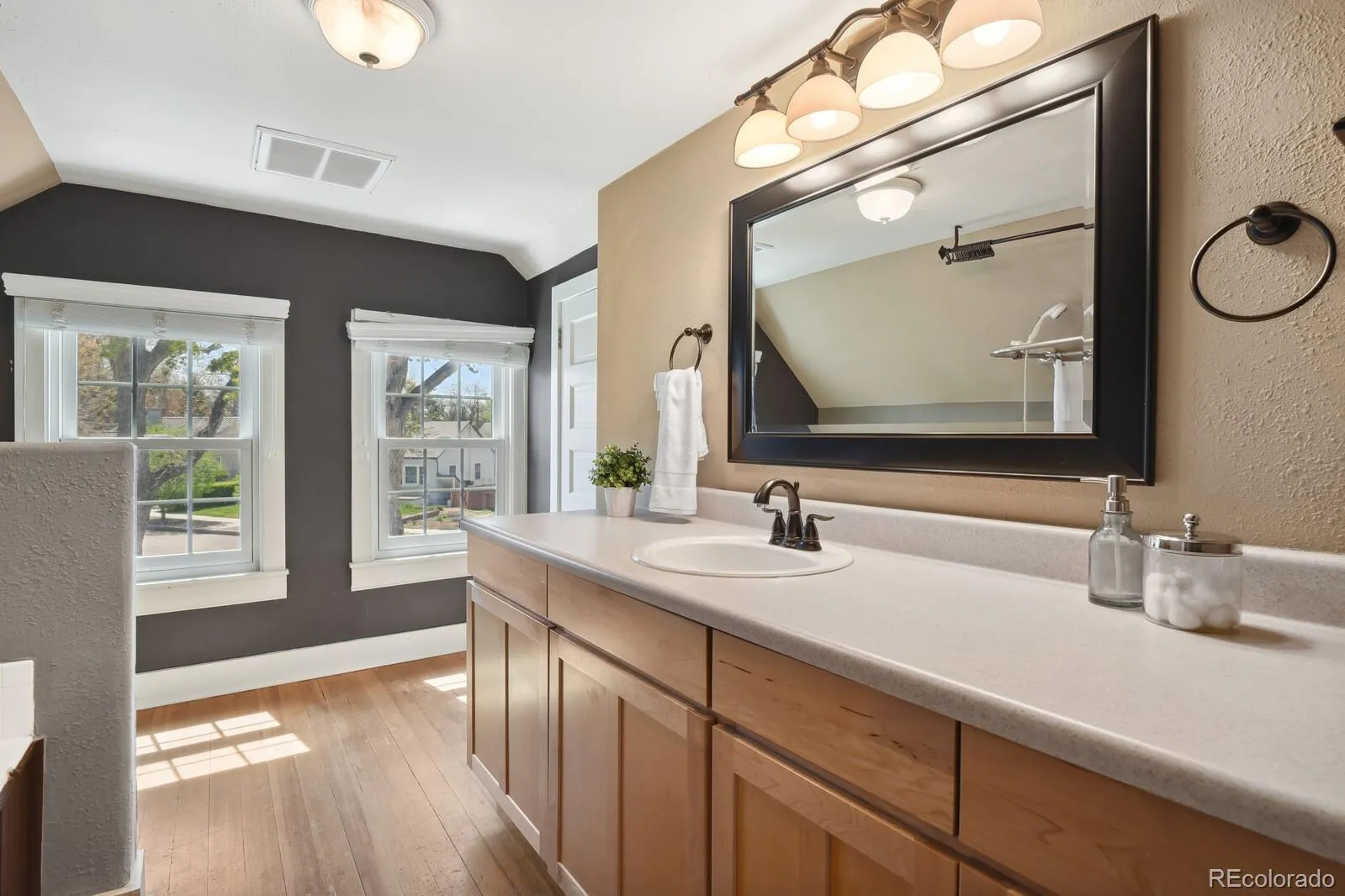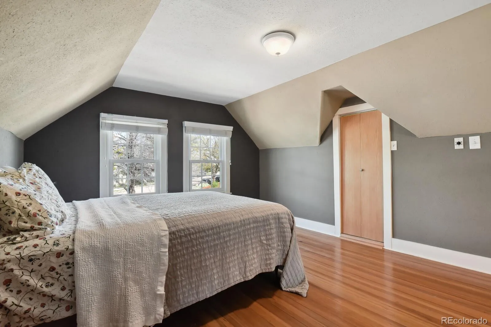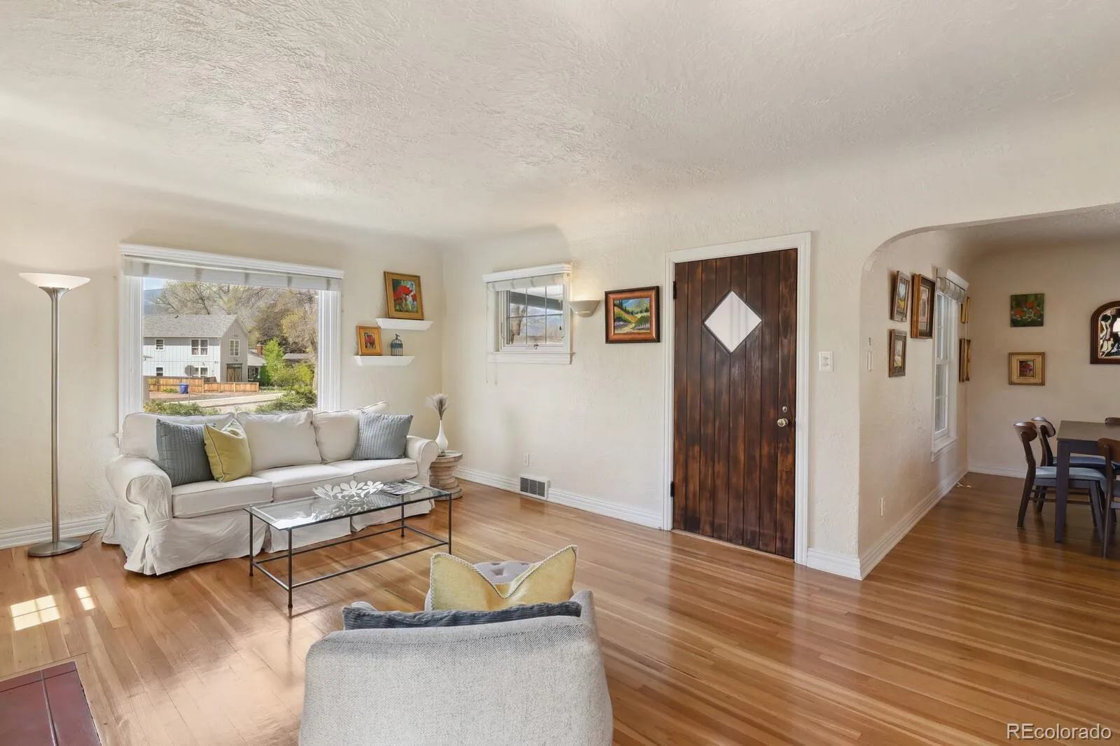 Charming 1938 Tudor home situated on a corner lot with Pikes Peak Views, covered front porch, and a fully fenced in yard. Located in the desirable Shooks Run neighborhood, this beauty has four bedrooms, four bathrooms, and a two car garage. Upon entering the home, you will be bathed in warm and abundant light from the large bay window and stunning Pikes Peak views. Original wood floors, quaint architectural period details, coved ceilings, and gas fireplace complete the picture book charm of the living room. French doors from the living room lead to the private backyard with mature landscaping and artificial grass for seasonal low maintenance. The living room opens up to the large dining room and leads to the kitchen with new stainless steel dishwasher, tile flooring, recessed lighting, refrigerator, gas range, and overhead microwave. There is access from the kitchen to the driveway and two car garage for extra added convenience. There are two main level large bedrooms and a 3/4 bathroom, one of the bedrooms could be used as a primary. Upper level bedroom suite has an adjoining full bathroom with soaking tub and walk-in closet. The lower level has original cedar wood ceilings/wall surround with an oversized family room and additional bedroom/bath. The 4th bedroom has an en-suite with a walk-in closet, full adjoining bathroom, and an egress window. The full bathroom has been updated with tile flooring, subway tile surround, fixtures, and a pedestal sink. Beautiful hard flooring throughout—no carpet to worry about. Some updates include, new Anderson windows, new roof (20), A/C (24), furnace (12), lighting, gutters (20), radon mitigation, and professional landscaping. There is additional storage in the attic with a door for easy access. This home offers exceptional walkability, with easy access to nearby parks, scenic trails, restaurants, coffee shops, hospital, Olympic Training Center, entertainment, and the vibrant downtown area—all just a short stroll away!