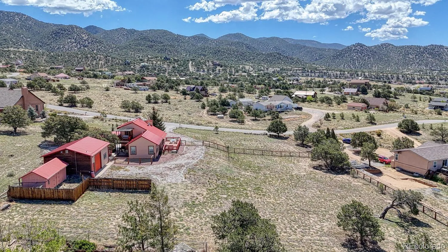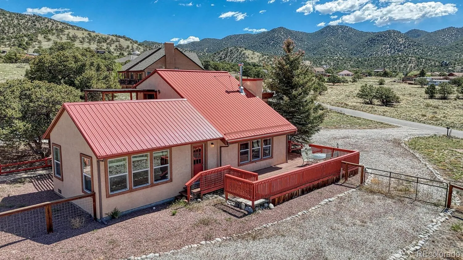 Colorado style A frame with loft and a new primary suite addition. Incredible mountain views to the south and east. This lovely home with a charming cozy feel is located on the hill overlooking the historic town of Salida. Enjoy grand views of the 14 thousand foot mountain peaks for fabulous sunrises and sunsets. The Living room boasts a vaulted ceiling and a wood burning stove. A total of 3 bedrooms and 2 1/2 baths with the loft over the living room has a charming cozy feel. Nice deck off of the living room to enjoy the massive views along with the private balcony off of the upper loft bedroom for plenty of outdoor space. Large detached garage with 720 sq ft, plus a carport, garden area, Large shed for your toys and plenty outdoor space on this 1.1 acre lot in the desirable Pinon Hills subdivision. Heated finished bonus room & bath for office/art studio with approximately 253 sq ft in the detached garage/shop. Close to all of the recreation the Heart of the Rockies has to offer. Hiking public lands, biking, rafting, fly fishing on the Arkansas River, Skiing at Monarch Mountain. Three miles from historic downtown for dining, entertainment venues and shopping. The perfect home in the mountains. Shown by appointment.