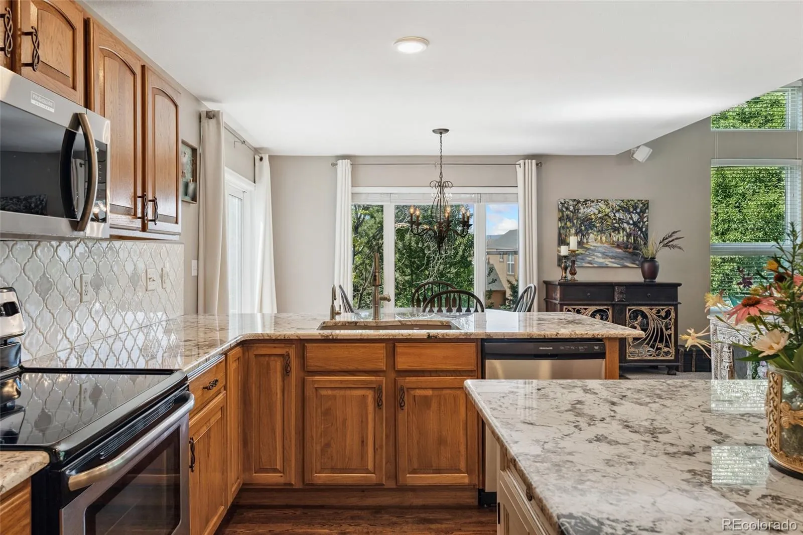 This gorgeous Highlands Ranch home with mountain views and a walkout basement is move-in ready with thoughtful updates throughout. The chef’s kitchen stands out with stained hickory cabinets, rare granite counters, a custom island, plus new dishwasher and microwave (2025).