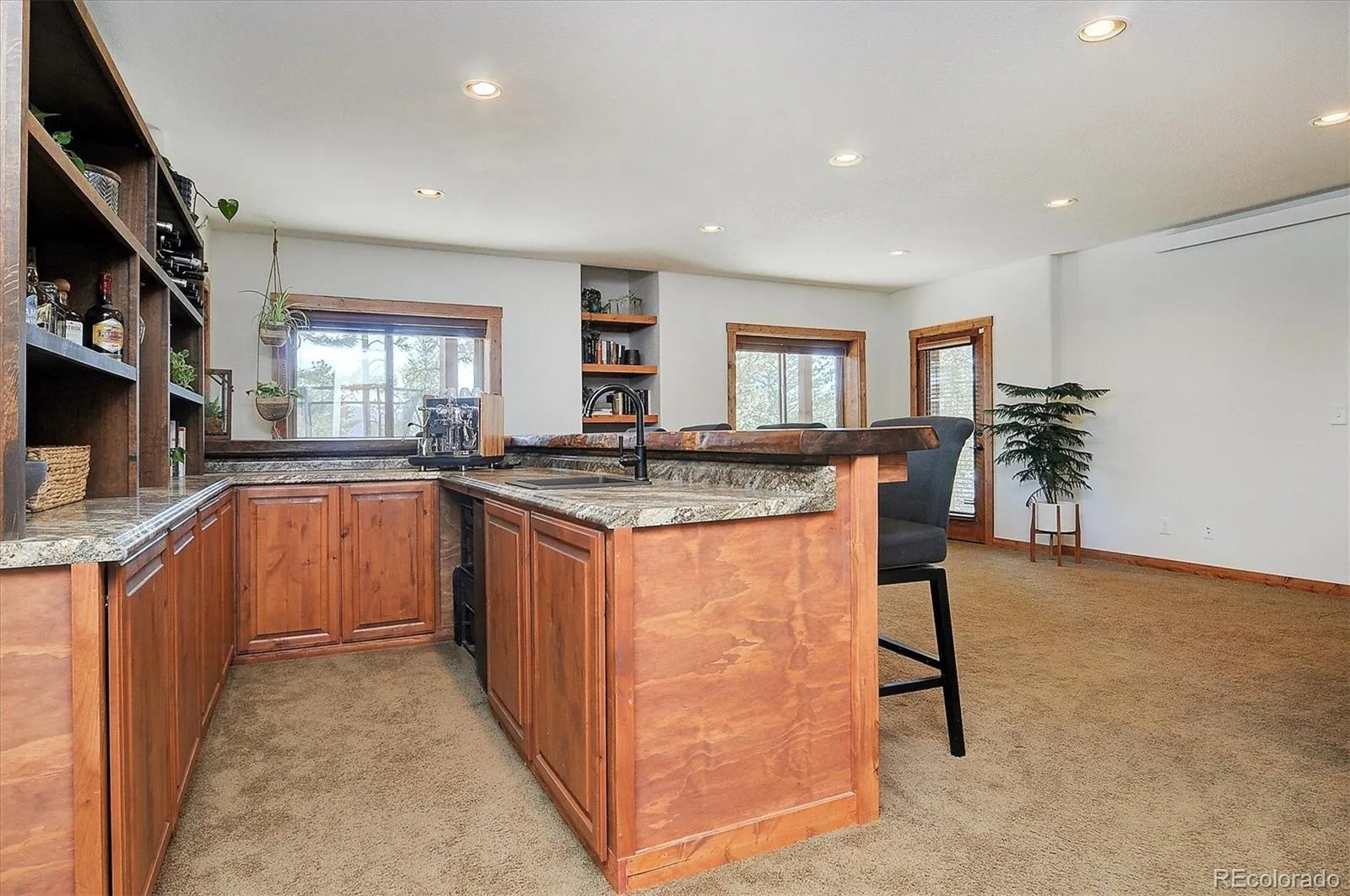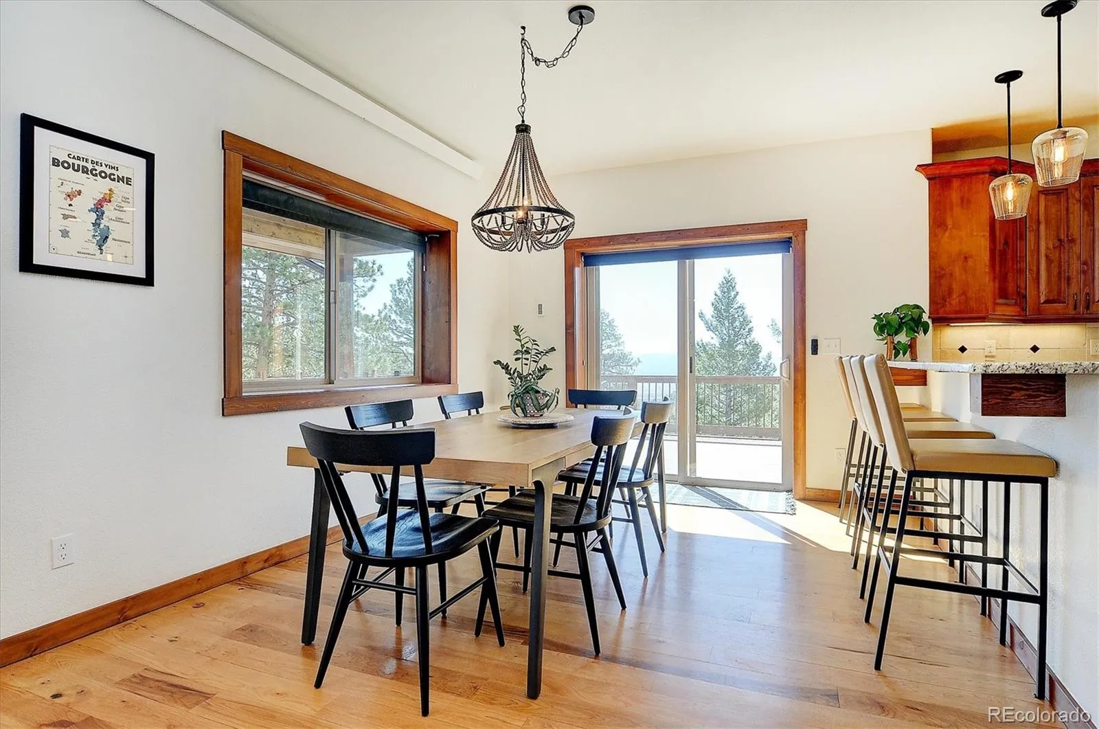 Step inside to a warm, modern rustic interior with hickory floors and alder cabinetry. A soaring 20-foot stone fireplace brings natural charm to the living room, which opens seamlessly into the kitchen and dining areas, where large windows flood the space with light. The chef’s kitchen features granite countertops, custom cabinetry, and KitchenAid appliances that make meal prep both functional and beautiful.