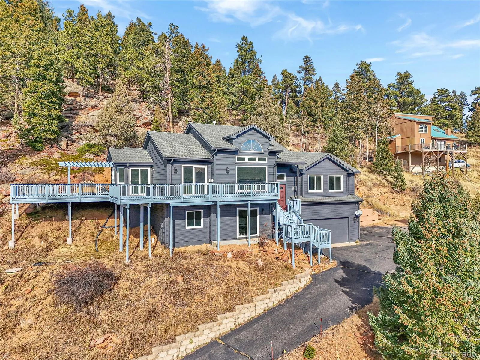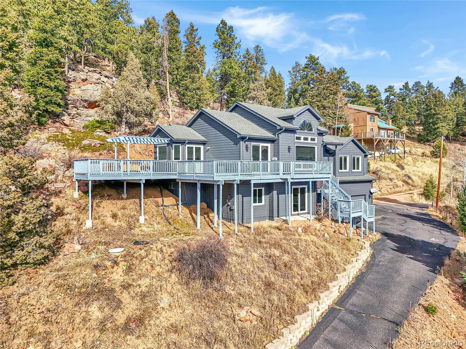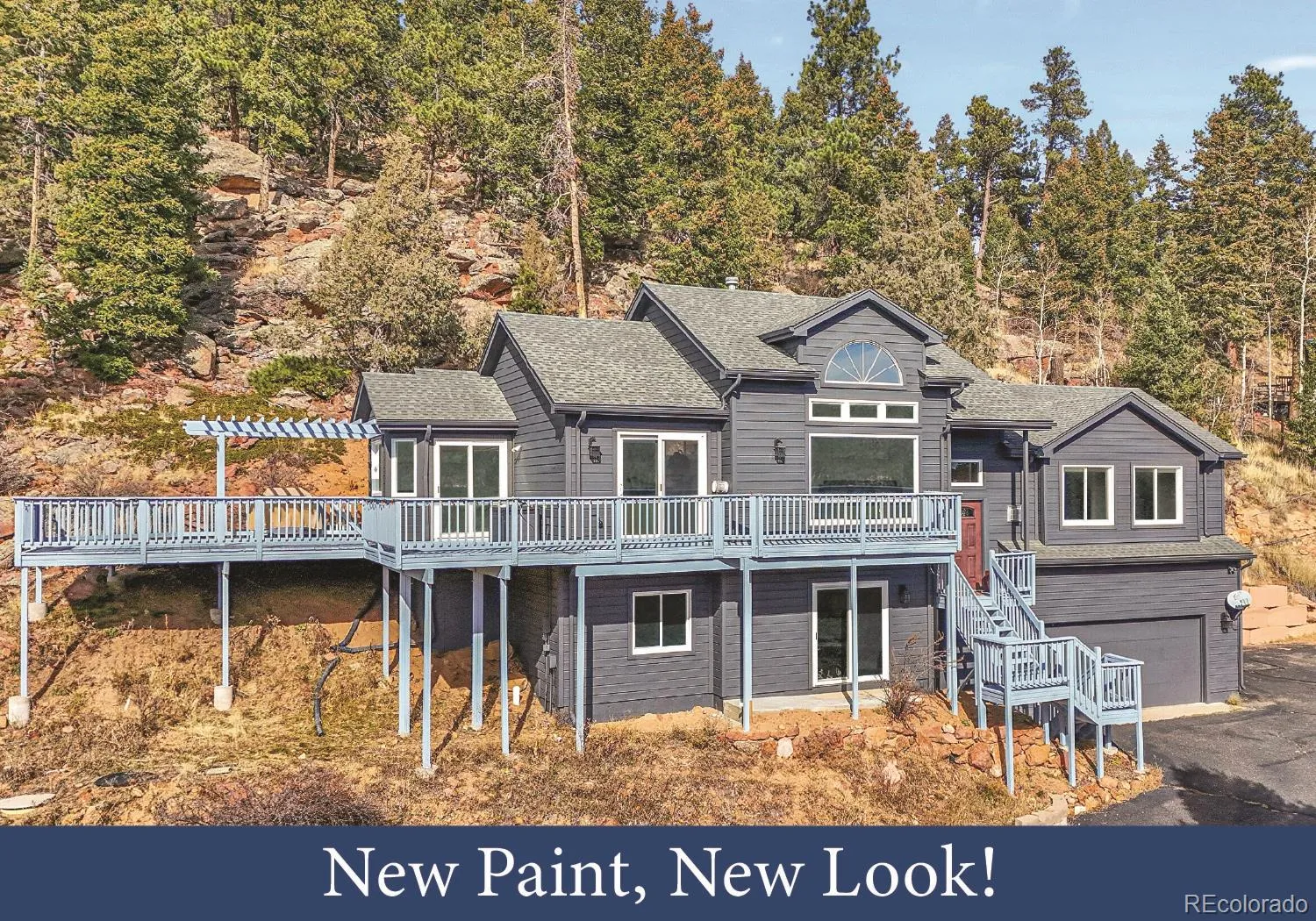 Seller is offering at 15,000 concession in addition to this price improvement! Explore this beautiful Evergreen home via video & 3D tour at www.33633ElkRun.com. (Note that the home is now painted gray!) Mountain views from every window, a spacious deck & modern upgrades make this your perfect Colorado escape. This move-in ready home is perfect for nature lovers and remote workers, as it blends privacy and beauty with modern comfort. Inside, you’ll find bright, open main-level living with beautiful bamboo flooring & a large view window to take in the sweeping scenery. The main level also offers an oversized primary suite w/ fireplace & luxurious spa-inspired bathroom with steam shower & walk-in closet. The newly updated modern kitchen features quartz countertops, brand-new appliances, large pantry closet, breakfast nook & bar seating. Step out onto the expansive deck, where there’s ample space for lounging, dining, & soaking in the beauty of outdoor living. A second ensuite bedroom w/ walk-in closet & double doors can serve beautifully as a home office. Downstairs, the bright walk-out lower level features a media/family room with exterior access, & a flex space/3rd bedroom with generous closet. A bathroom & large utility/storage room complete this level. The paved driveway has southern exposure that melts snow quickly & parking is abundant with an oversized 2 car garage & parking spaces outside. The home is exquisitely cared for and move-in ready with new furnace, newer high efficiency windows, high-end window shades throughout, new appliances, and more. High speed internet means working at home is effortless, & there are county maintained paved roads all the way to Golden (35 min) & metro Denver for easy commuting in both summer & winter. This is Colorado living at its best with miles of trails at Maxwell Falls & National Forest, all just 6 min away, only 13 min to amenities in Evergreen, & a little over an hour to DIA. Welcome to your mountain oasis!