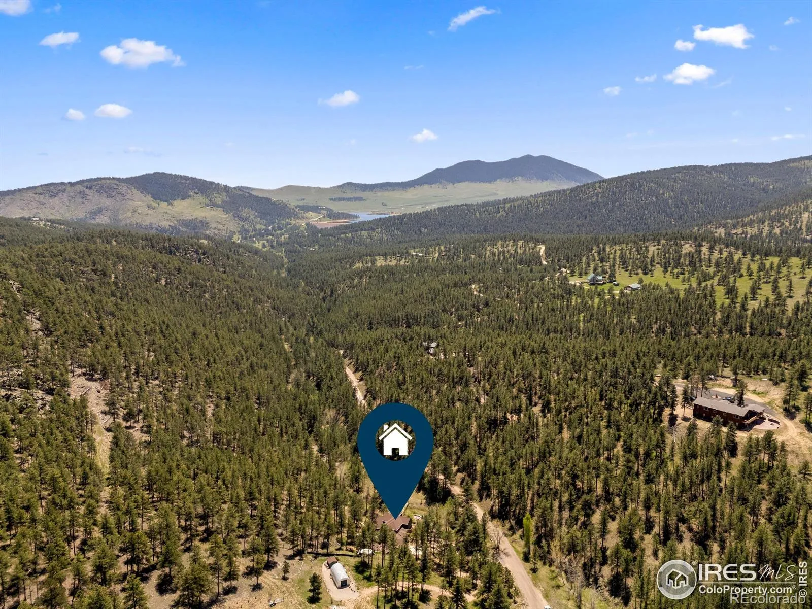 Remarkable custom-built residence nestled on almost 38 acres & within a 450-acre private wildlife conservation easement, offering an extraordinary blend of luxury & natural beauty. The heart of this home features a stunning 2-story great room with a wood stove, adorned with tongue and groove ceiling, creating an impressive architectural statement. The gourmet kitchen showcases high-end appliances & opens to the great room filled with abundant natural light streaming through large windows bringing the forest right into the living room. The spacious primary bedroom suite provides a private balcony retreat, complemented by a luxurious bathroom featuring a walk-in shower, 6-foot soaking tub & water feature. A versatile loft space off the primary bathroom serves perfectly as an office or additional living area. Outdoor living reaches new heights with a wraparound deck, complete with a step-in hot tub surrounded by a serene waterfall & koi pond. There is lovely outdoor space with a separate driveway that can easily accommodate a horse barn, while a charming bridge crosses a seasonal stream, adding to the property’s enchanting atmosphere. Additional upgrades include: new boiler heating system, brand new carpet, some new interior paint, a 12 x 16 shed, custom closets, in-floor radiant heat, RV dump station, storage above the garage attic, & an almost 1200sf garage which could fit up to 4 vehicles & all your toys. The home’s thoughtful design includes 3 bedrooms, 3 bathrooms, with the option to create a 4th bedroom in the upper floor loft/exercise room. Located near Ramsay-Shockey Open Space & just 20 minutes to the city of Loveland, this property presents possibilities for hosting weddings and events. With only a road association HOA, this sanctuary combines privacy with accessibility, offering a truly distinctive Colorado living experience. Property has been pre-inspected and is in top-notch shape! Recent hail storm in July 2025- Seller will replace roof prior to closing.