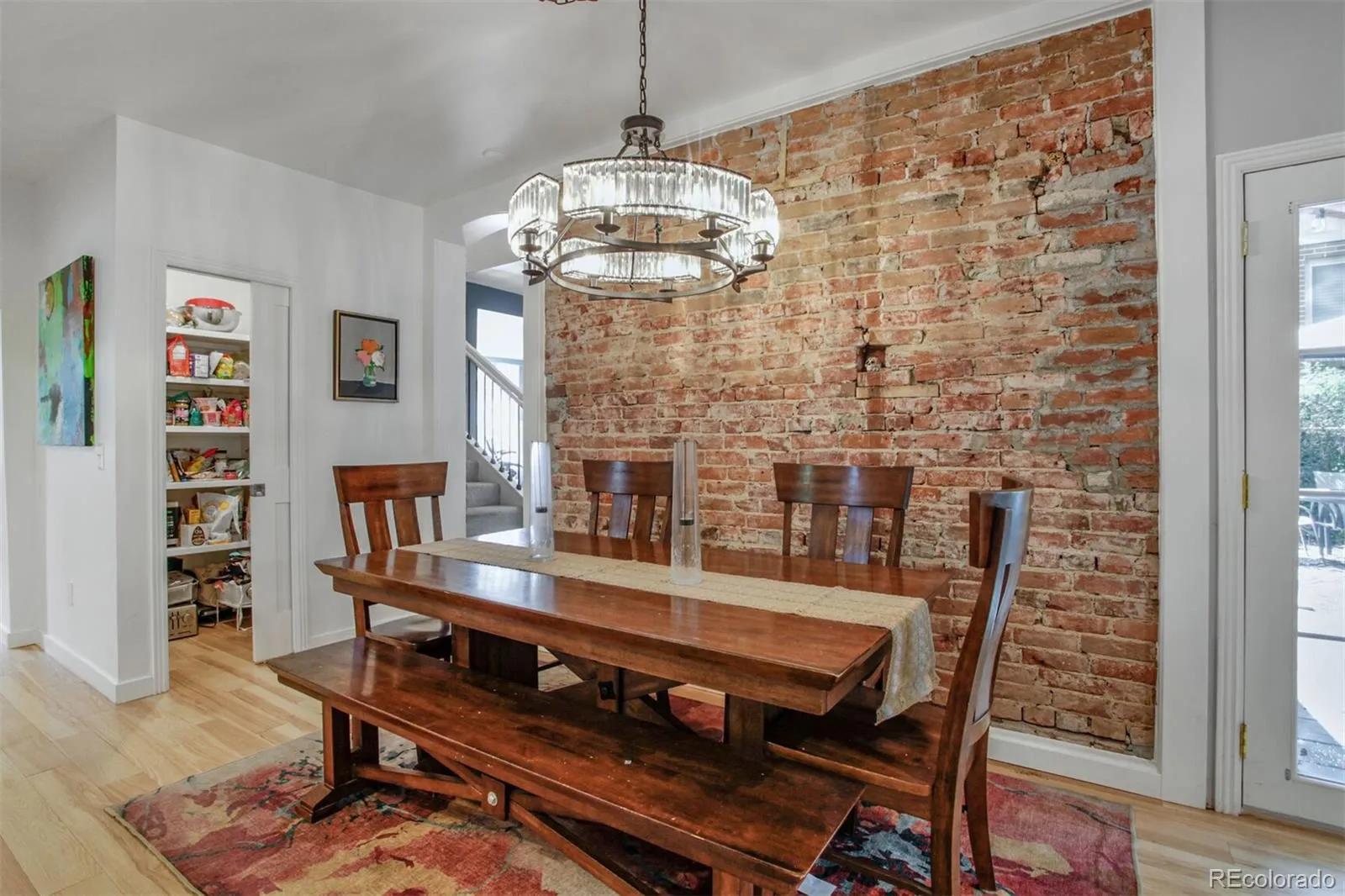 The open floor plan flows effortlessly from the large living room into a charming dining space with exposed brick and French doors that open to a private courtyard — ideal for indoor-outdoor entertaining.