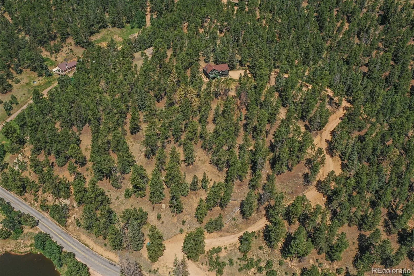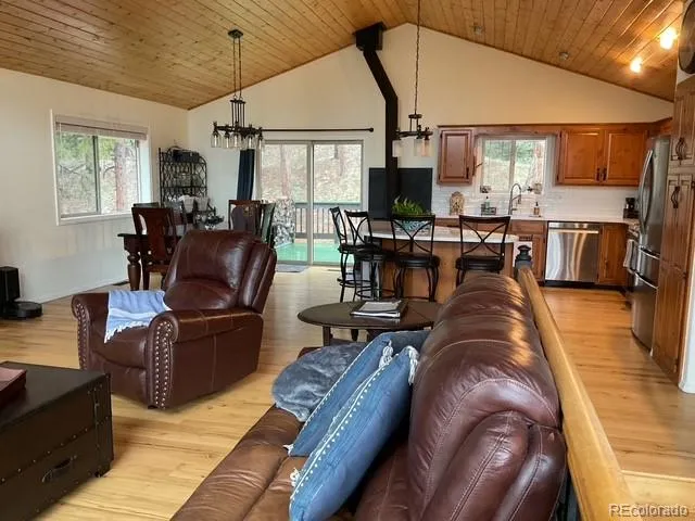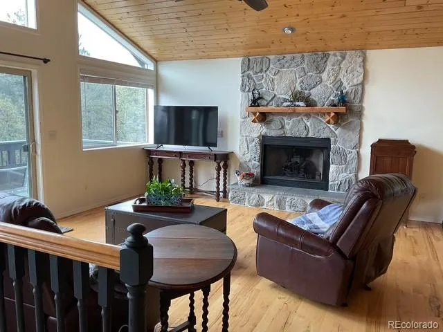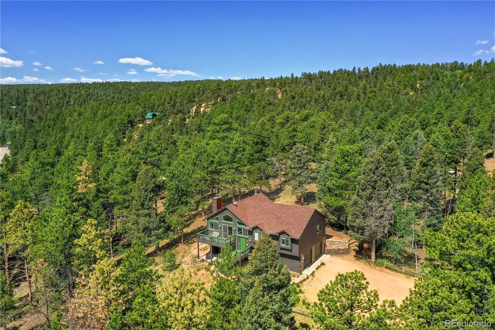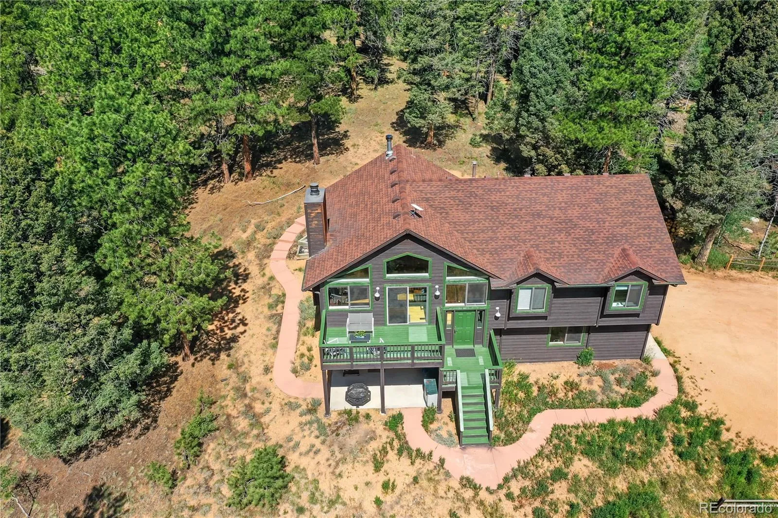 Charming Updated Bi-Level Home on 5+ Acres Near Woodland Park; If you’re in the market for a beautifully maintained,open-concept home just minutes from Woodland Park, your search ends here; this inviting property seamlessly blends modern upgrades with cozy mountain charm; From the moment you arrive, the freshly painted exterior and decks welcome you with style and curb appeal. These outdoor spaces are perfect for relaxing with a morning coffee or entertaining guestsamidst the natural surroundings; Inside, you’ll be greeted by gleaming hardwood floors and an abundance of natural light streaming through large windows; The spacious open layout is enhanced by recessed lighting and ceiling fans throughout,offering comfort and energy efficiency year-round; The heart of the home—the kitchen—has been thoughtfully updated withnew stainless-steel appliances, including a Frigidaire refrigerator, LG stove and microwave, Samsung dishwasher, and a Glacier Bay sink. A central island with a breakfast bar offers the perfect spot for casual meals and conversation; The livingroom features a stunning stone-faced wood-burning fireplace and a Hearthstone Radiant wood stove, adding both warmth and rustic elegance; The main level primary suite boasts a private bath and a walk-in closet, while two additional bedroomsoffer brand-new carpet, track lighting, and ample space for family or guests; A full guest bathroom features slate tile flooring and a granite countertop; Downstairs, enjoy a massive media room—ideal for movie nights, game days, or extraguest space; The lower level also includes a dedicated laundry area with pantry storage and convenient access to the two-car attached garage; There’s even an RV turnaround for added flexibility in the drive cutout; Additionally property has been fire midigated, USB outlets, and a blend of stylish fixtures and upgrades throughout; Don’t miss the opportunity to make it yours!