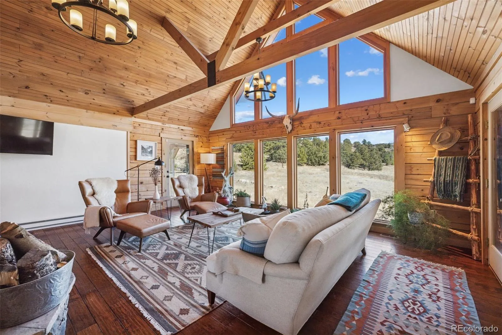 Modern Log Home on 35 Acres with Unmatched Views & Privacy. Nestled within a gated mountain subdivision, this modern log home offers the perfect blend of rustic charm and contemporary comfort—all set on an expansive 35-acre lot with panoramic views of forested mountain peaks and Colorado’s famously blue skies. With private access to thousands of acres of public BLM land, outdoor adventure is just steps away. Crafted with high-quality D-log construction, this home retains classic log cabin appeal while delivering the energy efficiency of modern design. Step inside to a warm, inviting living room with a soaring vaulted ceiling, cozy fireplace, and massive windows that frame awe-inspiring mountain views. The custom kitchen boasts granite countertops, stainless steel sink and appliances, and a spacious walk-in pantry/laundry room. The large primary bedroom suite is a true retreat, complete with a fully remodeled spa-like bathroom featuring a marble double vanity, a luxurious travertine tile shower, heated floors, and a heated towel rack. Guests will enjoy the comfort of the second bedroom with easy access to the beautifully updated main hall bathroom—also finished with travertine tile and marble accents. Recent upgrades include a gas forced air furnace, Cellphone booster, new ceiling fans, window blinds and a whole-house backup generator—ensuring comfort and peace of mind year-round. Step outside to enjoy over 430 sq ft of covered decking, plus an 8×24 rear deck with a motorized awning ideal for morning coffee or evening stargazing. Relax as you listen to wild turkeys in the spring and elk bugling in the fall, right from your deck. The property also features a 24×30 detached garage. Located just minutes from Cañon City and only 1.5 hours from Monarch and Breckenridge ski resorts. The ideal balance of seclusion, convenience, and year-round adventure.