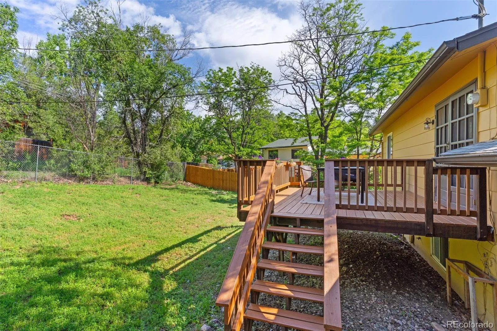 The main level features a bright living room, a spacious primary suite, a full bath, and a second bedroom. The standout kitchen boasts striking green cabinetry, granite countertops, updated appliances, and space for a dining table. Direct access from the kitchen to the deck and large fenced backyard makes entertaining and outdoor living a breeze.