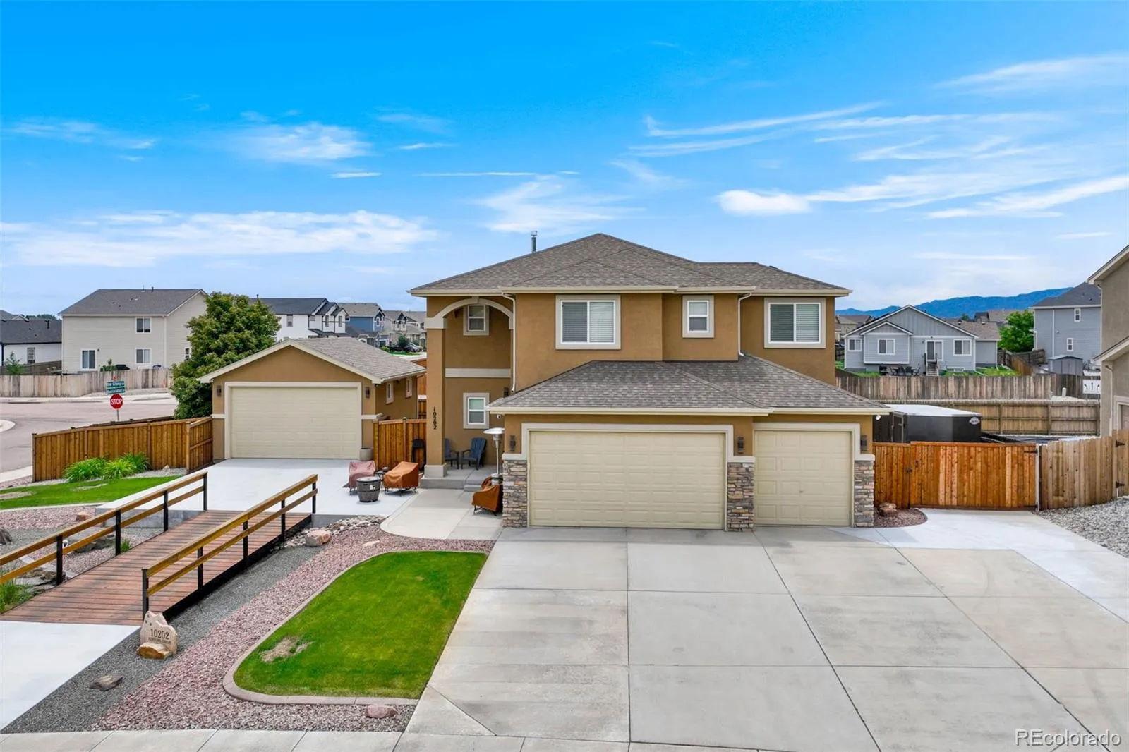Enjoy the rare benefit of a 6-car garage, complete with secured RV parking and a beautifully designed bridge-style entrance that connects to the second garage—ideal for extra vehicles, storage, or hobby space with a flair of architectural charm.
