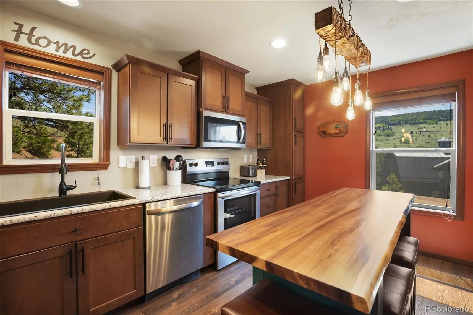 Inside, the open main level showcases the views at every turn. A cozy fireplace anchors the living room, while the gourmet kitchen features custom cabinetry, granite countertops, a butcher block island, and plenty of space to cook, dine, and gather. The main level also includes a spacious primary suite with attached bath, a second bedroom, and a dedicated office.