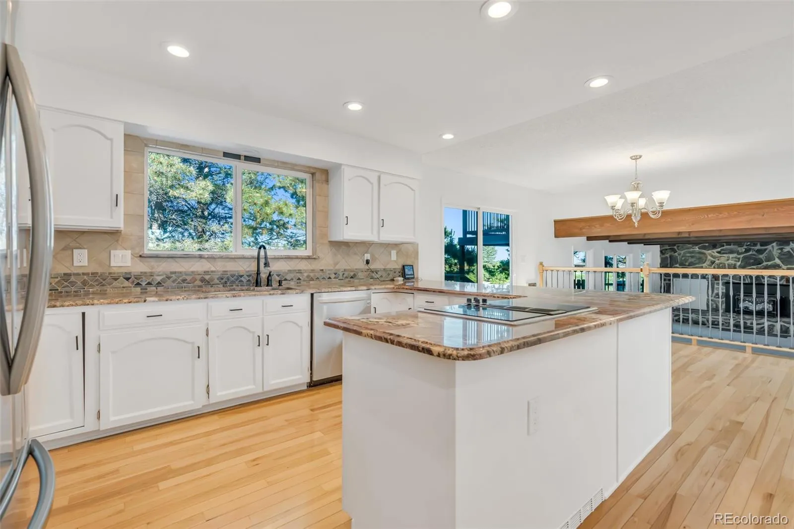 Inside, vaulted pine ceilings, an inviting brick fireplace, and expansive windows create a warm, mountain-retreat feel. The updated kitchen blends rustic charm with modern design, featuring crisp white cabinetry, concrete countertops, stainless appliances, and an open flow to the dining area for effortless entertaining.