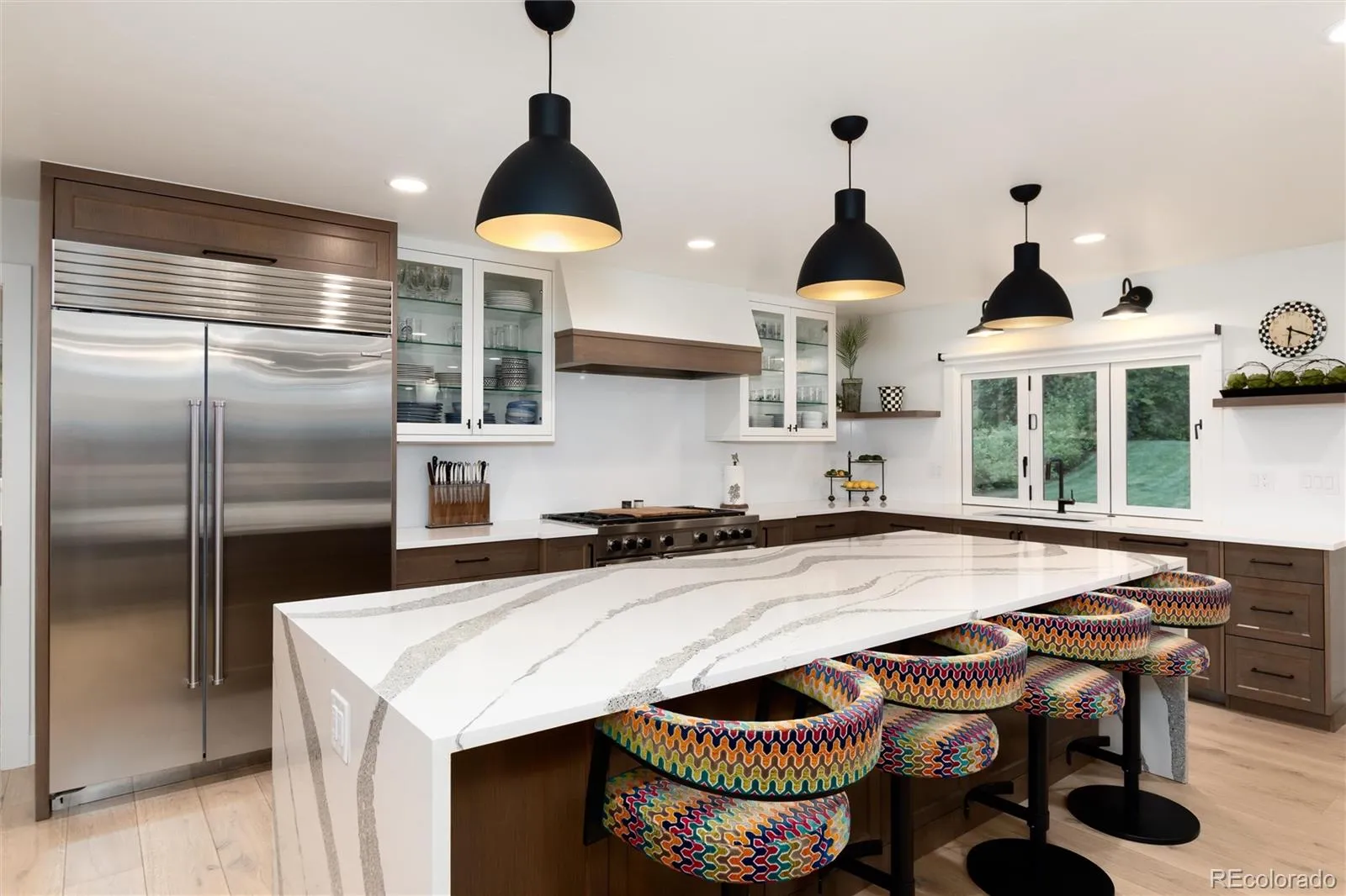 Welcome to One Club Lane in Columbine Valley, a 5 bd/6ba home combining modern design w/ sophisticated functionality. Each & every space throughout the home has been thoughtfully renovated & updated by the homeowner. Enter the home & you will find an open floor plan perfect for entertaining friends & family. The heart of the home is the chef inspired kitchen featuring high-end appliances (Wolf & Sub-Zero), a huge waterfall quartz island (w/ extra storage on the stool side of the island) & serving window opening to back patio. In the butler’s pantry/prep kitchen you will find a 2nd dishwasher, 3rd oven, microwave, coffee bar & addl storage. Main living space w/ great room & dining room, both w/ new gas fireplaces are perfect spaces to relax & unwind. Primary suite features views of the backyard & access to back patio area, a 5 piece bath & large dressing room w/ built-in closet system. 3 beds (one currently being used as office) all w/ en-suite baths complete the main level. Basement features addl living space for entertaining, play or working out, a large bedroom w/ 2 egress windows & 3/4 bath. You can bring the outside in under your metal louvered pergola from Struxure Pergola w/ 4 high quality remote control shades, 2 heaters a gas firepit & 2 ceiling fans. Walk through the freshly landscaped & private backyard & across a private footbridge to access CCC’s par 3 course. New Anderson windows, skylights & plantation shutters throughout, completely renovated 3 car garage w/ epoxy floors, insulation, custom cabinets, heaters, sink & new garage doors w/ side mounted silent motors. Resort-style living & personal golf cart access to acclaimed Columbine Country Club (18-hole championship course & 9-hole par 3), tennis & pickleball, pool & new $23+ million-dollar clubhouse (2018) & wellness center. 20 min. to downtown Denver, 5 min. to old Littleton & light rail, easy access to CO mountains & situated near Platte River Trail System w/ miles of paved biking & walking paths.