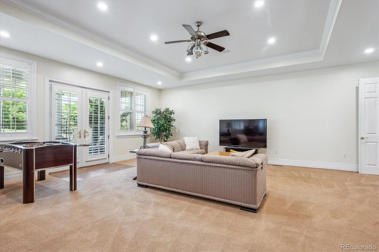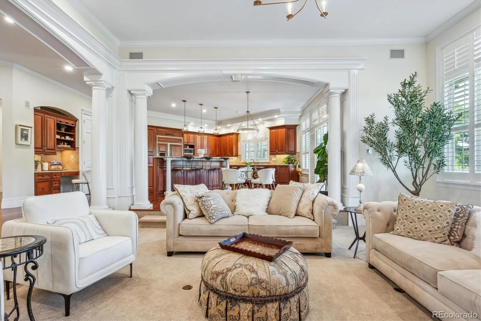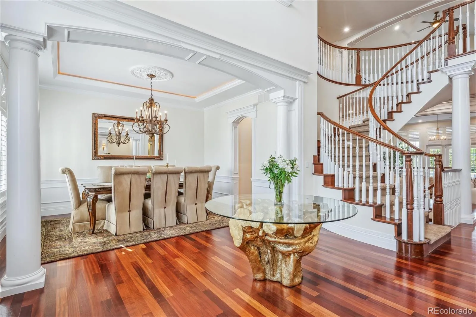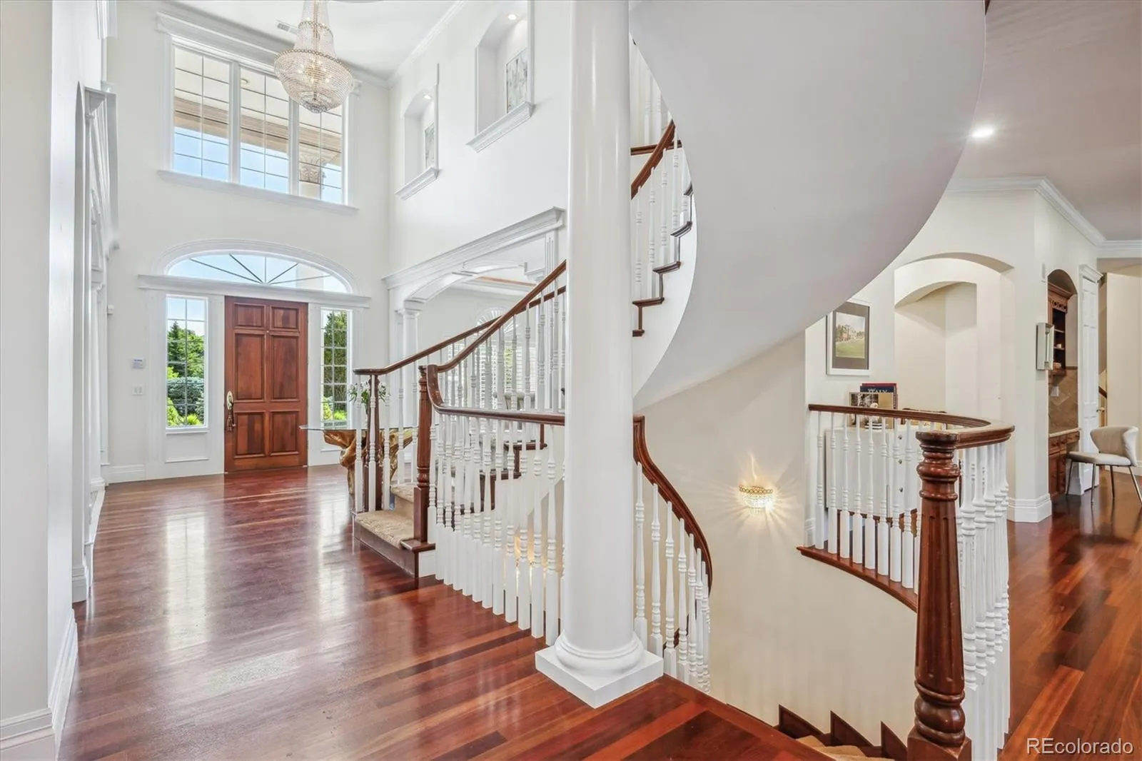Welcome to an exceptional Georgian Colonial custom estate nestled in the prestigious community of Castle Pines, situated on a beautifully landscaped 1.5-acre lot with sweeping mountain views and breathtaking sunsets. Tucked away in one of the most private and serene settings within The Estates at Hidden Pointe, this remarkable 12,000 sq ft residence combines timeless elegance with thoughtful luxury. This grand home offers 8 bedrooms, 9 bathrooms, an indoor basketball court, a main floor primary suite, a main floor guest suite, an art studio, exercise room, movie theatre, wine grotto, two full kitchens, two laundry rooms, 2 garages providing 4+ spaces, hot tub, in ground trampoline, and over 2,000 sq ft of outdoor deck & patio space-perfect for year round entertaining & relaxation. Upon entry, you’re welcomed by a dramatic foyer with soaring 19-foot ceilings, a dazzling crystal chandelier, and an architecturally striking curved staircase. Rich Brazilian cherrywood floors, classic pillars, and gleaming brass accents showcase the homes refined character and craftsmanship. Designed for both grandeur and comfort, the main level includes a tranquil primary suite that offers a true retreat experience, complete with spa-like amenities and outdoor access. The gourmet kitchen and expansive great room open seamlessly onto the deck where you’ll enjoy unobstructed views and the perfect space for al fresco gatherings. Upstairs, five generously sized bedrooms each feature custom walk-in closets, while a spacious bonus/media room creates a flexible area for family enjoyment. The walk-out lower level is an entertainer’s dream, featuring an impressive array of recreational and living spaces thoughtfully curated for comfort, function, and fun-including the private indoor basketball court, a true standout feature. This extraordinary residence must be seen in person to fully appreciate its scale, versatility, and design. Please see Private remarks for all the recent improvements.