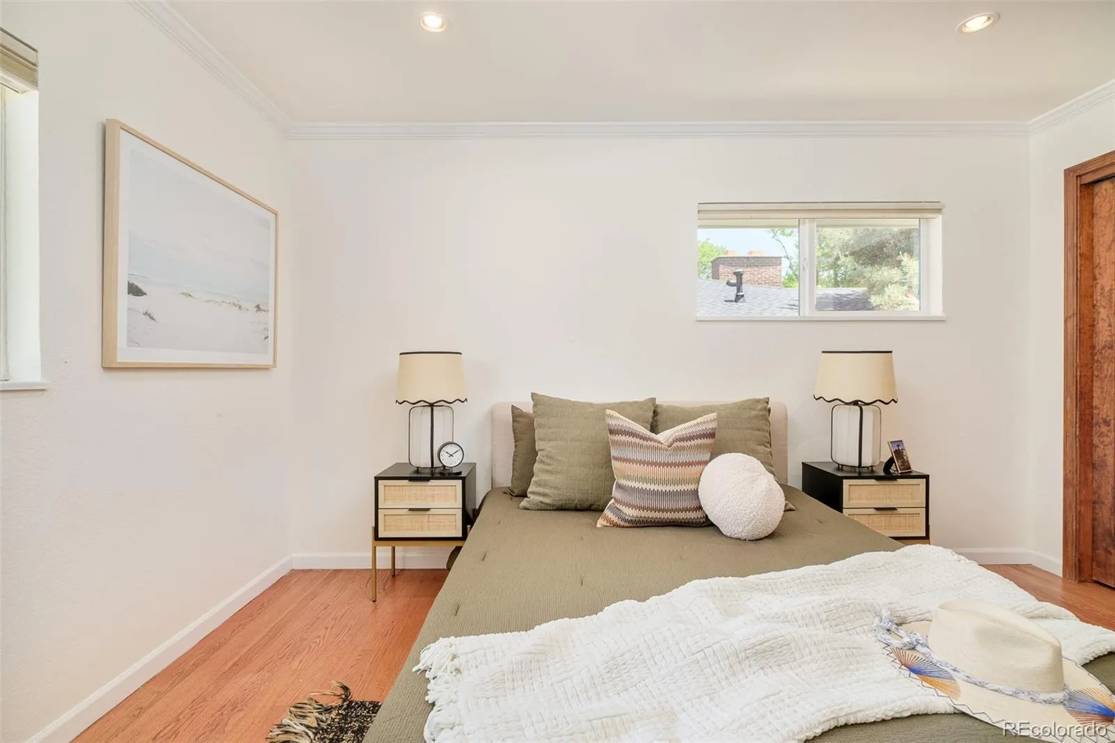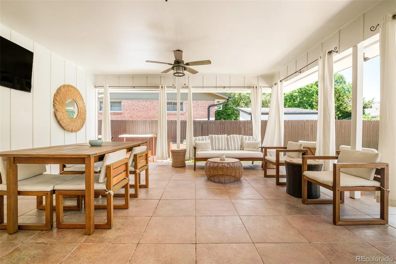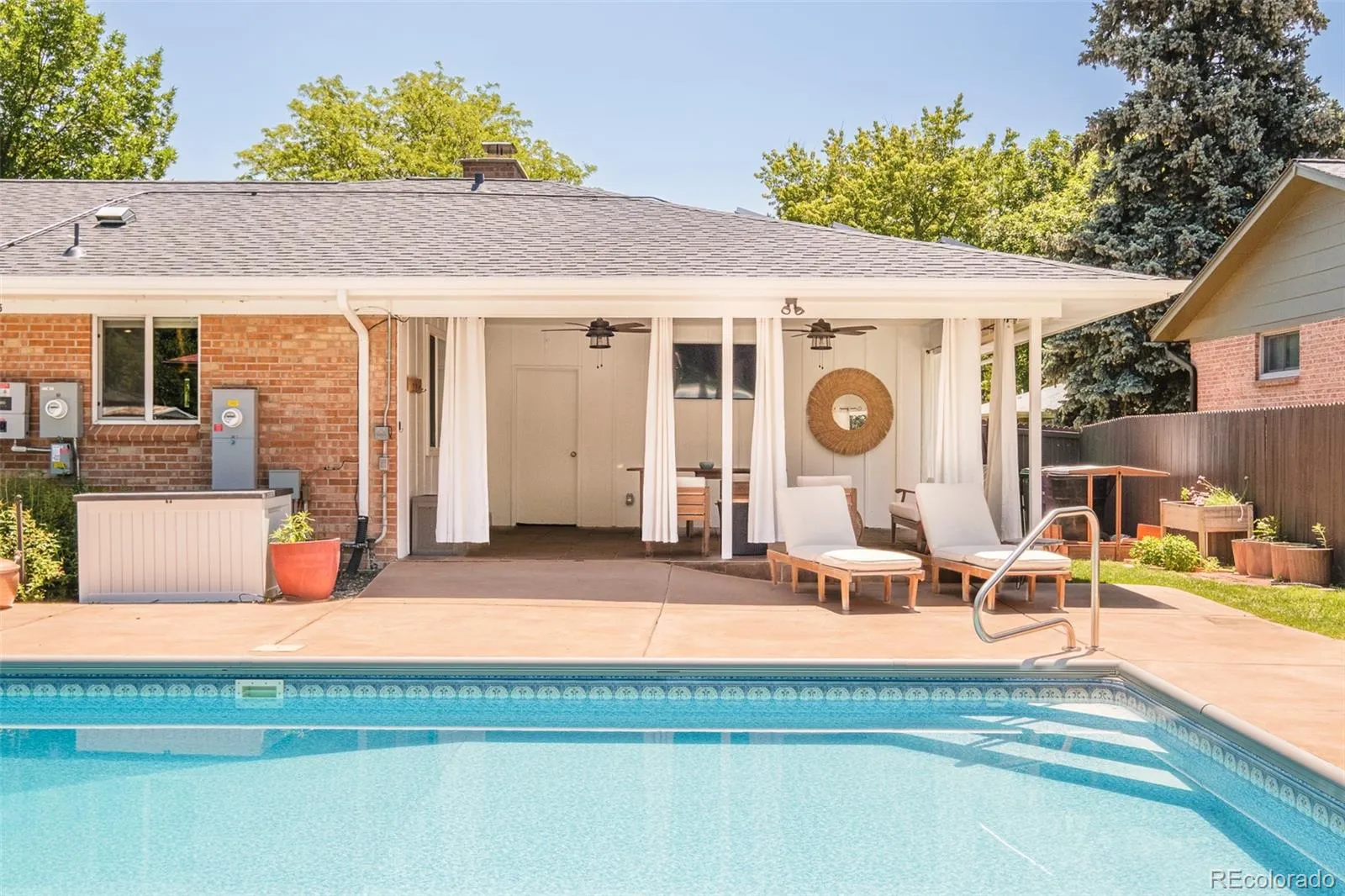 Beautifully updated, this move-in ready brick home boasts a beautiful backyard oasis with a swimming pool. Situated on a quiet cul-de-sac in Hutchinson Hills, a welcoming exterior draws residents into an open layout flowing with hardwood flooring. Grounded by a fireplace, the living area opens into a gourmet kitchen featuring 42-inch cabinetry, quartz countertops, new gas cooktop and an elegant dining area. Escape outdoors to an expansive covered patio in a thoughtfully landscaped backyard flaunting a heated pool with automatic cover, a dog run, a garden area and privacy fencing. The main-floor primary suite is complemented by a serene bathroom. Downstairs, the finished basement offers a spacious rec room, full bath, two non-conforming bedrooms one with a builtin Murphy bed and additional storage. The flexible bonus space ideal for a home salon, studio or storage. Tesla solar panels are owned by seller which promote energy efficiency. A central location offers proximity to the High Line Canal Trail, Bible Park and the Southmoor light rail station.