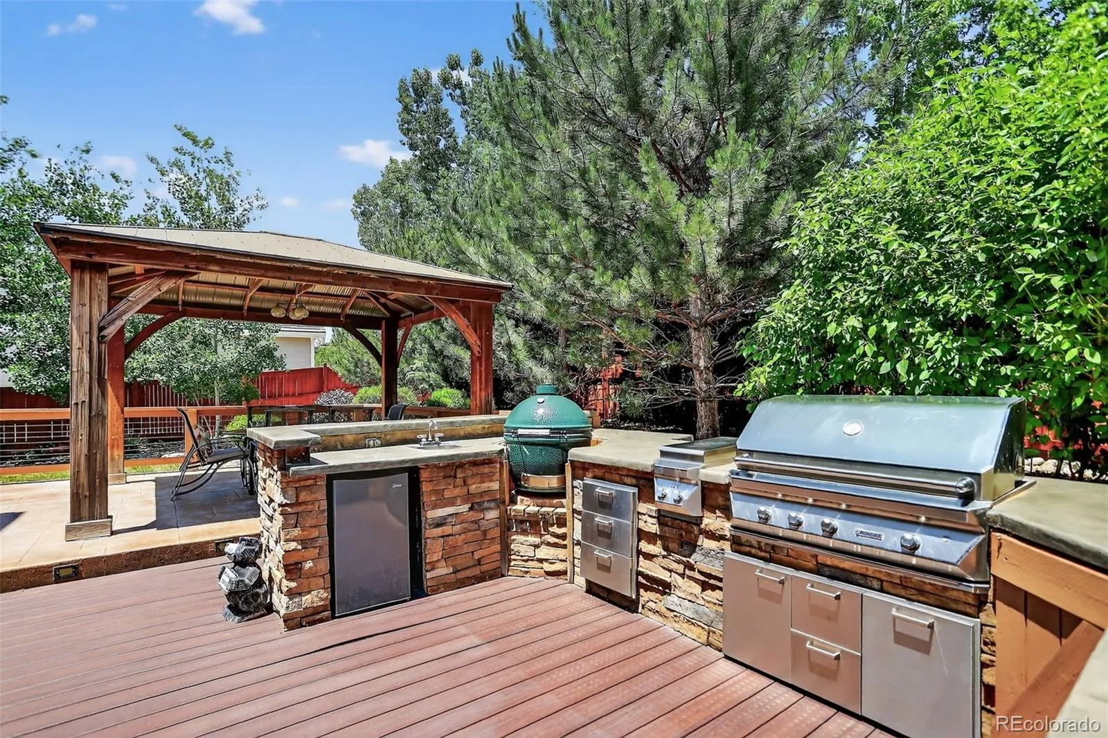 An entertainer’s dream! This backyard oasis will make you feel like you are in your own slice of paradise! The main floor boasts a beautiful kitchen with open flow to the great room with soaring ceilings and large windows, an office plus a bedroom and bathroom (perfect for guests that can’t climb stairs). Upstairs you will find convenient laundry and 4 more bedrooms including an enormous primary suite complete with 2 custom walk-in closets. The finished basement features a large living space with a kitchenette, a bedroom and a huge spa-like bathroom with a freestanding tub and walk-in shower. Perfect for guests or multi generation living. The backyard is where you will want to be, it’s incredible! With a huge outdoor kitchen, dining bar, pergola, gazebo, firepit and mature trees and landscaping providing privacy. Oversized 3 car garage, concrete roof and an ideal location close to trails and parks with easy access to shopping and dining.