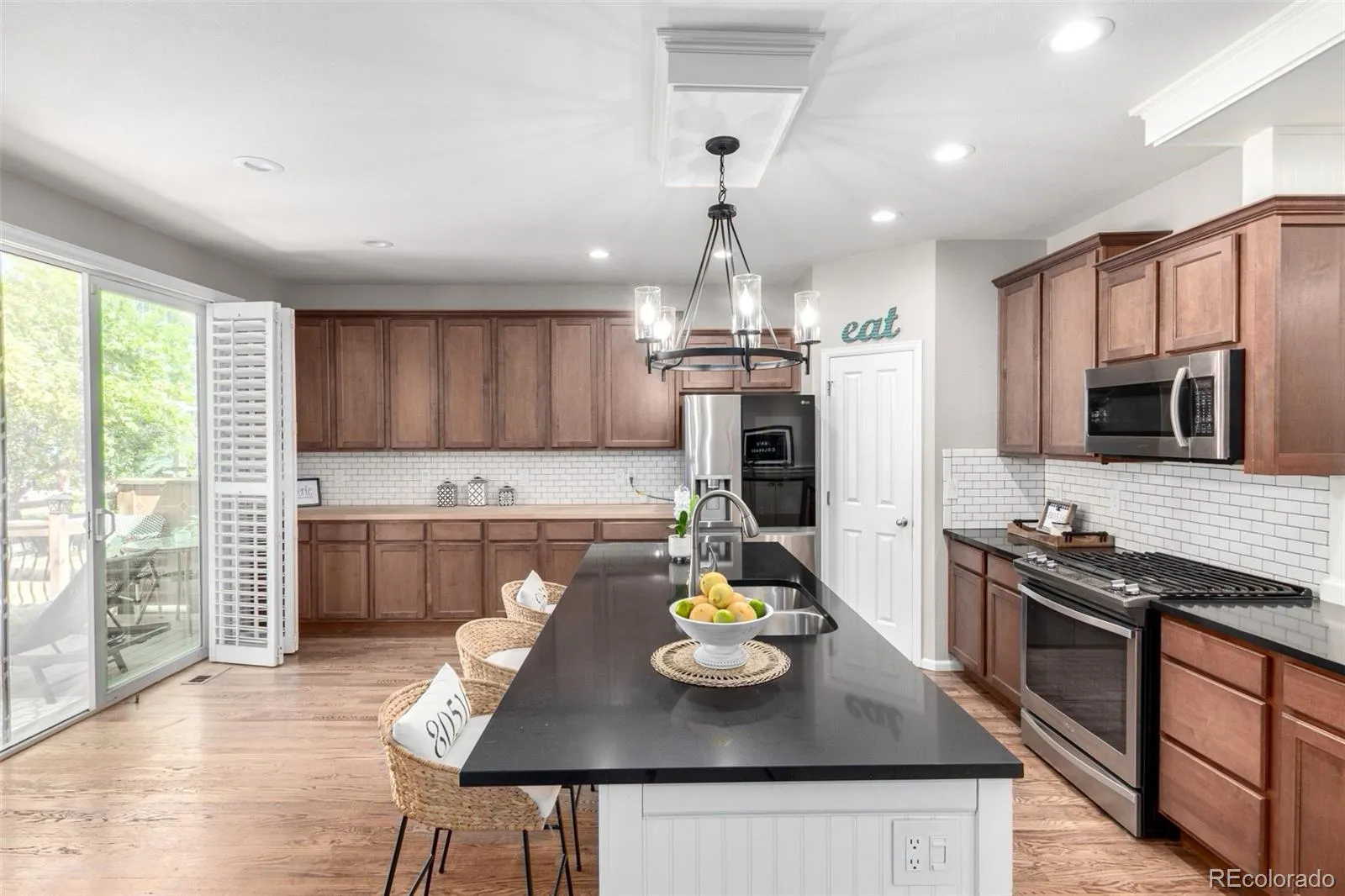 Take advantage of this incredible opportunity! This stunning 3-bedroom residence welcomes you with a 2-car garage, a manicured front lawn, and a front porch that sets an inviting atmosphere. Inside, you’re welcomed by an office space, perfect for increasing productivity in the comfort of your home. The formal dining room is ideal for hosting memorable dinner gatherings. Create lasting memories in the living room, complete with high ceilings, contemporary track lighting, blinds, wood-look flooring, and a cozy fireplace. The gourmet kitchen comes with granite counters, ample wood cabinetry with crown moulding, a tile backsplash, stainless steel appliances, a pantry, and an island with a breakfast bar for casual meals. The main bedroom includes an ensuite with double sinks and a walk-in closet for an organized wardrobe. You’ll be delighted by the finished basement, featuring a family room with a wet bar, an extra bedroom, a shower, and storage space. Outside, the lovely backyard boasts a two-level deck for weekend get-togethers and plenty of mature trees for privacy and natural shade. Close to schools, Erie Rec Center & Parks, and Old Town. Don’t miss your chance to own this gem!