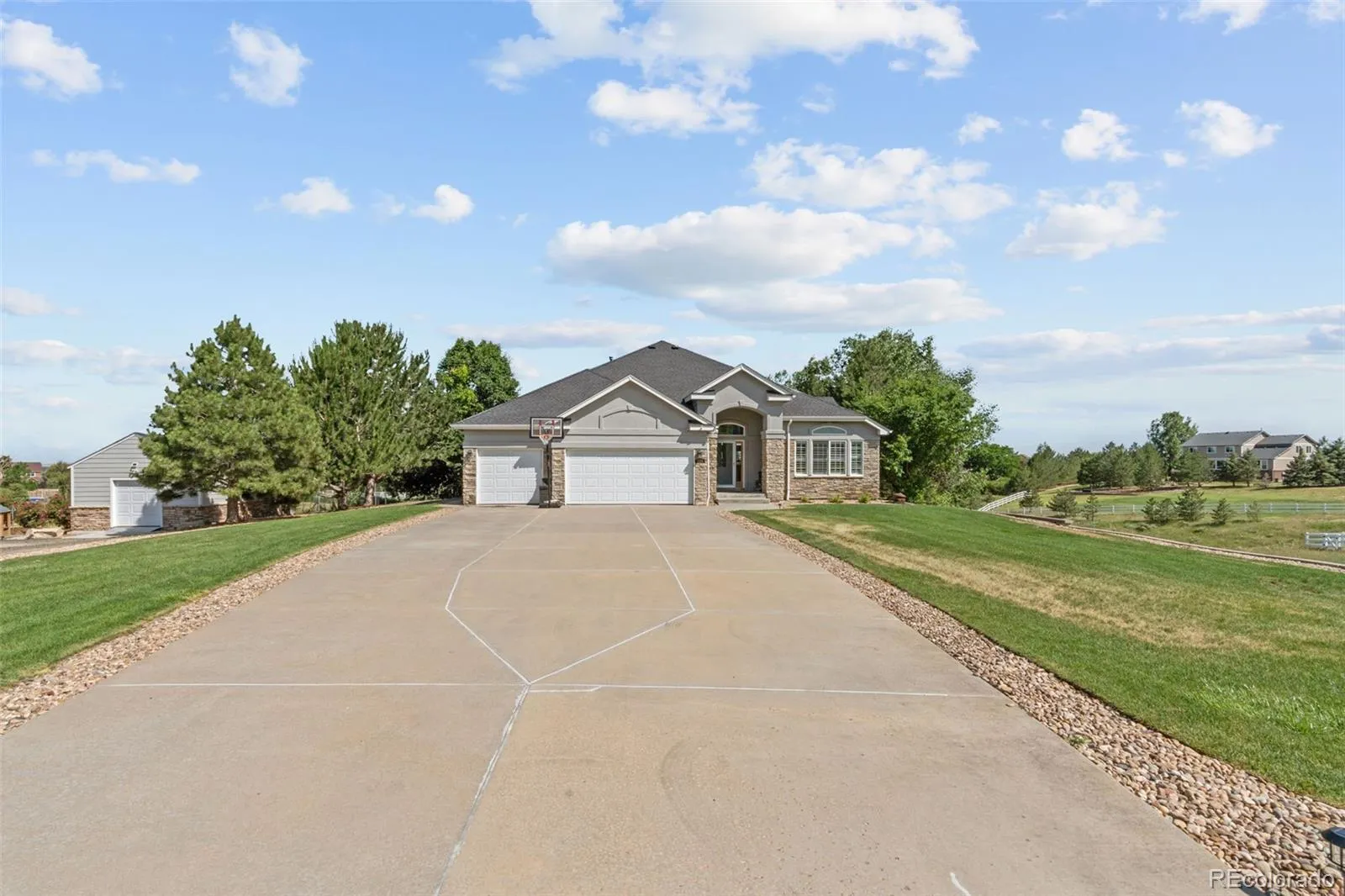 Sprawling Ranch Retreat in Gated Todd Creek Estates! Welcome to 9576 E 147th Place—an exceptional ranch-style residence nestled in the prestigious gated community of Todd Creek Estates. Situated on an expansive 1.88-acre lot with an electric fence, this beautifully updated home offers the perfect blend of luxury, comfort, and functionality across 5,304 total square feet. Boasting 4 spacious bedrooms and 5 bathrooms, this thoughtfully designed home features a bright and open layout with plantation shutters throughout the main level. A dual-sided fireplace creates a warm and inviting ambiance, connecting the cozy family room and formal living room. Entertain in style in the formal dining room, perfect for hosting holiday gatherings or elegant dinners. The remodeled kitchen offers modern finishes, ample storage, and flows effortlessly into the heart of the home. Downstairs, the finished basement is built for enjoyment—complete with an entertainment zone, full bar, workout room, and guest quarters, ideal for hosting or multi-generational living. Step outside to your private backyard oasis with a hot tub, scenic views, and plenty of space to roam. A three-car garage offers generous storage for all your needs. Located in the sought-after Todd Creek Estates gated community, you’ll enjoy the serenity of country living with easy access to shopping, dining, Denver, and DIA.