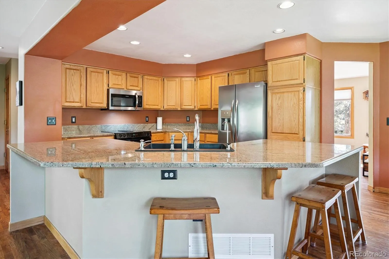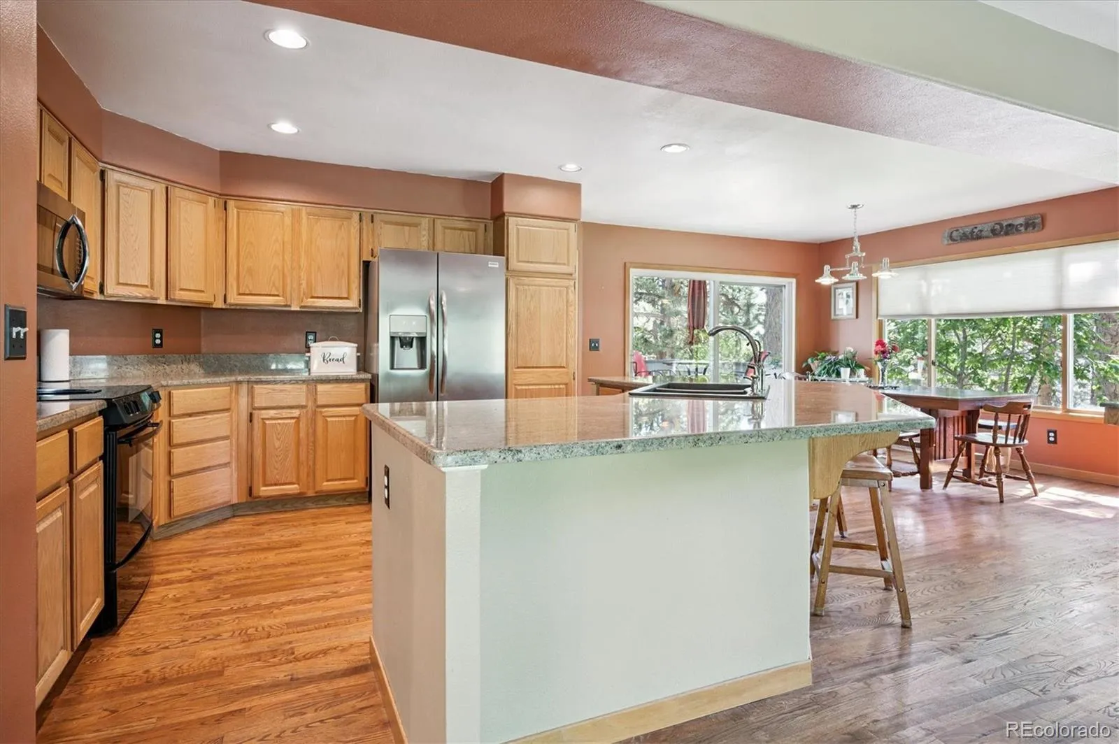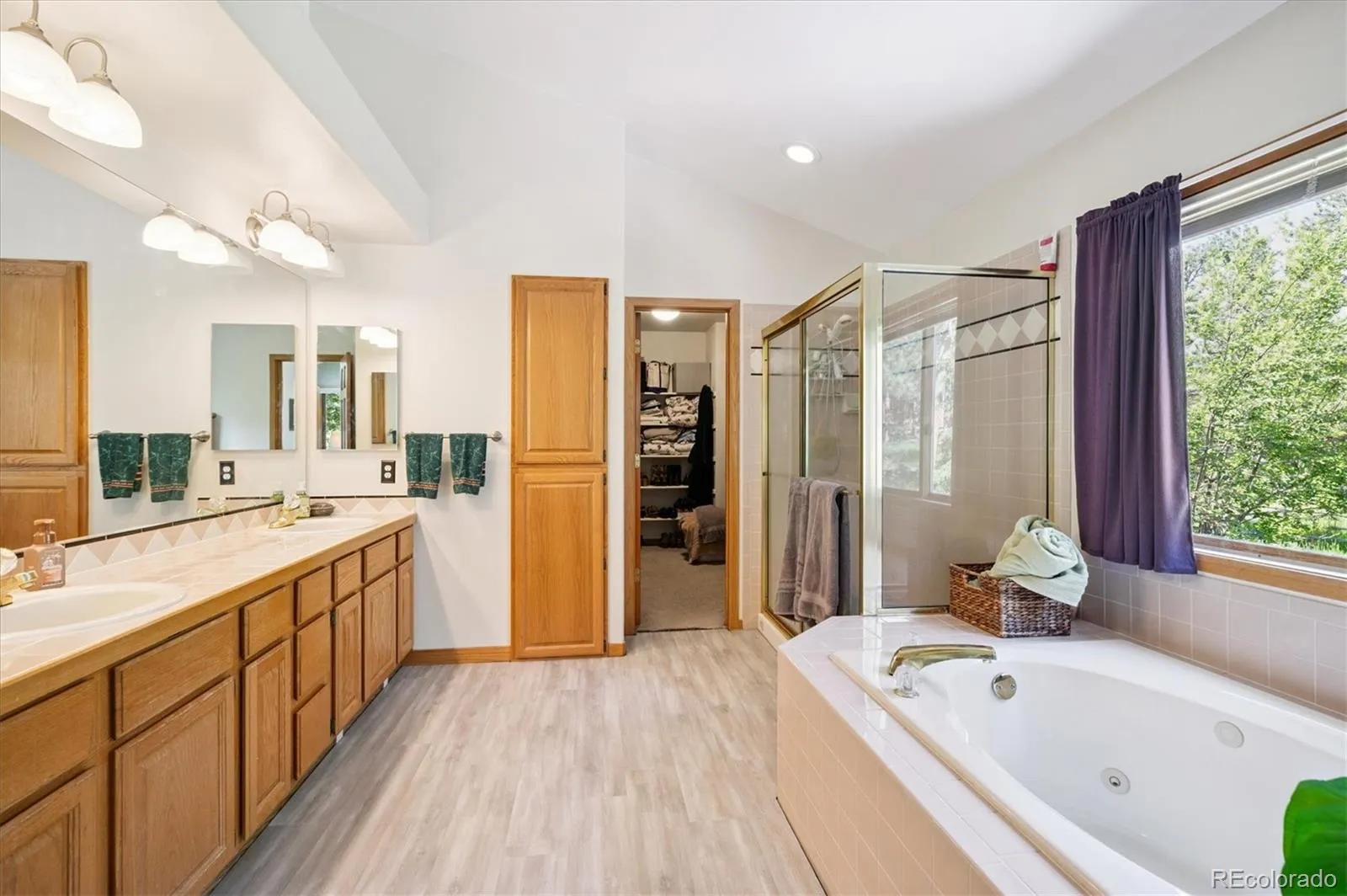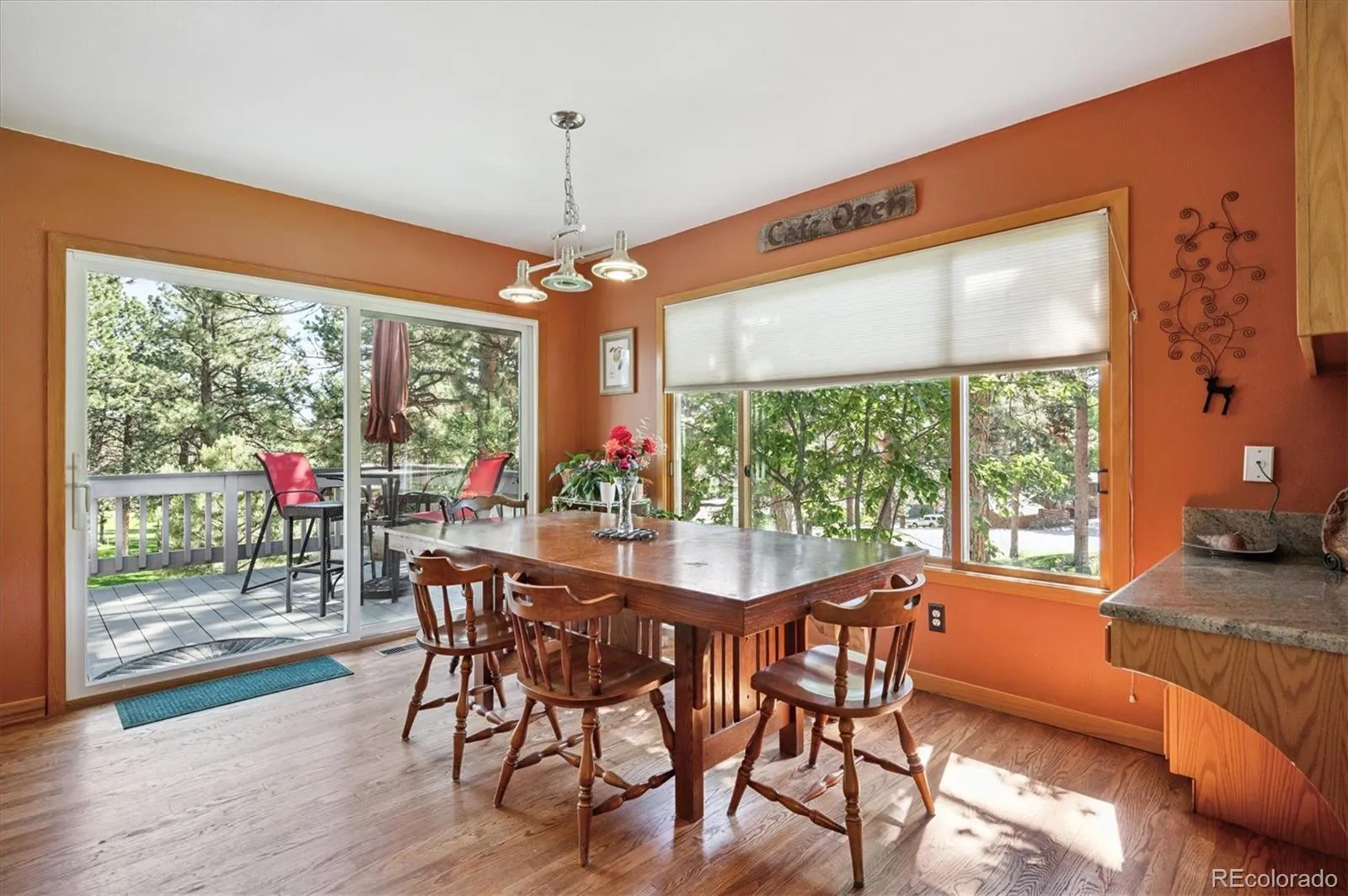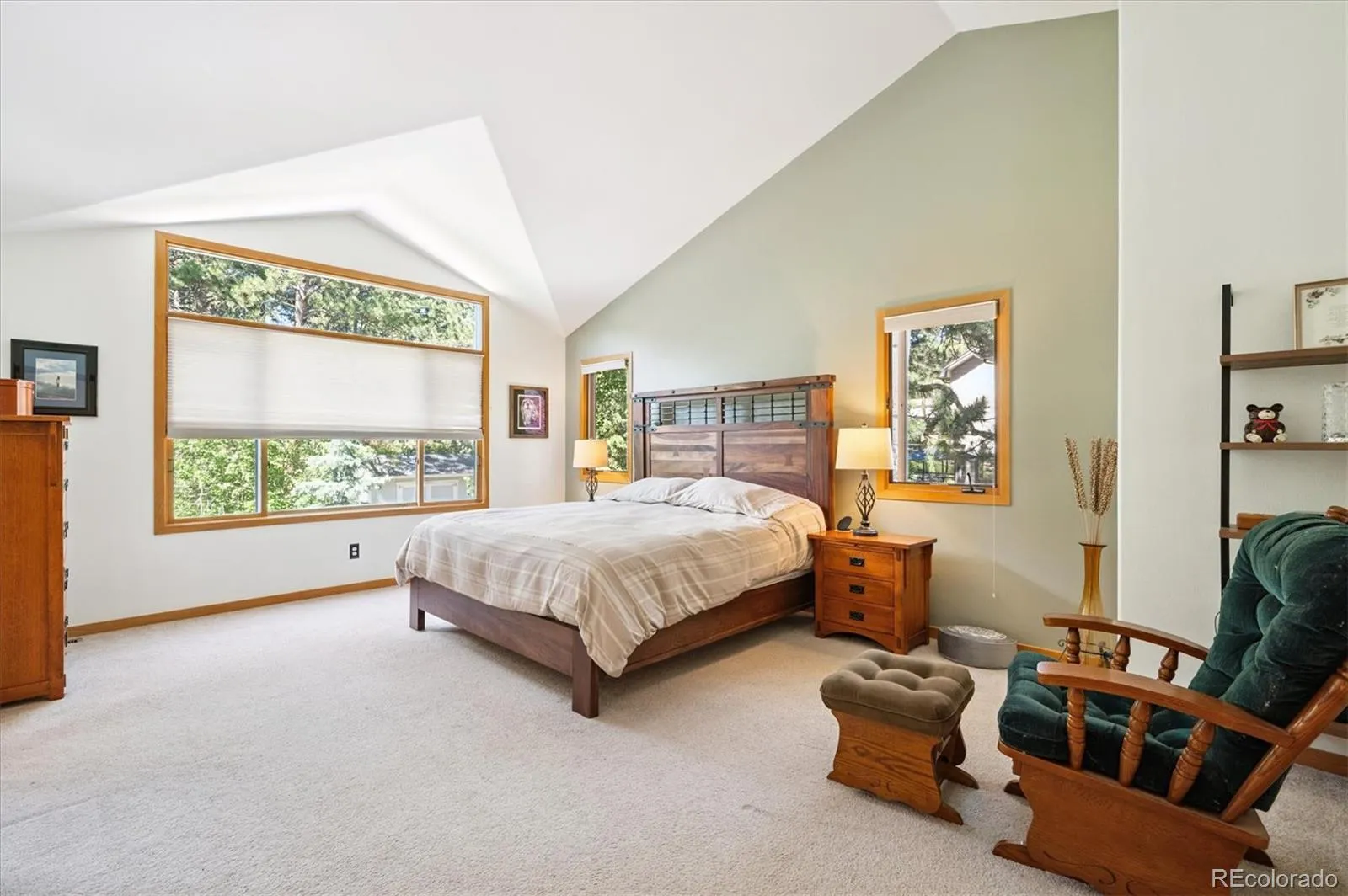 Price adjustment on this beautiful Evergreen home. Enjoy the Evergreen Experience! Welcome to Hiwan, a picturesque and well-established neighborhood nestled in the foothills of the Rocky Mountains. Known for its scenic beauty and rustic charm, Hiwan boasts architecturally distinctive homes surrounded by towering pines and winding roads. With a cul-de-sac location and well-respected schools this stunning Genesee-built home offers 3,800 square feet of finished living space where mountain serenity meets modern convenience. Ideally located near the Hiwan Golf Course, the home offers easy access to both outdoor adventures and community amenities. Ride your bike to Elk Meadow Park for exceptional mountain biking or jump on I-70—just five minutes away—for a smooth commute to DIA, downtown Denver, or world-class ski resorts. Inside, you will find vaulted ceilings, abundant natural light, hardwood floors, and two cozy gas fireplaces. The kitchen features a sunlit eat-in nook, perfect for casual meals, while the formal dining room and adjacent deck make entertaining a breeze. A main-level office offers flexibility for remote work, and the upper-level primary suite is a true retreat with a vaulted ceiling. Upstairs, the laundry room adds everyday convenience. The finished basement includes two spacious bedrooms with egress windows, a large recreation room, and a full bathroom—perfect for guests or multigenerational living. Out back, a large deck with a hot tub invites you to relax under the stars. Just off the kitchen, an additional deck provides the ideal spot for summer BBQs. Complete with a three-car garage (3rd stall for that golf cart) and a coveted storage shed, this home is mountain living at its finest.