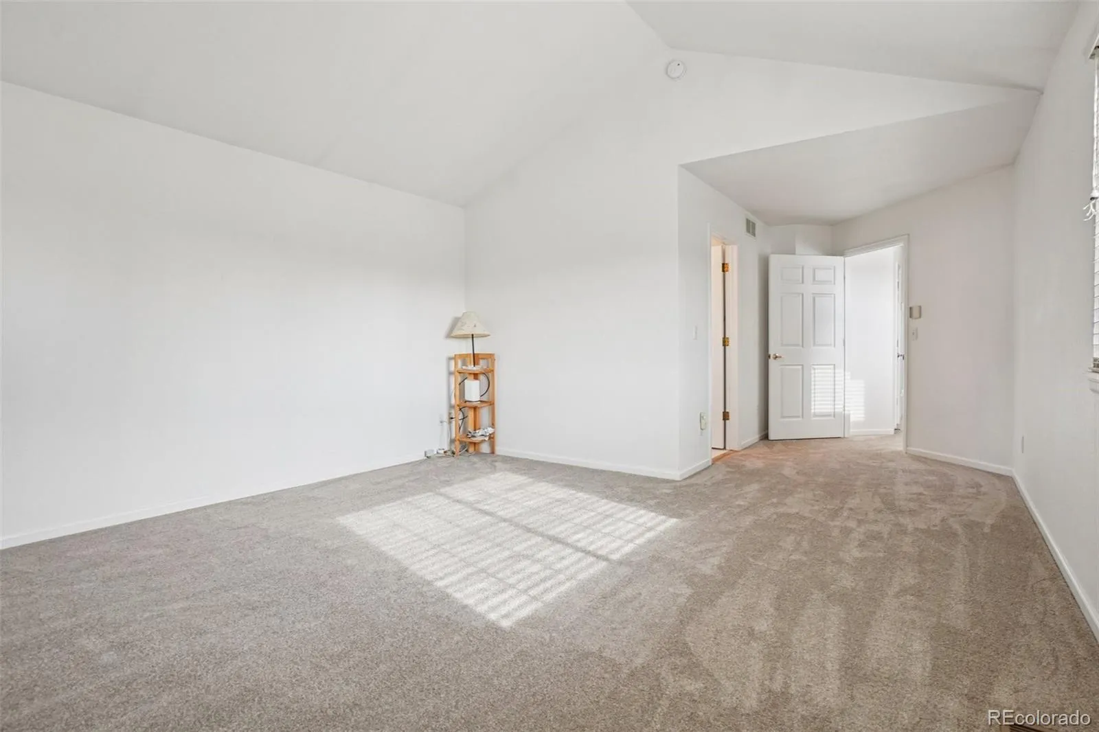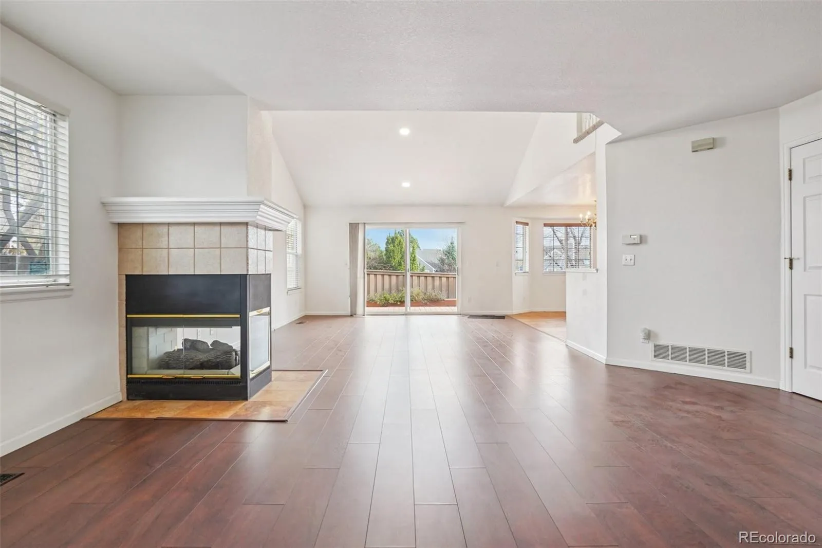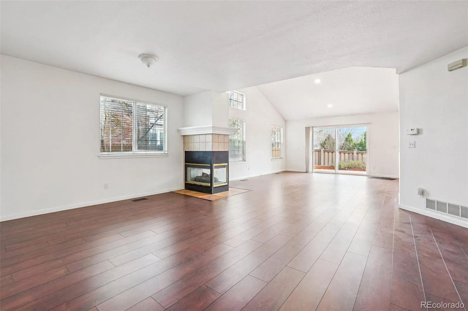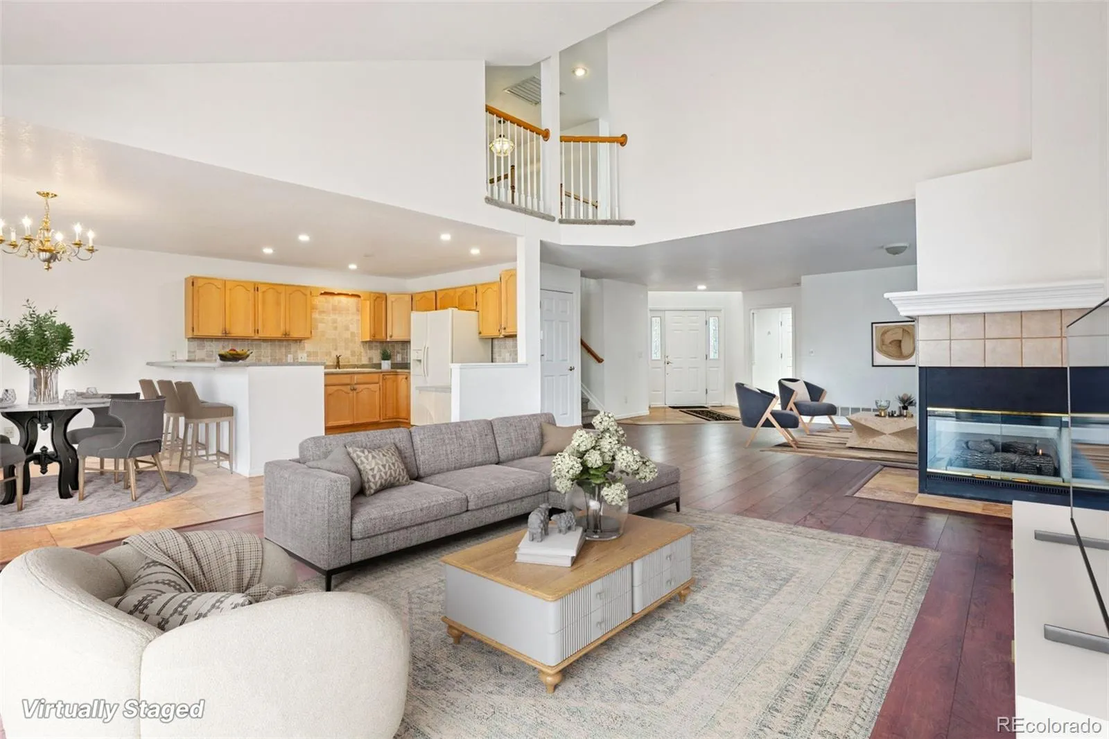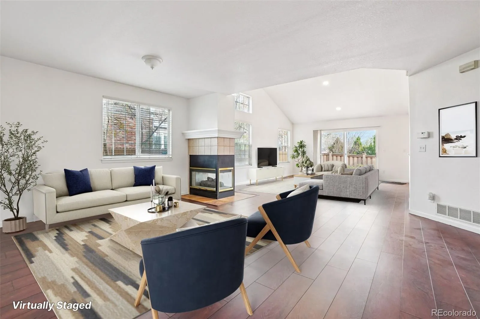 vaulted family room is seamlessly connected to an adjacent living or dining space—thoughtfully divided by a cozy see-