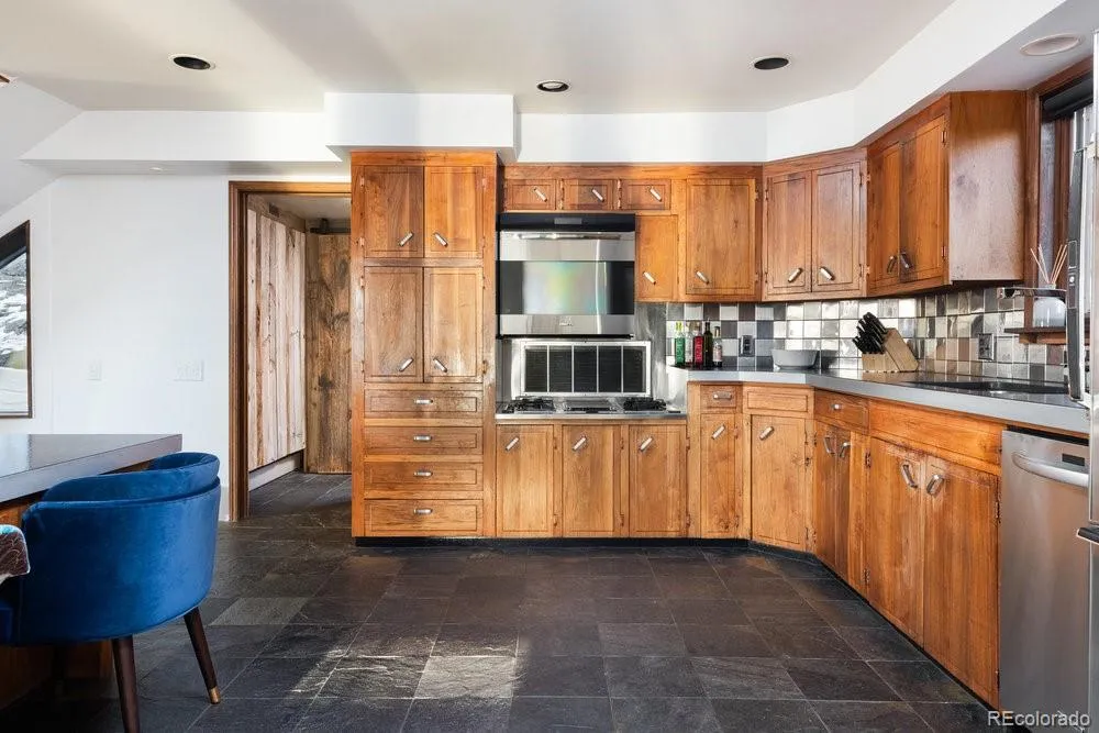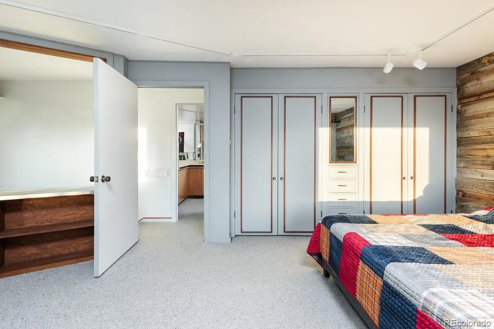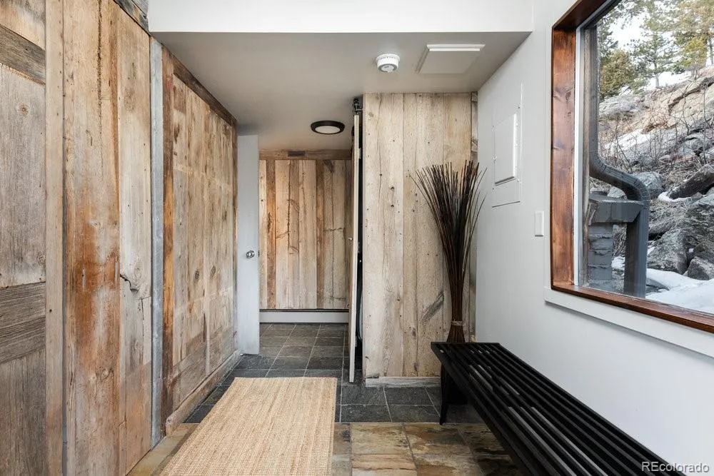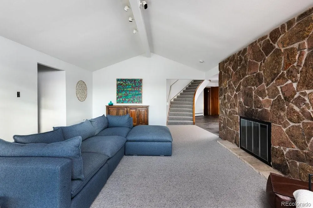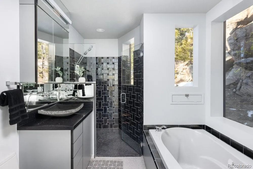 Set on an acre and a half on coveted Lookout Mountain, this stunning mid-century mountain retreat seamlessly blends architectural elegance with sweeping mountain views. Walls of windows flood the open living spaces with natural light, creating a seamless connection to the serene landscape with expansive views from nearly every room. The living room is anchored by a striking wood burning fireplace with floor to ceiling stone surround. The updated kitchen offers leathered granite countertops, stainless steel backsplash, original wood cabinetry and sleek appliances. The kitchen opens to the family room featuring a custom built-in entertainment center and storage, all opening up to panoramic views. Both living spaces provide access to the wraparound balcony and stone patio with fire pit. The luxurious primary retreat showcases soaring vaulted ceilings and majestic views that will have you wondering if you are waking up in a dream. Unwind in the large soaking tub, refresh in the tiled shower and enjoy dual vanities all with unique windows set against the privacy of rock outcroppings. Additional main level accommodations include a secondary bedroom, currently configured as a home office with built-in desk and shelving and a full bathroom. A curved staircase leads to the secondary suite with a spacious bedroom and five-piece bathroom with custom tile soaking tub and shower. Separate guest quarters feature a bedroom with built-ins and bathroom. A heated stone walkway leads to the oversized detached garage, complete with a newly installed electric car charger. Bonus room above the garage is perfect for a gym or workshop and offers a large storage room. Enjoy unparalleled peace and tranquility all with easy access to Golden, Denver, and ski resorts. With close proximity to Apex Park and scenic hiking trails, this extraordinary home offers the perfect blend of nature, luxury, and modern living. Don’t miss the opportunity to make this breathtaking mountain retreat your own.