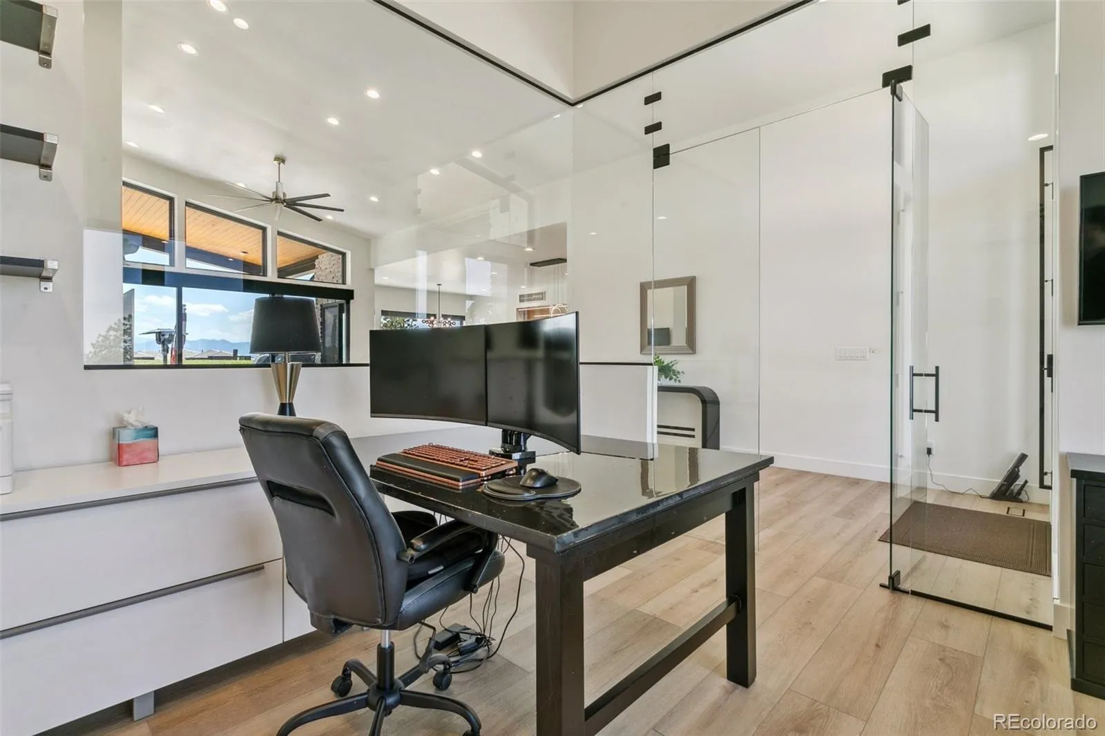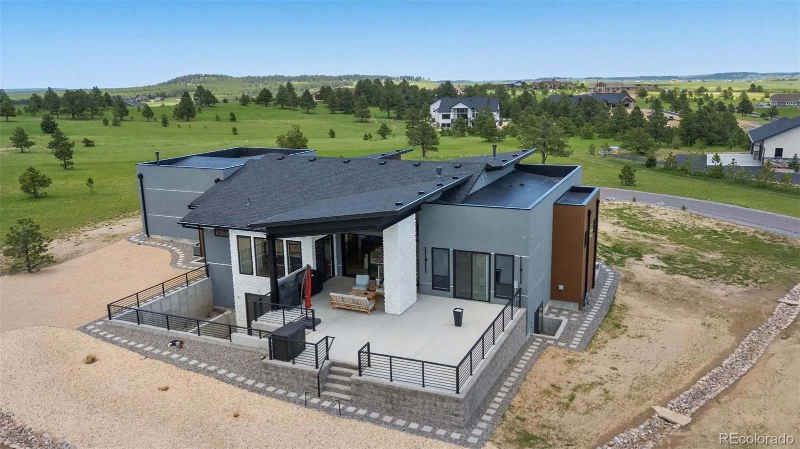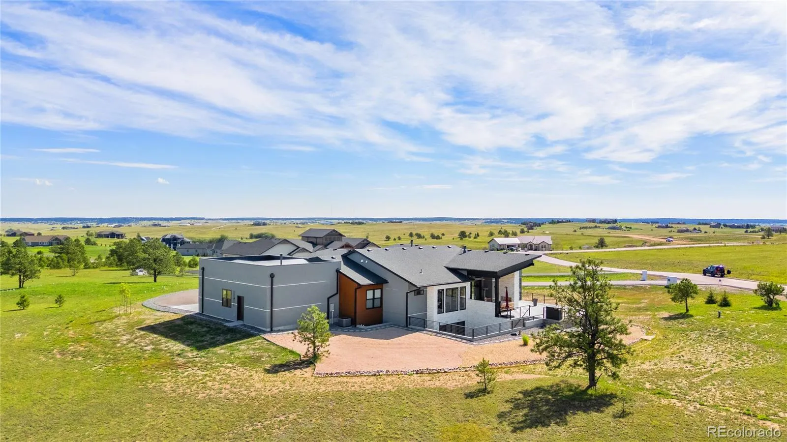 Modern Elegance Meets Mountain Majesty. This sleek, architecturally stunning modern masterpiece sits on 2.68 acres of serenity framing unobstructed views of Pikes Peak. Exterior materials Nichiha, stucco and stone are low maintenance. Designed by & for the discerning buyer, every line, finish, & feature reflects refined simplicity and high-end function. 5 spacious bedrooms (two on main plus office & 3 in lower walk out level all with en suite), 5.5 luxurious bathrooms, & dedicated office enclosed with glass; back patio with fireplace to enjoy breathtaking views; stairs to access to lower walk out custom, heated courtyard. This home effortlessly provides modern chic, style and flair. The gourmet kitchen is a chef’s dream, anchored by soft-close custom cabinetry, a six-burner gas range with two additional ovens, a double oven-microwave combo plus expansive prep space—perfect for entertaining or intimate meals. Seamless flow to dining space with large windows; wine bar area and additional full butler pantry for food prep complete with sink, freezer and ice maker & additional shelving with door to shut away the work space. Thoughtfully designed laundry drop zone with natural light, utility sink, dual closets, & sliding pocket door for effortless flow and privacy. Main master has access to back patio (plumbed/wired for hot tub); private laundry in large custom closet. The bathroom’s unique design boasts wet room, heated floors, two private WC areas, remarkable dual sink vanity with stylish cabinets and tile work. The walk-out basement transforms into a private retreat or party hub with a full wet bar, complete with fridge with ice maker, dishwasher and glass space ready for temp or humidity control – ideal for hosting with style. Clean modern open-concept living with abundant natural light that defines every space. A rare fusion of minimalism and sharp design – this home is the pinnacle of sleek architecture and design with appreciation for contemporary mountain living.