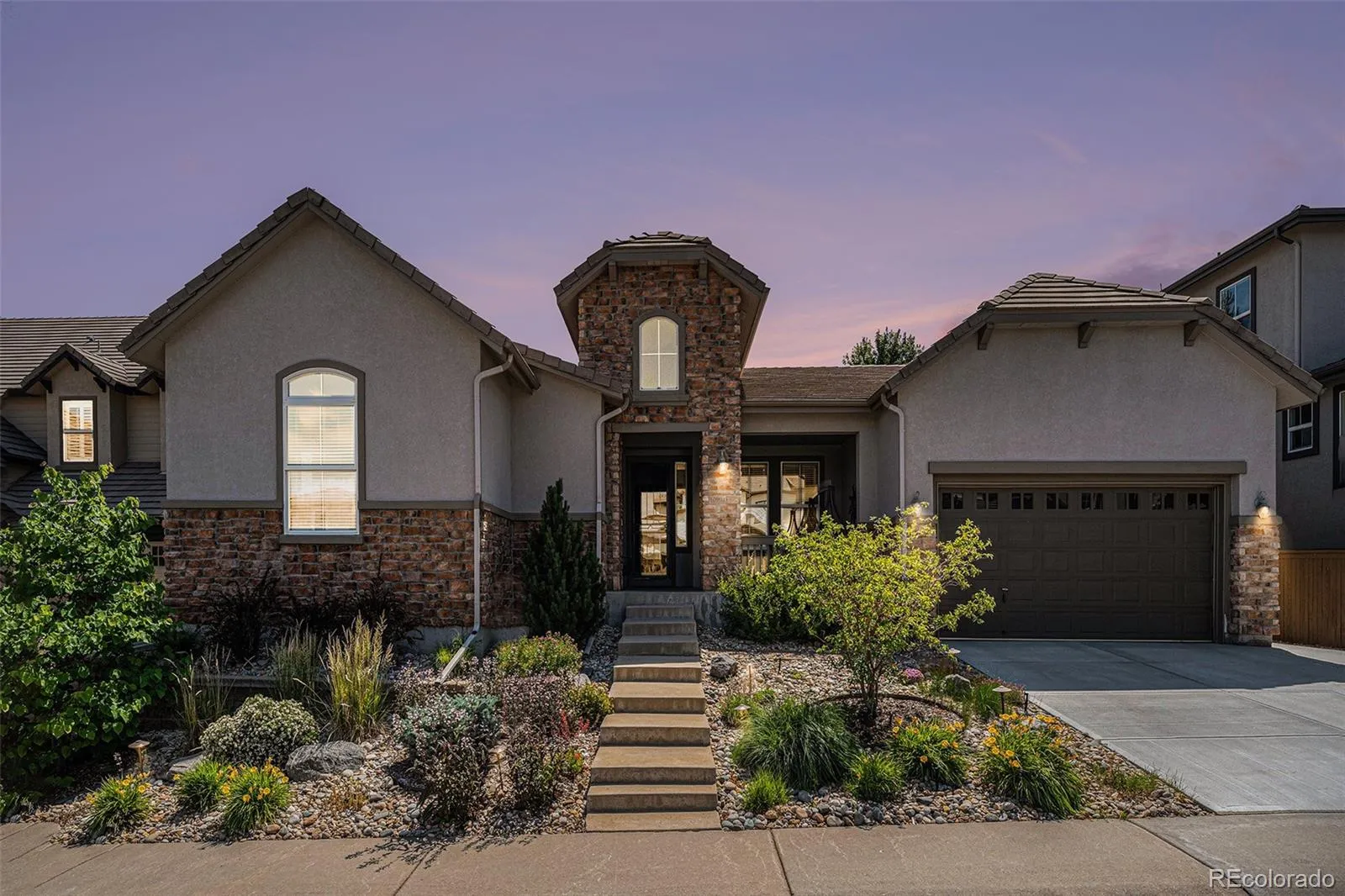 Low Maintenance Living in Highlands Ranch! Rare Main-Floor Primary Suite in The Retreat at The Hearth! Discover this stunning ranch-style home tucked into an exclusive enclave of upscale residences with a private backyard backing to a greenbelt. With 4 bedrooms, 4 baths, a fully finished basement, and a 3-car garage, this home blends comfort, elegance, and functionality. Step inside to a light-filled, open floor plan featuring hardwood floors, designer paint, and a gourmet kitchen with stainless steel appliances, gas cooktop, and an oversized center island with breakfast bar. The spacious great room, complete with fireplace and wall of windows, flows effortlessly into the formal dining room and main-floor study/living room—perfect for gatherings. The expansive main-floor primary suite is a true retreat, offering a 5-piece spa bath, and generous walk-in closet. Two additional bedrooms and a convenient laundry/mudroom complete the main level. Downstairs, the fully finished basement is an entertainer’s dream, showcasing a large rec room, media and game areas, custom wet bar with wine fridge and dishwasher and a private guest suite with full bath. Modern upgrades include dual high-efficiency furnaces and air conditioners, all controlled by a Nest thermostat. Outdoor living shines with a covered front porch, private backyard, patio, water feature, and peaceful greenbelt views. The oversized 3-car garage includes a service door for added convenience. Ideally located just minutes from Park Meadows, DTC, I-25, C-470, E-470, RidgeGate, Sky Ridge Medical Center, and light rail. Enjoy walkable access to top-rated schools, parks, sports fields, the rec center, and miles of scenic trails. Don’t miss this rare opportunity to own a retreat that perfectly balances luxury, location, and lifestyle!