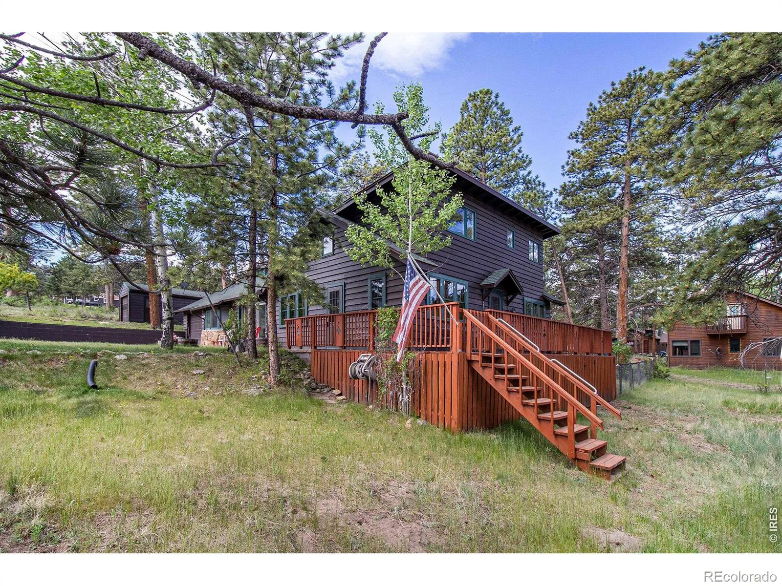 This unique property features an existing residence set on a large, private lot along a private drive, offering a rare combination of seclusion and versatility. The home blends historic charm with thoughtful modern updates and features a spacious open floor plan well suited for comfortable main-level living. Highlights include a wraparound deck, fenced yard, attached garage, and an additional detached garage.Conveniently located just minutes from downtown and a short drive to Rocky Mountain National Park, this property presents an exceptional opportunity for those seeking privacy, flexibility, and a prime Estes Park location. Features existing residence plus two separate, buildable lots on a private drive. Home is on 0.65 acres, Lot 2 0.48 acres, Lot 5 0.28 acres. Keep land or sale off 2 lots to pay for the purchase.