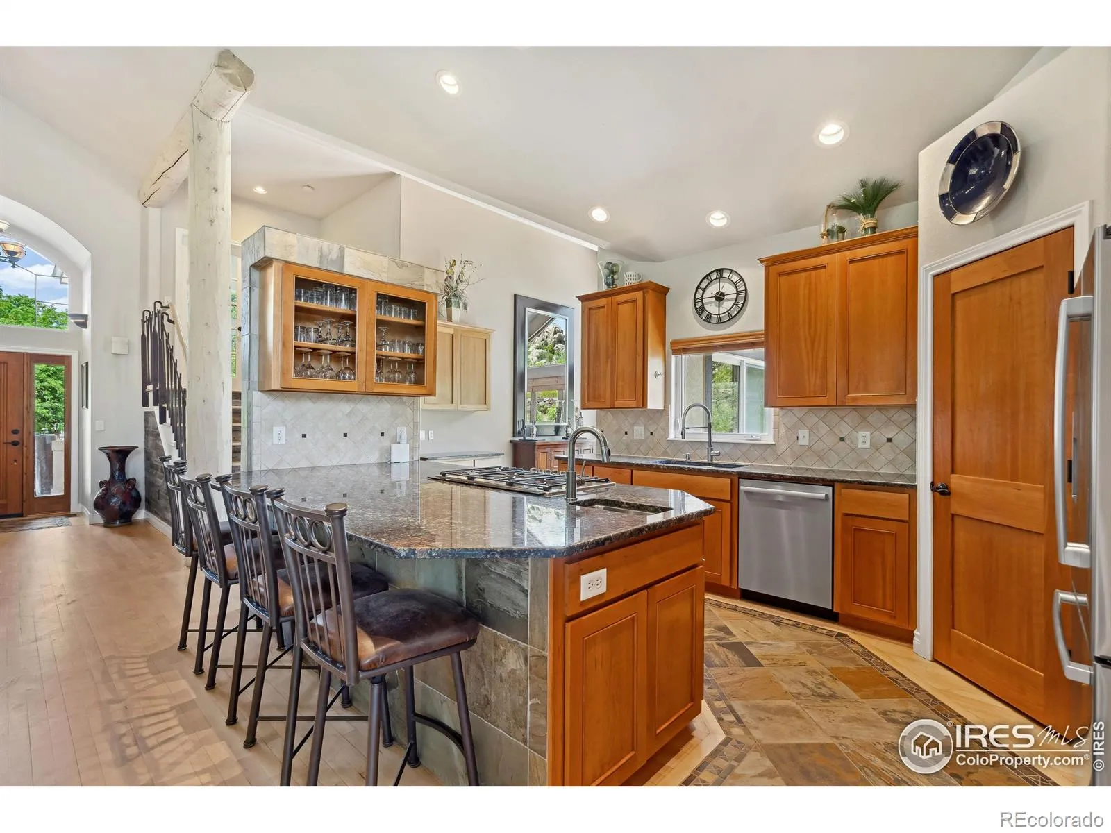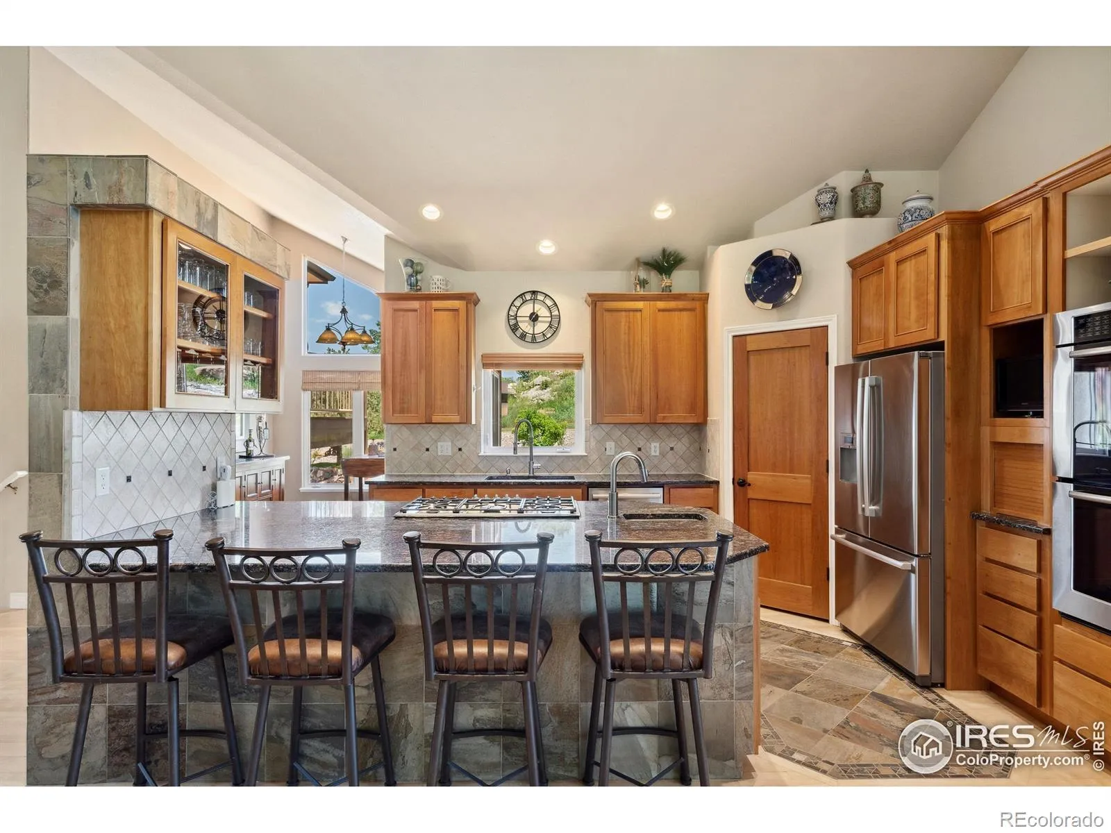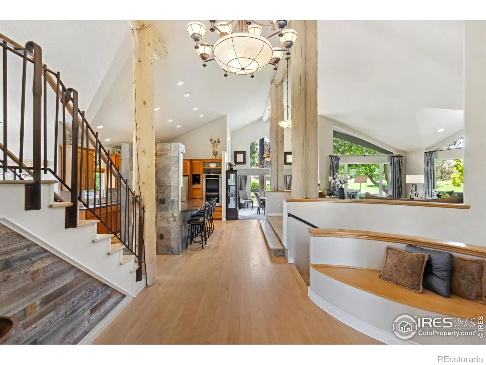 Golfer’s Dream in Mariana Butte! Nestled on the 9th hole of the scenic Mariana Butte Golf Course, this custom-built 4-bedroom, 3.5-bath, 5,001 sq ft home offers unparalleled mountain views and an extraordinary outdoor living experience.Situated on a quiet Cul-de-sac, the property boasts direct access to the Mariana Butte scenic trail and is just minutes from the Devil’s Backbone Hiking Trail and Sweetheart Winery. Only a 45-minute drive to the iconic Estes Park, it blends tranquility with convenience. Built in 2000 with exceptional craftsmanship, the home features beautiful timber structures, including a charming breakfast nook with butler bar and rich cherry cabinetry. Soaring cathedral and vaulted ceilings enhance the spaciousness throughout. French doors in the top-floor primary suite open to a private balcony with sweeping foothill views, providing the perfect spot to relax and take in Colorado’s natural beauty. The suite also offers a spa-like en suite with a jacuzzi tub and a generous walk-in closet. The main level includes two well-appointed bedrooms, a large kitchen with an island, a welcoming foyer, a formal dining area, and a cozy living room with a gas fireplace. The basement is a versatile space, offering a fourth bedroom and full bath, plus two bonus rooms perfect for a home office, gym, or additional living space. Abundant storage throughout ensures every need is met. From the main level, step outside to the wraparound patio where you’ll find a peaceful waterfall pond and a beautifully landscaped garden teeming with Colorado wildlife like elk and turkeys. The home is equipped with two hot water heaters, three furnaces, and two A/C units for year-round comfort and optimal climate control.Whether you’re a golfer, nature lover, or simply seeking a peaceful retreat close to town, this home is a rare gem that provides the best of both worlds. Don’t miss the opportunity to make it yours!