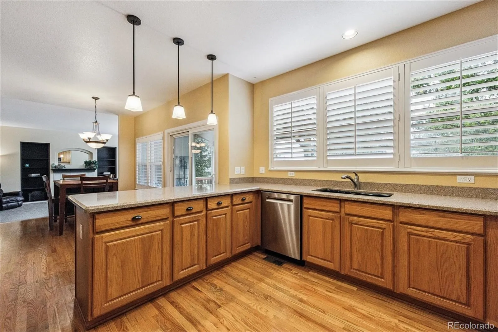 Inside, the welcoming layout blends comfort and functionality. A main-floor bedroom with an adjoining ¾ bath can double as a 2nd mainfloor master, while the vaulted ceilings, hardwood floors, plantation shutters, and stainless steel appliances bring style and warmth. With plenty of flexible space, there’s room for home offices, hobbies, or guests. The finished walk-out basement has wine storage, and a bar area, and a place for pool, game night and movies or a dance party. Brand new-hot water heater and garage door.