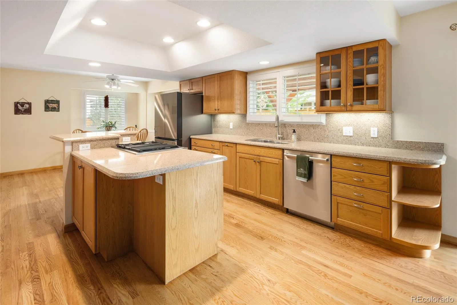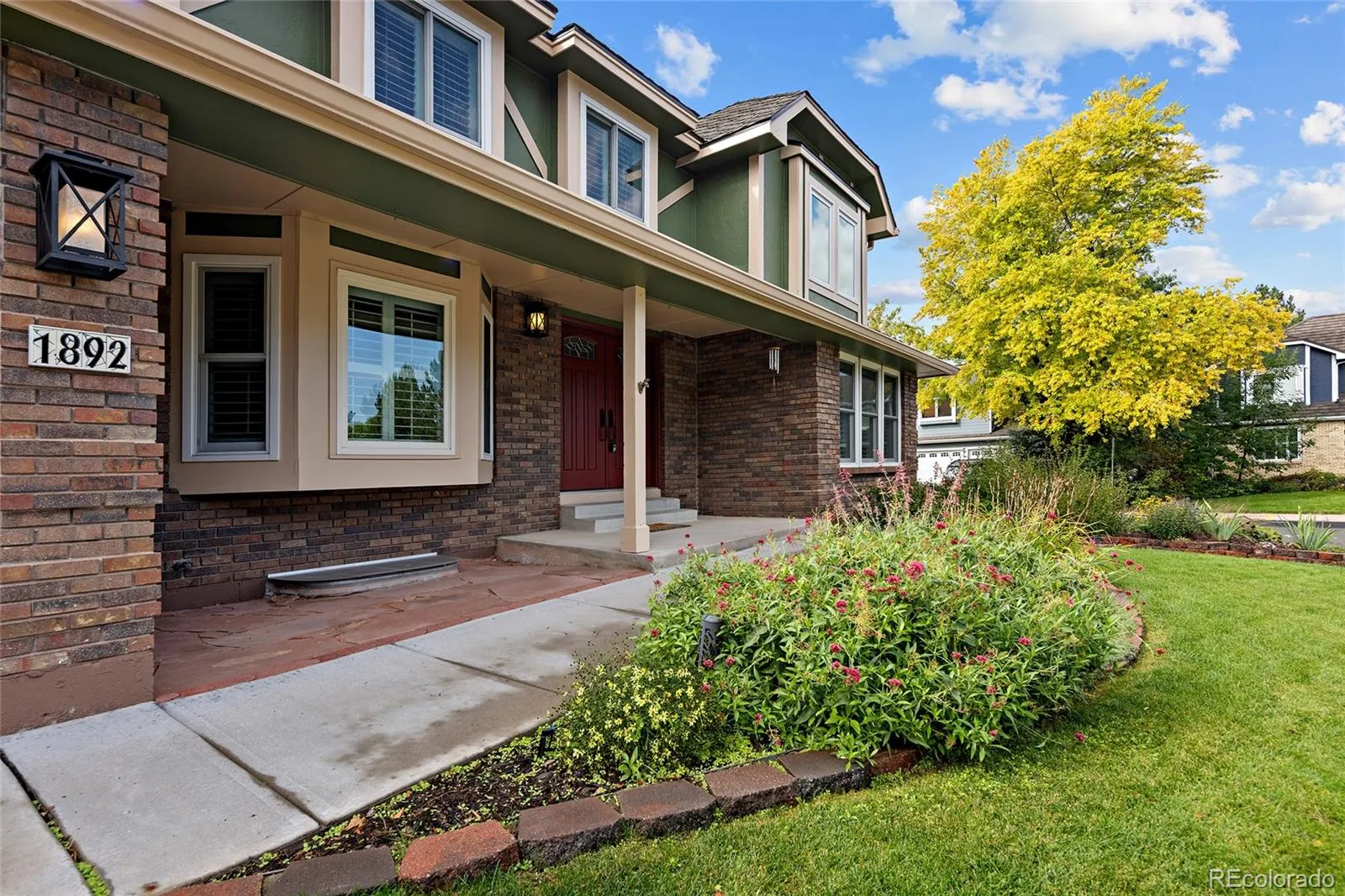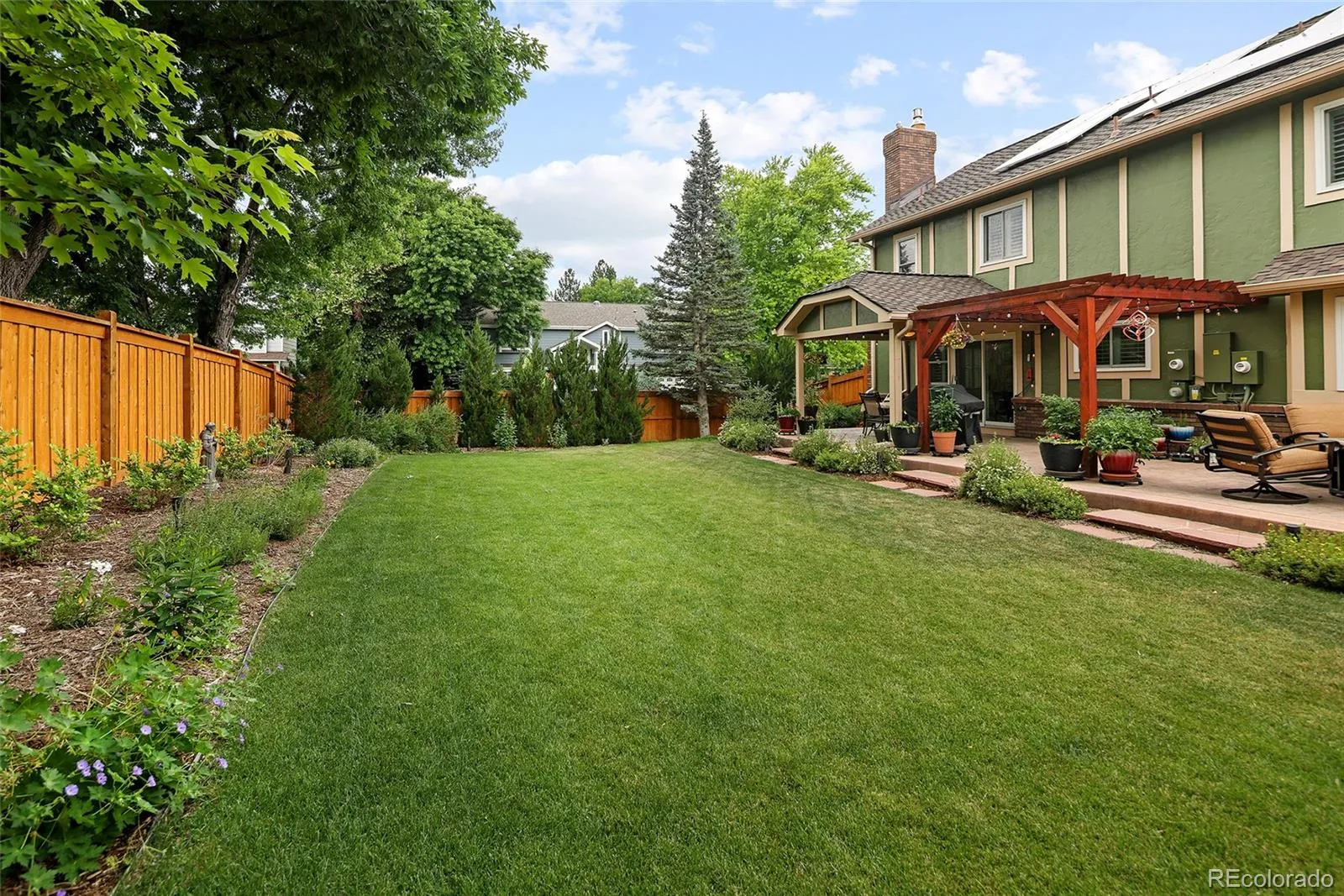 Great Curb Appeal. Extensive Upgrades. Prime Location. This beautifully maintained and thoughtfully upgraded three-car garage home seamlessly blends timeless charm with modern convenience. Nestled on a picturesque block with excellent curb appeal, this residence is ideally located near parks, RTD Light Rail access, and the scenic High Line Canal. The freshly painted exterior (2023) is complemented by professionally redesigned landscaping and a Mountain Berry-colored front door, setting a welcoming tone. A covered front porch leads into a dramatic two-story entry foyer, where natural wood floors and a lofted library overlook greet you with warmth and openness. Bronze balusters accent the grand staircase, while the central hall floor plan provides elegant sightlines to the office/study and formal dining room. The heart of the home is the open-concept kitchen, complete with a newer Bosch stainless steel dishwasher and a newer stainless steel refrigerator/freezer. The kitchen flows seamlessly to the breakfast nook and the inviting family room, making entertaining easy. Retreat to the Primary Bedroom Suite, where you’ll find vaulted ceilings and a luxurious five-piece bath with granite countertops. A truly impressive 17’X10′ walk-in closet completes the suite, offering generous storage space for any wardrobe. The backyard is a true oasis, ideal for both gardeners & entertainers alike. The expansive multi-zone patio—featuring covered, trellised, & open-air sections—extends your living space outdoors in every season. Privacy was enhanced in 2023 with the installation of a new privacy fence. Monthly home expenses will be lowered significantly with newer Anderson Windows & solar panels. The average gas & electric cost for the first seven months of 2025 was $178 per month! Check out the electric vehicle (EV) solar charging station in the garage. Class IV impact-resistant roof shingles & 6” gutters installed in 2024. Seller offering a concession toward interest rate buydown.