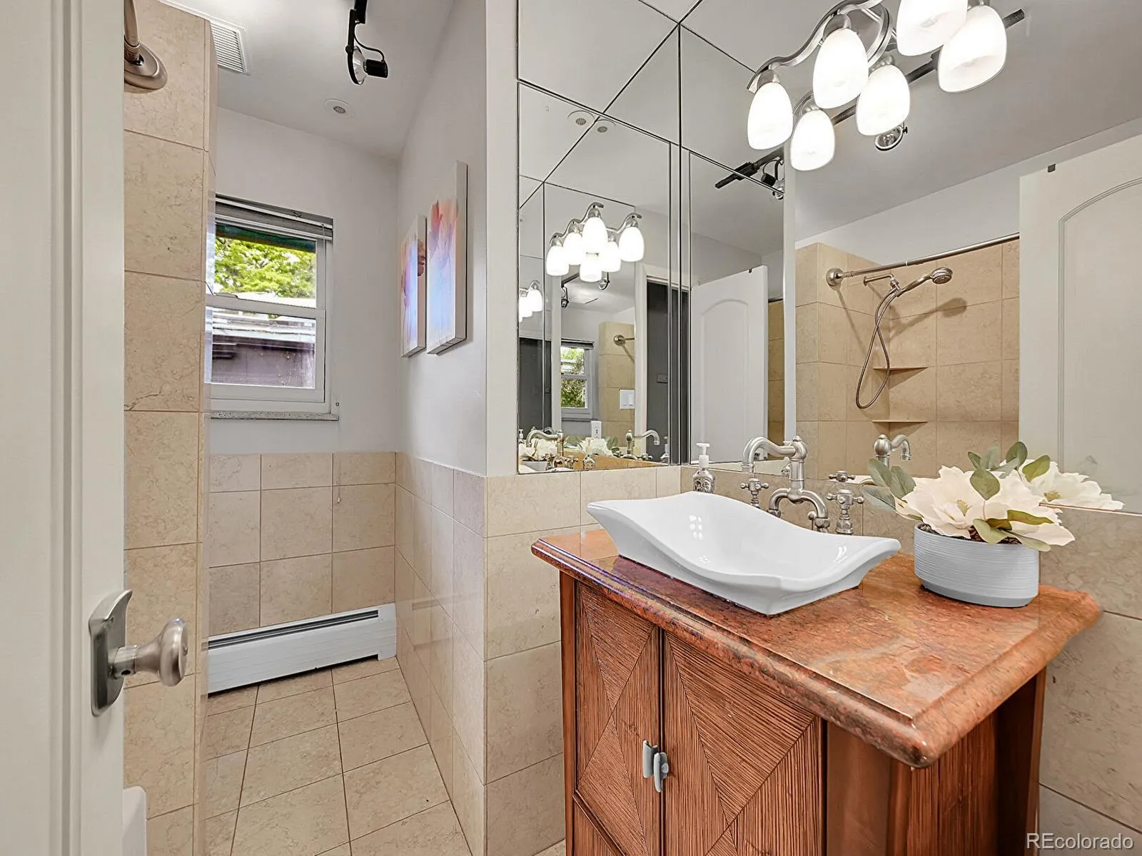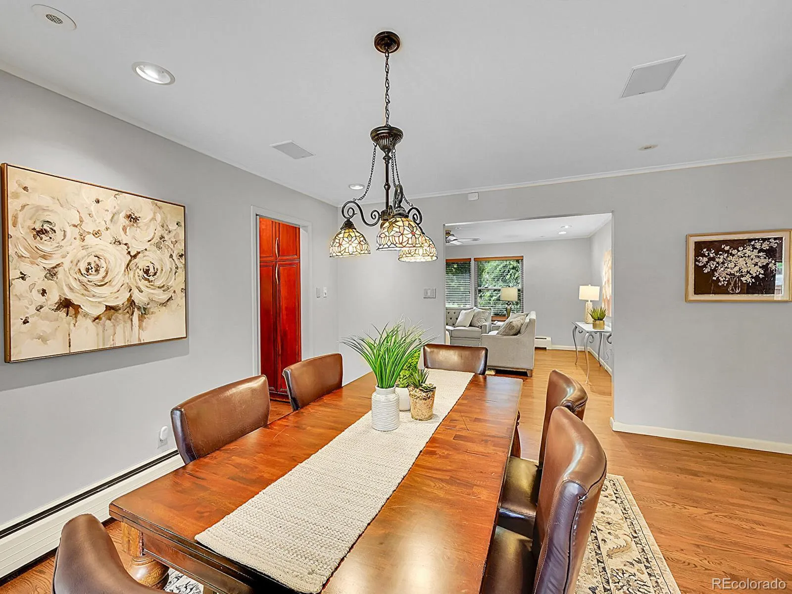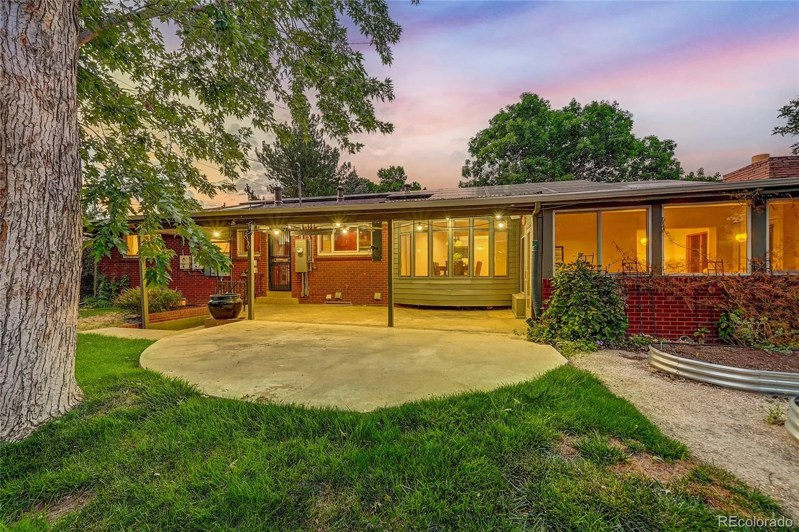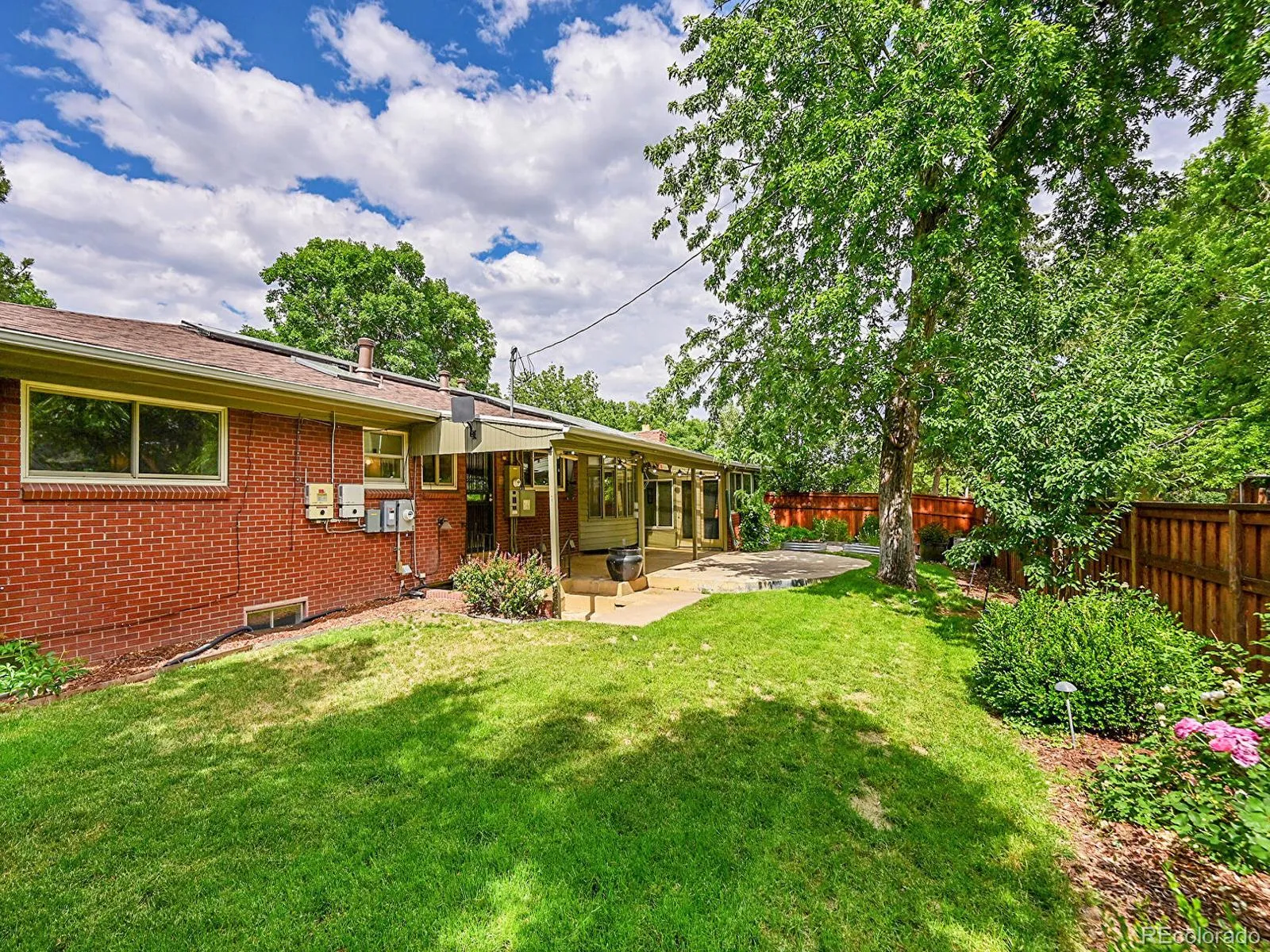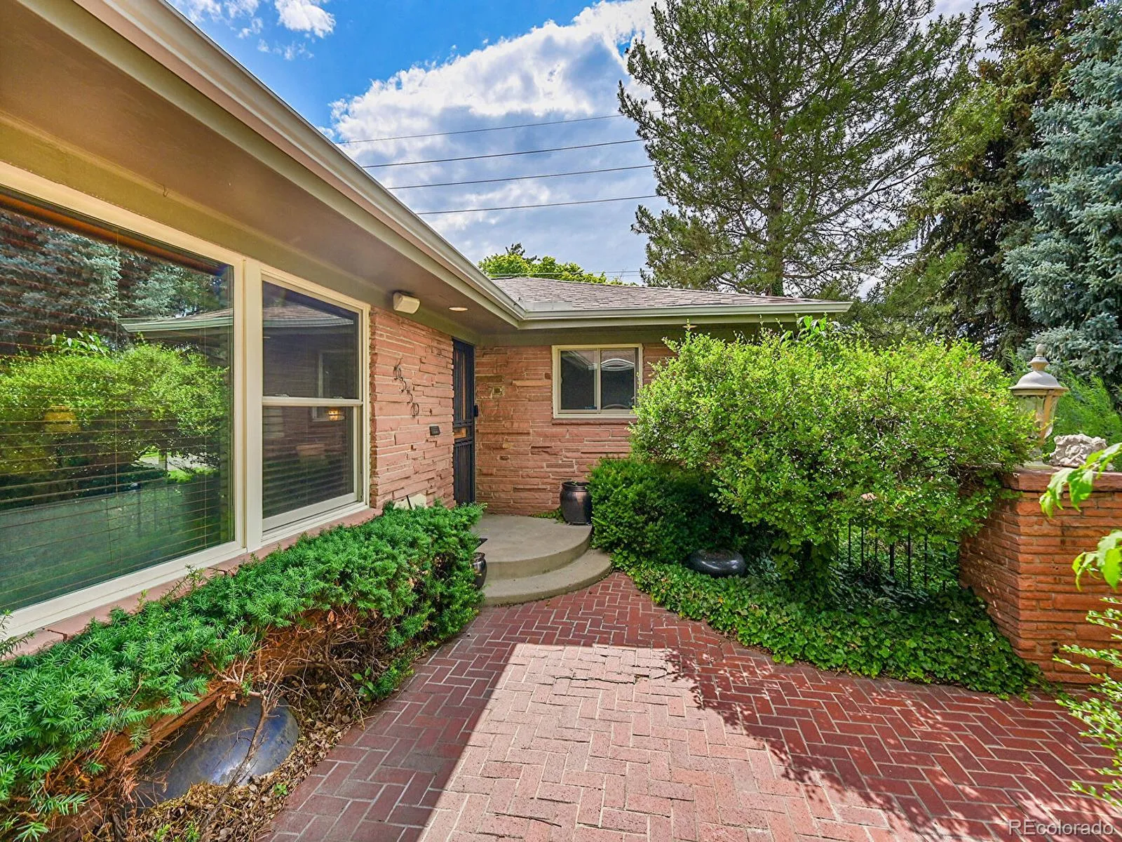 Nestled on a lush corner lot, this Mid-Century gem offers charming Mayfair Park living with a multigenerational layout! Brick pathways framed by greenery and lantern-topped pillars offer a first glimpse of the home’s welcoming charm. Anchored by hardwood floors and bathed in natural light, the main level flows effortlessly from a spacious living room—a natural gathering spot filled with sunlight—into an elegant dining area framed by a bright bay window and illuminated by a classic chandelier. A chef-worthy kitchen awaits with granite countertops, double ovens, a 6-burner range with down-draft, and sleek stainless-steel appliances—opening directly to the backyard for al fresco dining. A few steps down reveal a warm family room anchored by a rustic stone fireplace, a half bath, and a handy wet bar—flowing into a bright sunroom with elegant tile flooring and direct access to the backyard, creating a peaceful retreat. Main-level living continues down the hall to the spacious primary bedroom featuring natural light, a seating area, walk-in closet, and an elegant 5-piece ensuite with double sinks, skylight, spa-like jet tub, and glass shower. Two well-appointed bedrooms share a nearby full bath and laundry room, creating a functional and comfortable layout. The finished basement offers a refined private retreat with a spacious rec room, custom built-ins, state-of-the-art cinema room, sleek wet bar, and bespoke wine cellar. Two bedrooms share a full bath, laundry, and kitchen nook with sink, dishwasher, and fridge, creating an ideal private layout for multigenerational living. Relax in the serene backyard oasis with covered patio, thriving garden beds, mature trees, and grilling area. Owned solar means no electric bills, plus extra attic insulation, new roof, new windows, and new fencing. With Crestmore and Crescent Parks, Wings Over the Rockies Museum, and the acclaimed International School of Denver just steps away.