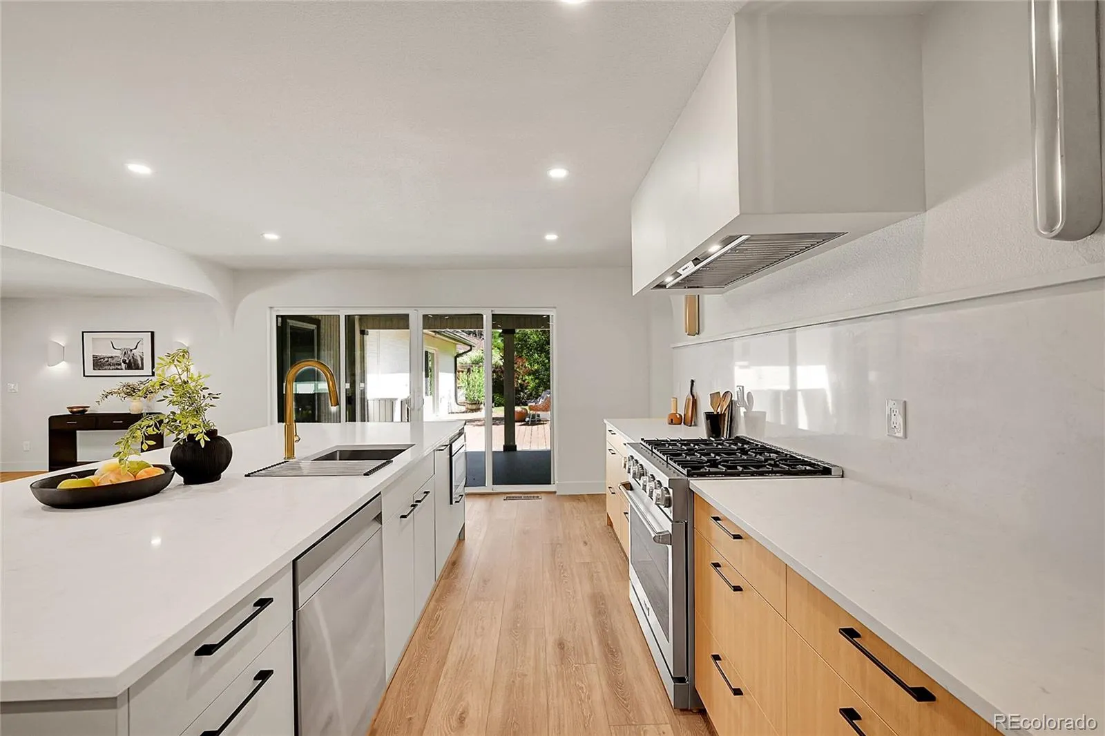 burner range, custom vent hood, sleek cabinetry, and an oversized quartz island, while the adjacent dining space features