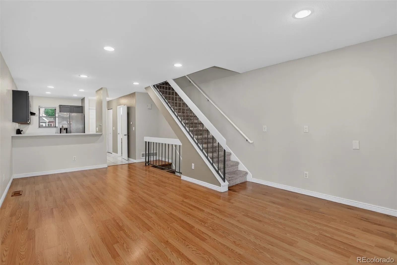 Quiet home located on a prime lot backing to one of the many parks in the well-kept community of Windsong. This home lives large. The main level features a very functional kitchen that opens to the main living room, dining space, powder room, and back deck with storage closet. The upper level boasts a spacious primary bedroom with dual closets and separate access to the full bath. A large secondary bedroom also offers dual closets. The fully finished basement features a newer bath with shower and laundry, a large storage closet, and space for a family room, rec room, office, or additional bedroom. This home features a one-year-old furnace, vinyl flooring, smart thermostat, newer back sliding door, stainless Frigidaire fridge and range, and recently serviced central AC. Windsong residents enjoy a pet-friendly community with pool, tennis, playground, and clubhouse use, as well as lock-and-leave convenience with minimal exterior maintenance. The prime location of this home grants easy access to Cherry Creek shopping, Lowry, Glendale, and countless parks and trails and is within the coveted Cherry Creek school district.