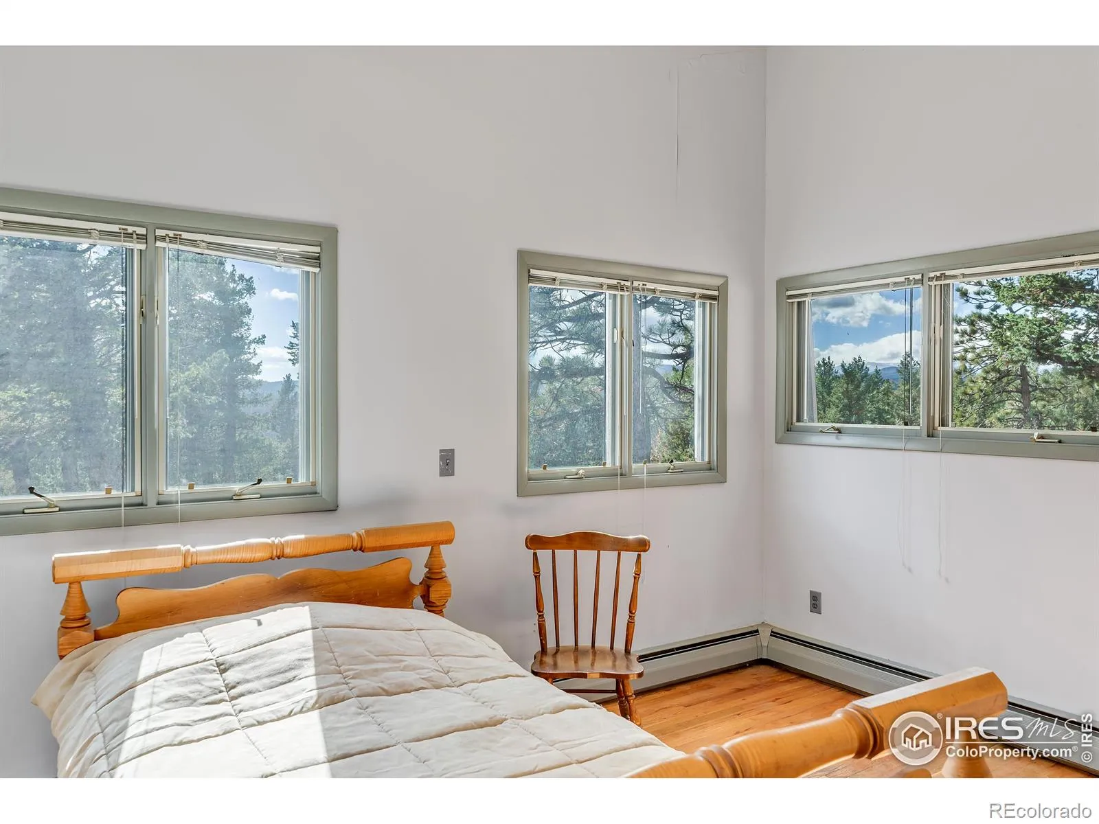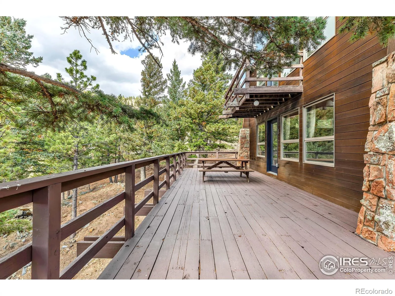 Serene mountain retreat nestled on 18 usable acres, bordered entirely by National Forest. This exceptionally private property offers lovely views of the Back Range and unparalleled access to nature. Inside, you’ll find rich wood flooring throughout the main level, lending warmth and charm to every room. The primary suite features a private bath and walk-in closet, while the two lower-level bedrooms each open to the outdoors through sliding glass doors. Step outside onto 900 square feet of wrap-around decking, ideal for entertaining or simply soaking in the peaceful surroundings. A fenced dog run adds convenience for pet lovers. Car enthusiasts or hobbyists will appreciate the two detached garages with space for up to four vehicles. Just 17 minutes from downtown Boulder, this unique property offers the best of both worlds: peaceful seclusion and close proximity to town. A perfect haven for families who cherish nature, privacy, and the Colorado lifestyle.