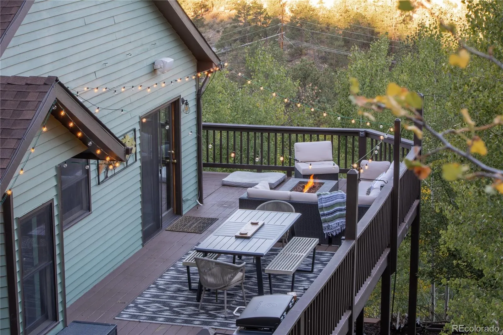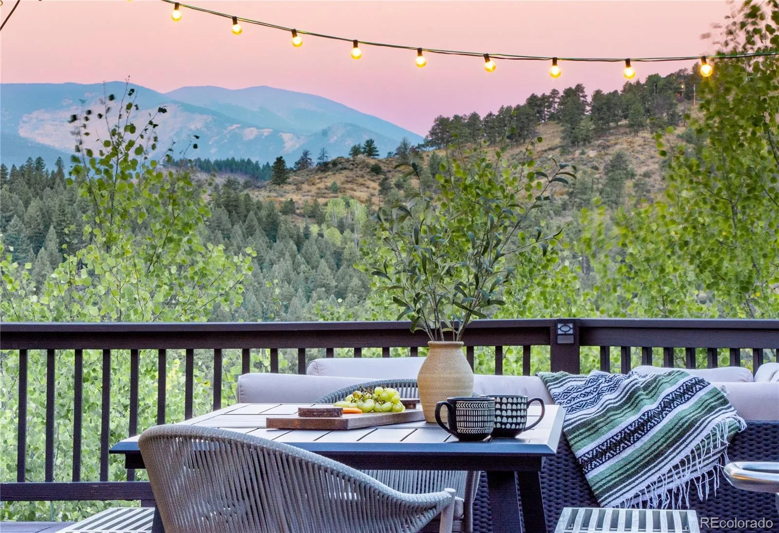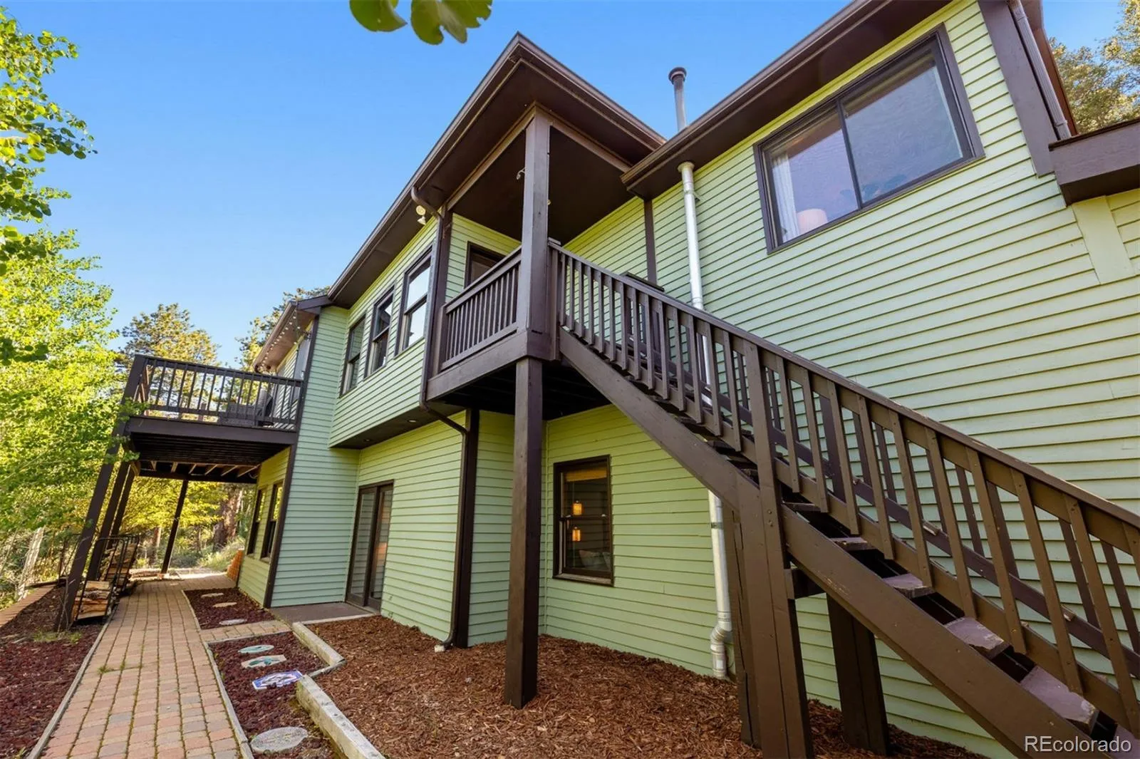 Stunning mountain retreat on 3 private acres with breathtaking panoramic mountain views, this spacious home offers both comfort and character just 2 miles from charming downtown Bailey. You will be impressed from the minute you walk in the door! This professionally designed mountain home is a true showcase of craftsmanship and impeccable taste. The large open living room features a cozy wood stove and a wall of windows that flood the space with natural light, frame the stunning scenery and allow in the fresh mountain air breeze. The open dining area flows seamlessly to a wraparound deck, perfect for entertaining or relaxing while soaking in the sunset views. The kitchen is a unique, custom space that overlooks the deck and features a skylight, modern appliances and a built-in speaker system. The Kitchen is open to a flex space overlooking the backyard and could be used as a coffee nook, office or play area for children while meals are prepped. Adjacent is a powder bath and laundry/mudroom with abundant shelving & yard access. The main-level primary suite overlooks more mountain views, features a jetted tub, newly remodeled shower, and a walk-in closet. Head downstairs to a cozy family room featuring a pellet stove, sliding door access to the outside, and rich wood accents. You’ll find 2 additional bedrooms, a full bath, and a bonus room perfect for an office, gym, or 4th bedroom (non-conforming). Custom railings, huge picture windows, and high-end finishes throughout make this home one-of-a-kind. This home has had numerous upgrades since 2022 including the conversion to natural gas, a new central heat furnace, new well pump equipment, water heater & built-in water filtration system, repaved driveway, new appliances and more! Enjoy the fresh mountain air by the fire, explore nearby trails, ski resorts, or Red Rocks—all within reach. This Colorado mountain dream home with four season unique views is move-in ready!