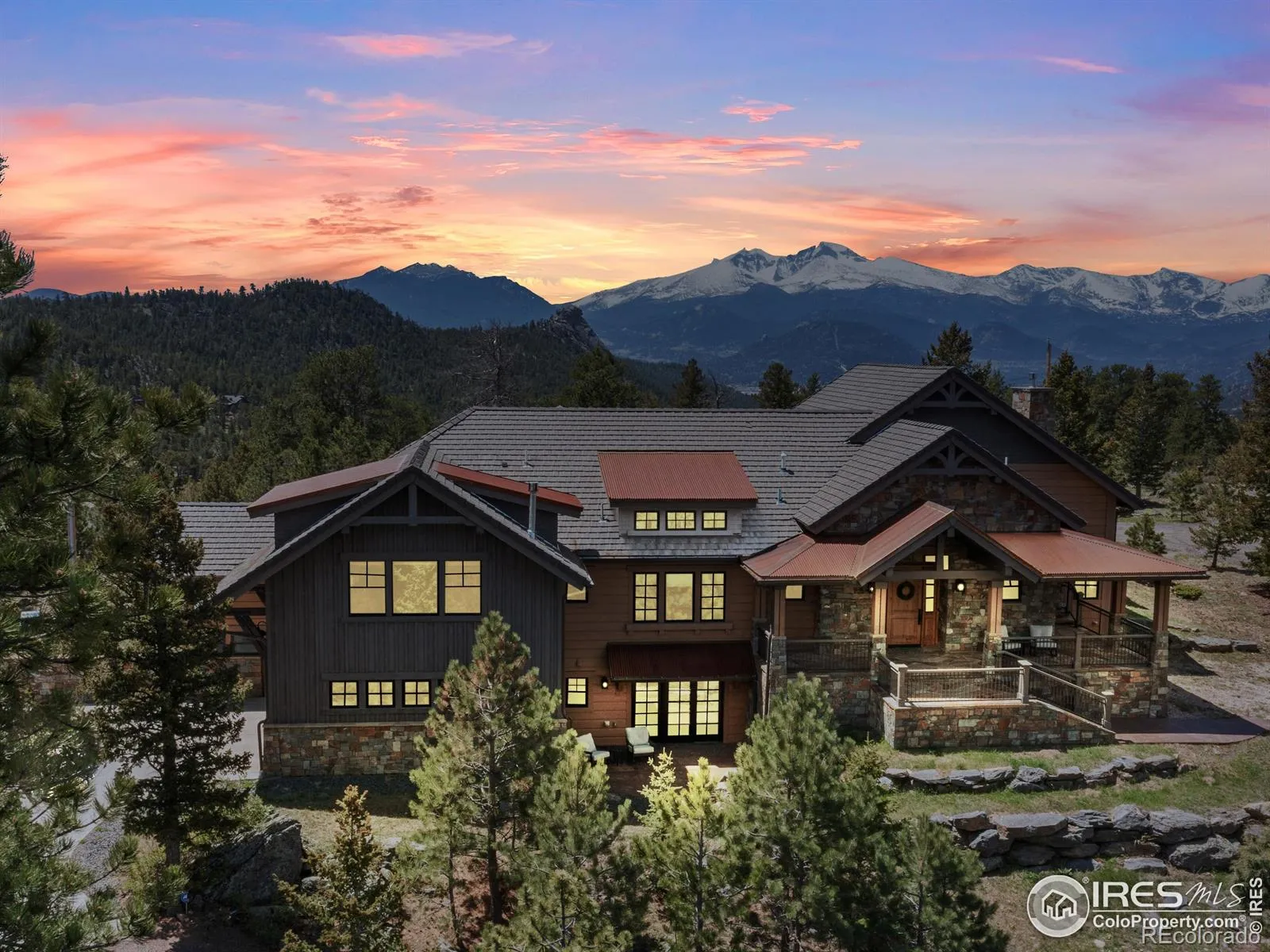 ~Magnificent Rocky Mountain Estate~ Introducing 3411 Hillcrest Lane in Estes Park… Luxurious mountain living at its finest in this custom-crafted masterpiece, featuring a 5,398sf home and delightful log cabin guest house of 560sf. Located on 16.3 acres with panoramic views, including Longs Peak and the snow-capped mountains of the Continental Divide. Endless adventure into the bordering National Forest, you’ll enjoy peaceful hikes in the forest or thrilling mountain biking, right out back. The masterfully crafted home offers a grand great room surrounded by soaring windows, beamed ceilings, and a classic wood-burning stone fireplace. The gourmet kitchen affords Wolf & Subzero appliances, timeless granite and lots of storage. Primary suite with it’s own private patio, features spa-like bath with oversized shower and free-standing soaking tub, plus a huge walk-in closet. 2 additional guest suites for company. Downstairs, you’ll find an amazing state-of-the art Home Theatre with 120″ screen, Sony 4k projector, Dobly Atmos sound, and Control4 system; starlight ceiling, popcorn machine, voice controlled lighting and remote black-out blinds. Outdoor living spaces include a covered BBQ patio and open-air stone fireplace under the starry night sky. Unique luxuries of an adventure lover’s mud room for the gear and 4 person cedar sauna to enjoy after that hike. Attached garage with epoxy floor and dog wash station complete the main home. Bonus is the log cabin guest house that could be your home office, studio space, or for extra company on those special weekends. A truly special Mountain Retreat, with the privacy, land & views you’ve been waiting for…