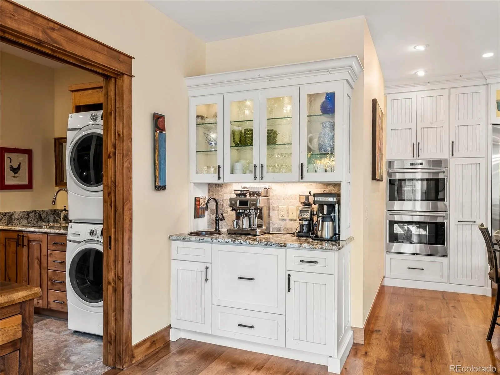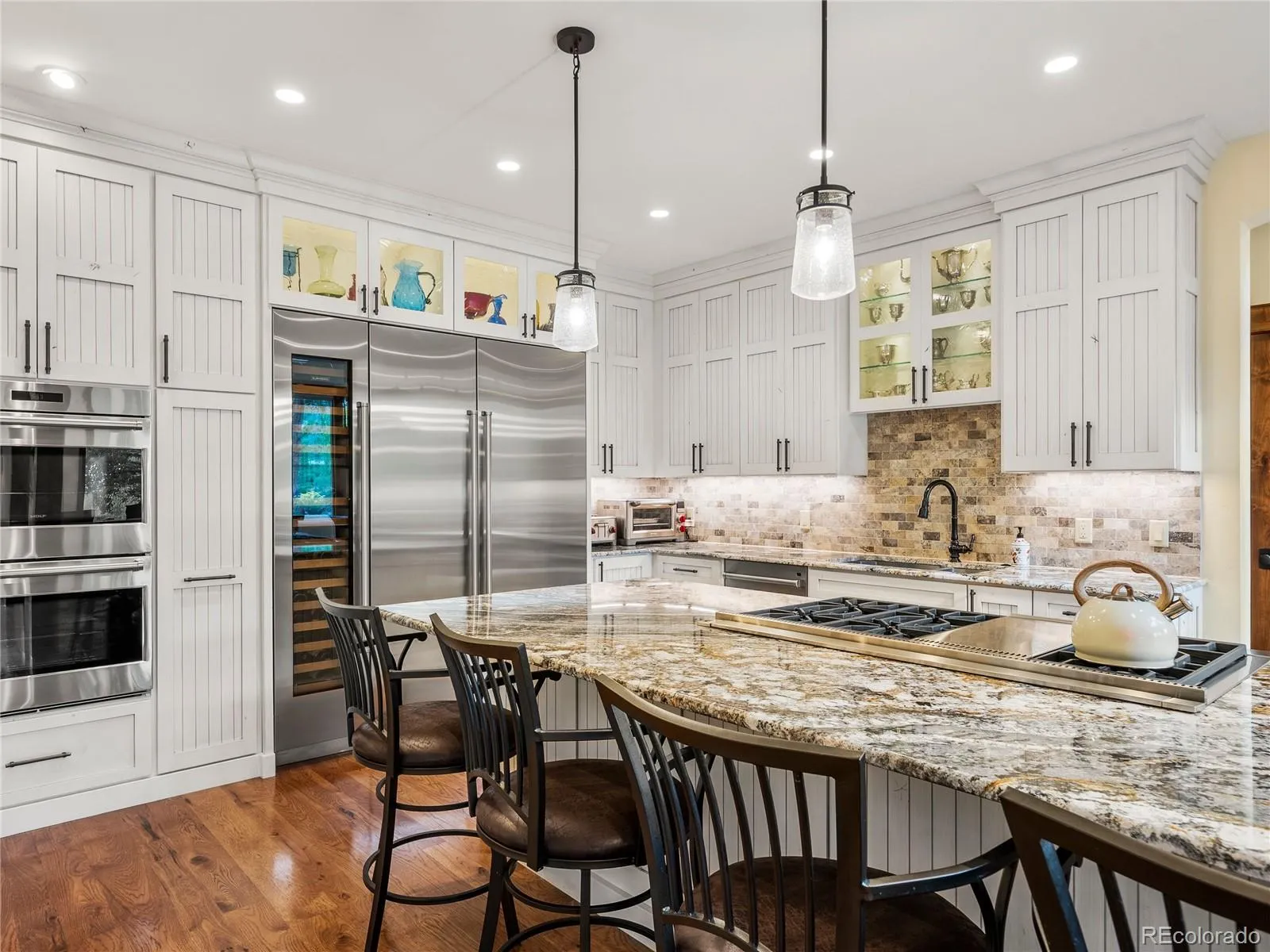 Warm wood accents and hardwood floors flow through a cozy-yet-expansive layout with four fireplaces. A striking multi-level staircase with custom balusters adds character. The main level centers on a chef’s kitchen with Wolf 6-burner + griddle, Sub-Zero refrigerator and wine column, two dishwashers, double ovens, and a large island with seating for seven. A dedicated coffee/wine bar streamlines hosting. Adjacent are the dining area, media room, powder room, mudroom with laundry, and a guest suite with patio access.