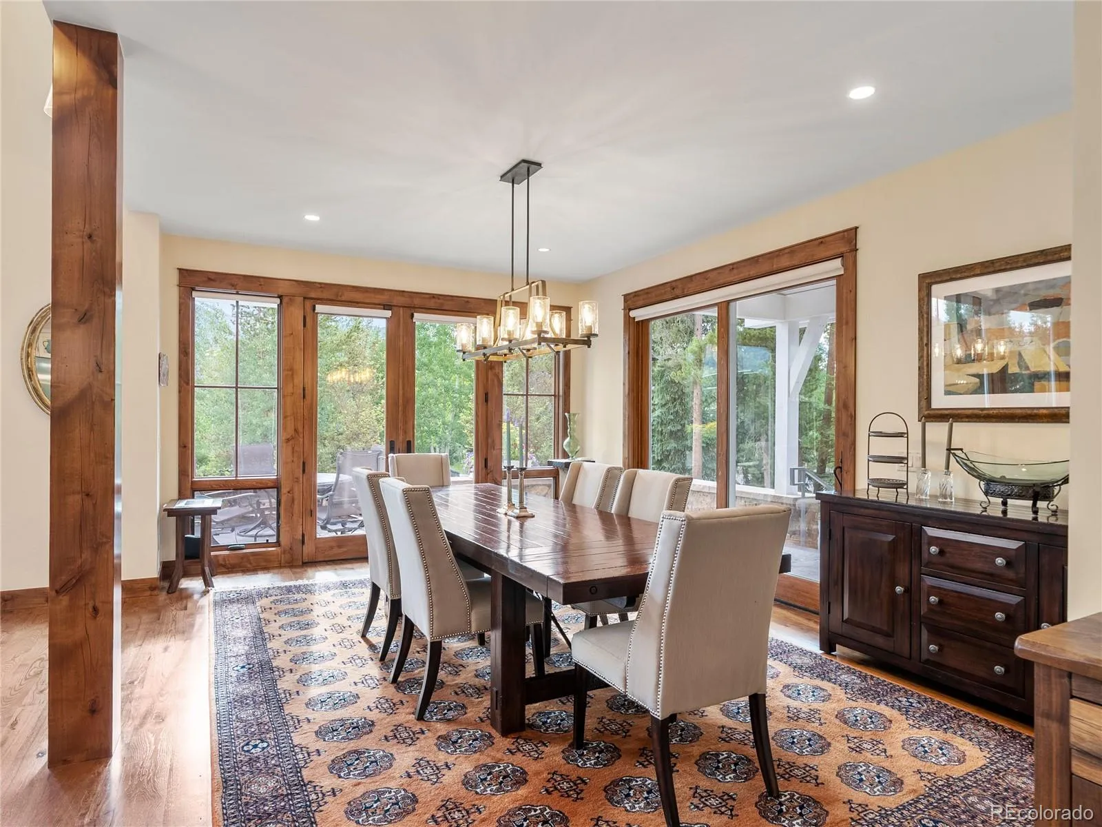 Set on a rare flat lot with native gardens and a grassy backyard, the property includes a spacious stone patio and a heated, covered porch—perfect for entertaining and watching skiers on the peaks.