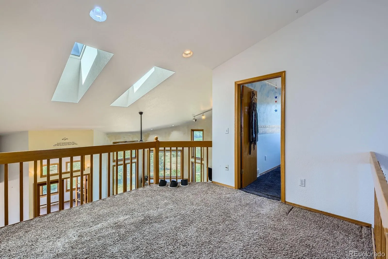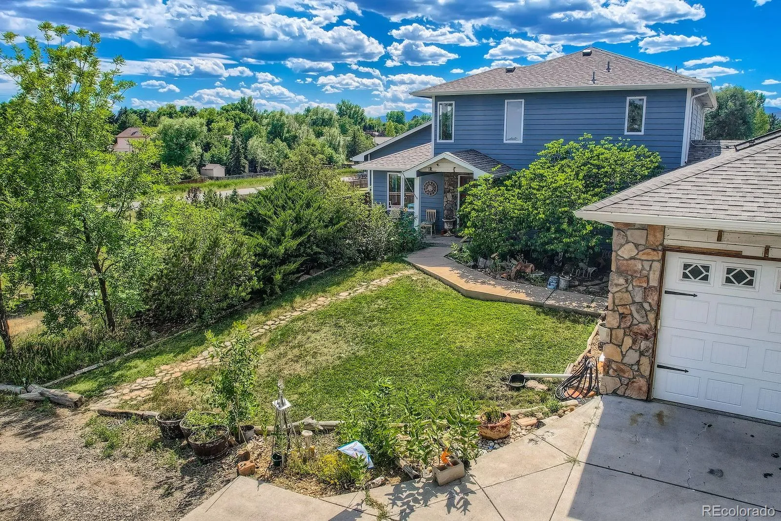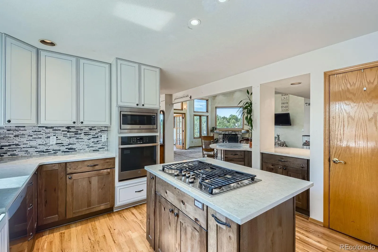 Versatile 1.5-acre retreat with stunning mountain views, no HOA or Metro Tax District, and rare FA1 zoning-bring your horses, goats, or chickens! This 5-bed, 3-bath home offers true multi-generational living with a fully finished walk-out basement featuring a private entrance, full kitchen, family room, 2 bedrooms, and 3/4 bath-ideal for extended family or rental income. The light-filled great room features soaring ceilings, picture windows framing the Rockies, and a gas fireplace. The updated kitchen impresses with quartz counters, farmhouse sink, wall ovens, gas cooktop island, and two-tone cabinetry. The main level includes 1 bedroom and full bath, while the upper level offers 2 bedrooms, a loft, and a full bath. Enjoy the outdoors from the spacious upper deck or shaded patio below. Additional highlights include owned solar, a newer roof, newer HVAC system, an oversized garage, RV parking, and mature landscaping. A truly flexible home for modern Colorado living.