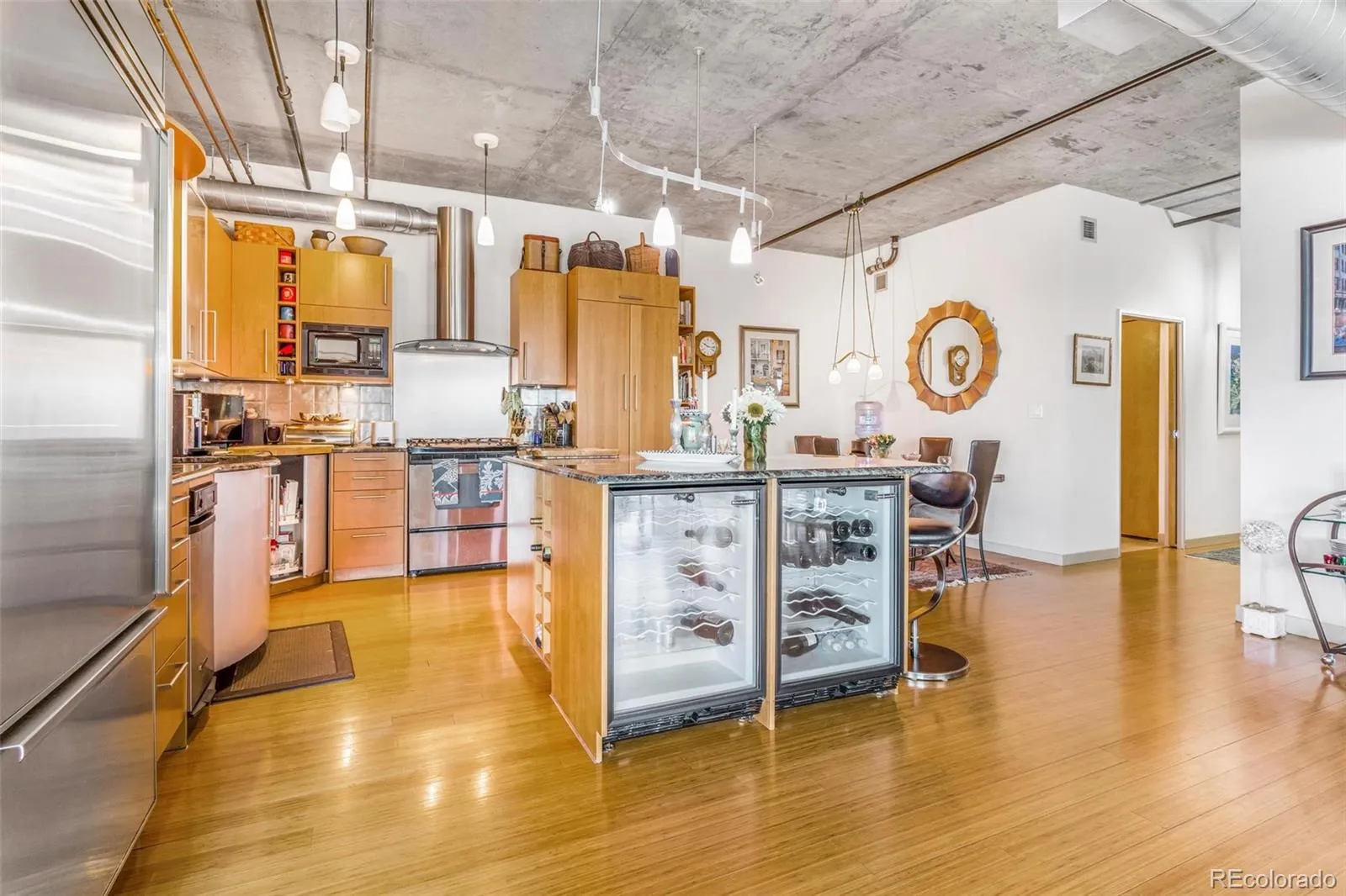 The kitchen is a standout, boasting KitchenAid stainless appliances, granite countertops, large island, trash compactor, ventilation hood above the stove, and two wine coolers—plus two built-in wine display shelves for your collection. Bamboo floors throughout the home are eco-friendly, adding warmth and elegance to the contemporary design.