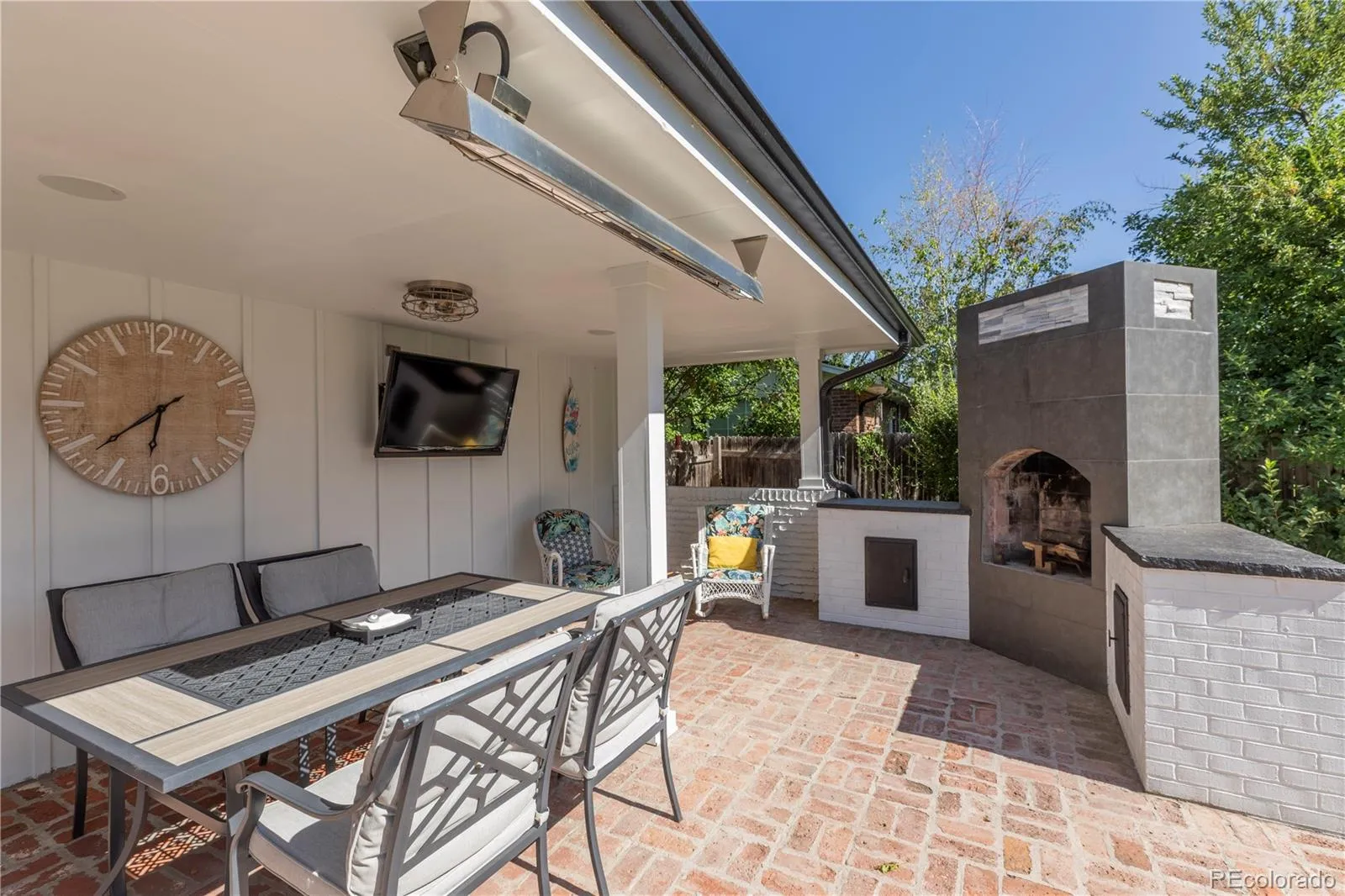Step outside to your private backyard oasis featuring a newly landscaped yard with lush gardens and a stunning patio complete with an outdoor fireplace, ideal for relaxing or hosting gatherings year-round.
