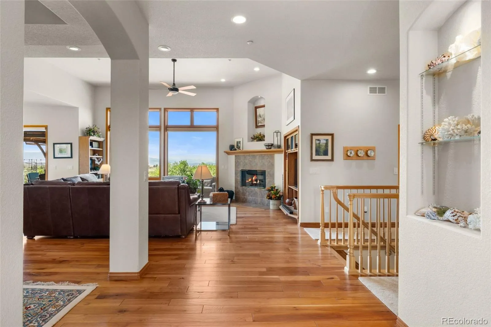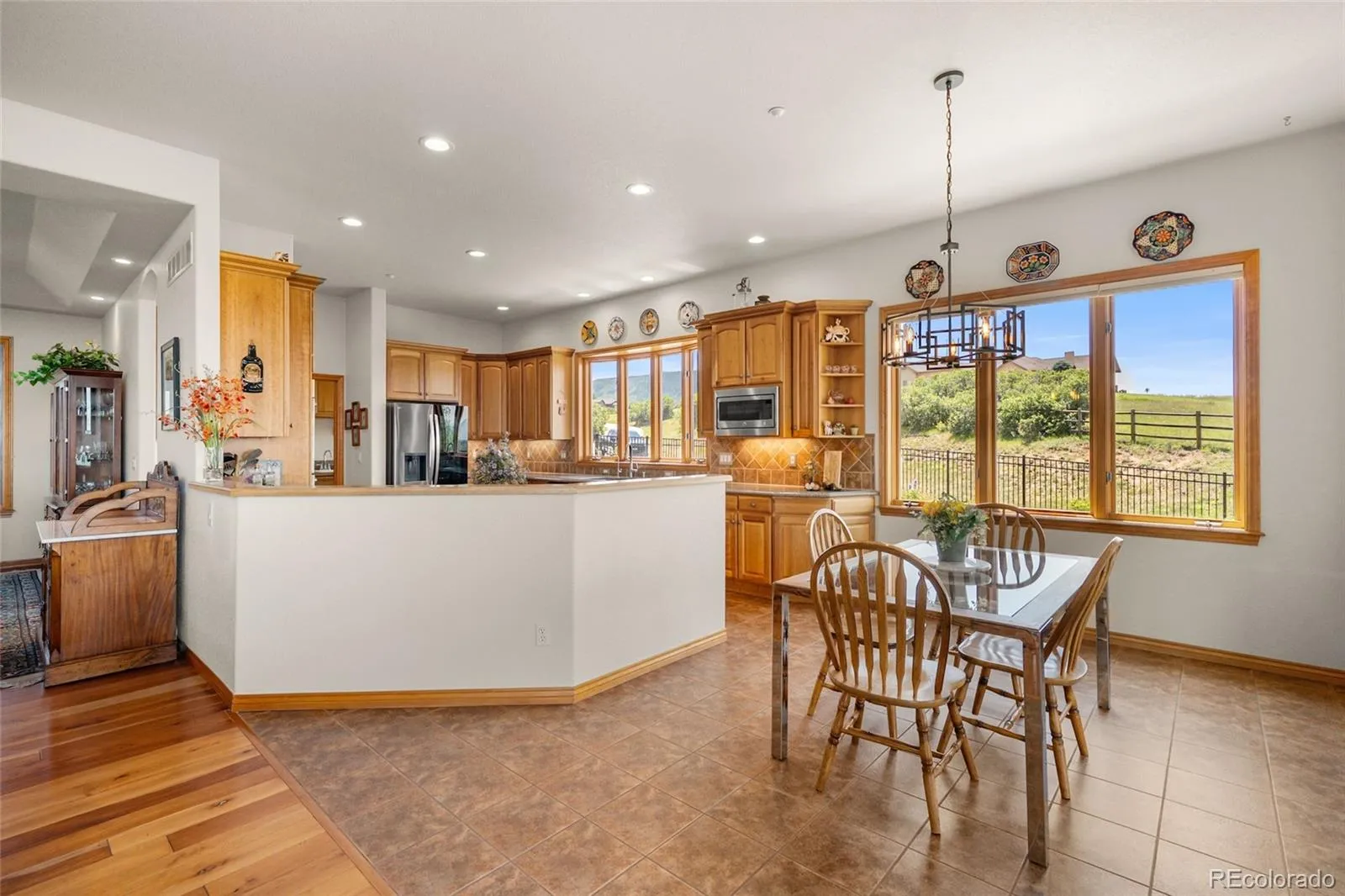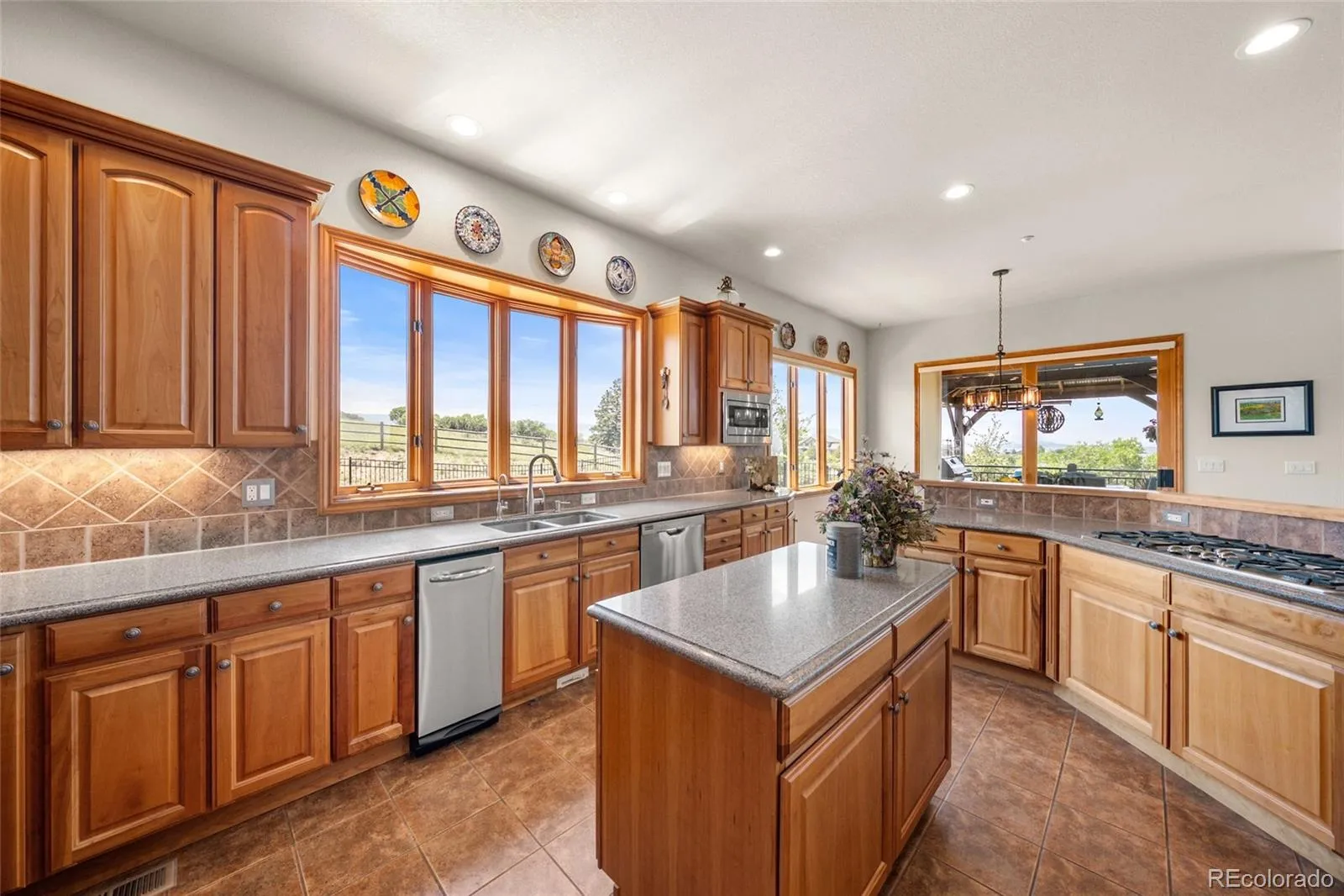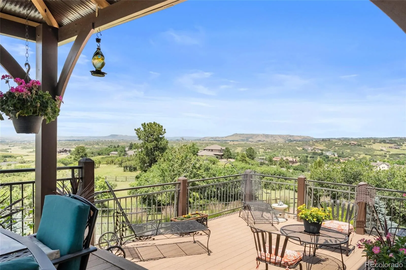Welcome to this stunning retreat nestled on 5.4 private acres in the prestigious equestrian friendly Keene Ranch community. Set back 600 feet from the road, this custom home offers breathtaking panoramic views of the Front Range and twinkling stars at night. Designed for both luxury living and rural tranquility, the property is equine-friendly, allowing up to four horses, with direct access to a network of dedicated community riding trails. The residence features two heated 3-car garages—one attached, one detached—perfect for car enthusiasts or additional storage. Enjoy extensive professional landscaping, a large pond with cascading waterfalls, stamped concrete walkways, and low-voltage underwater lighting that create a magical outdoor ambiance. A fully fenced perimeter with solar-controlled gated entry, matching stone mailbox pillars, and a concrete driveway enhance the property’s privacy and curb appeal. Inside, you’ll find over 5,100 square feet of elegant living space with an open floor plan, vaulted ceilings, and sophisticated finishes throughout. The home boasts two expansive primary suites, each with ensuite baths, along with two additional bedrooms, a second family room, and two dedicated offices. The walkout basement is bright and spacious, and the home is handicap accessible with no-stair garage entry and wide doorways. Additional features include a whole-house Generac generator, Bullfrog in-ground spa, water treatment system with reverse osmosis at the kitchen sink, central vacuum, Hunter Douglas window coverings (6 with power operation), three EV charging stations, radon mitigation system, Boral Concrete Tile Hail and Fire Resistant Roof and more. Included in the sale are a Kabota enclosed cab tractor with snowblower (Model 2650) and a 2018 Kabota zero-turn riding mower (Model Z421KW-54). Keene Ranch offers approx. 247 homes on acreage, friendly neighbors, and an abundance of wildlife, and more. Minutes from Dawson Butte Open Space.