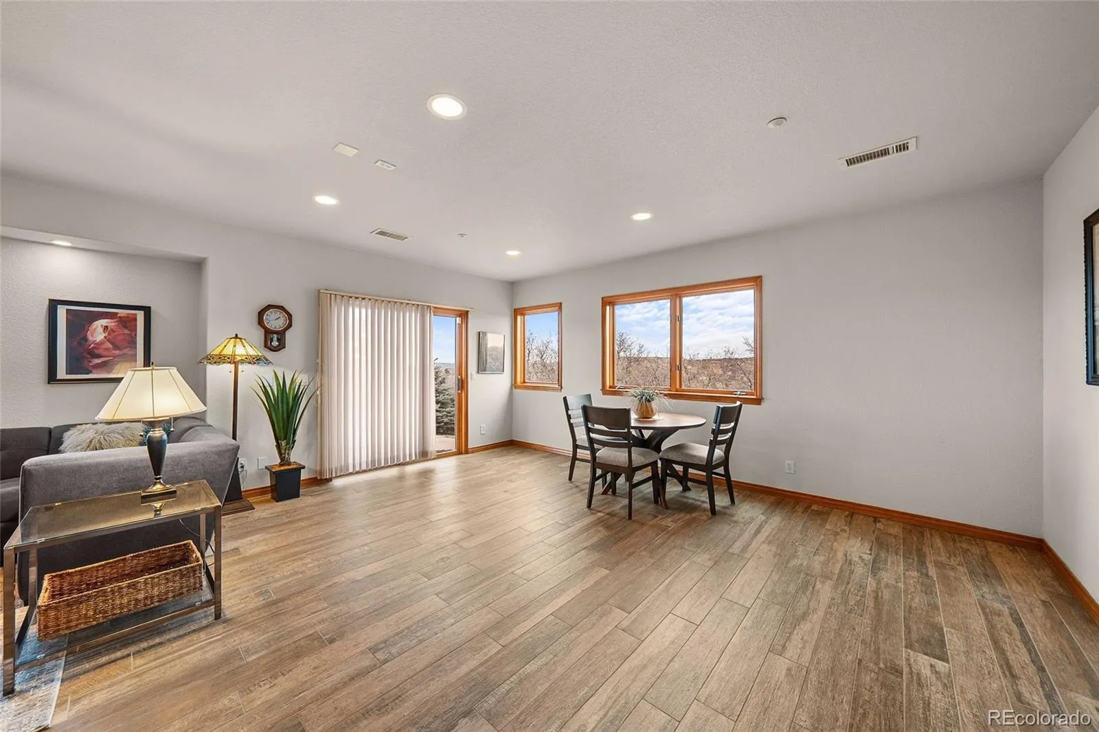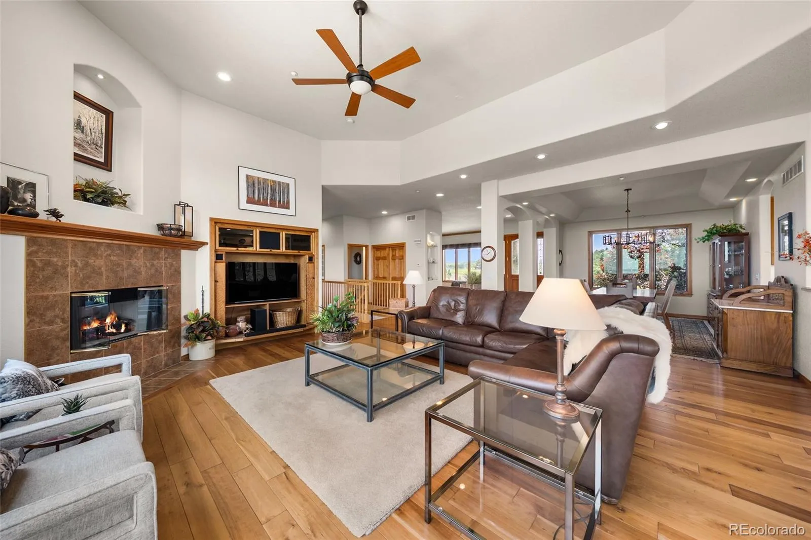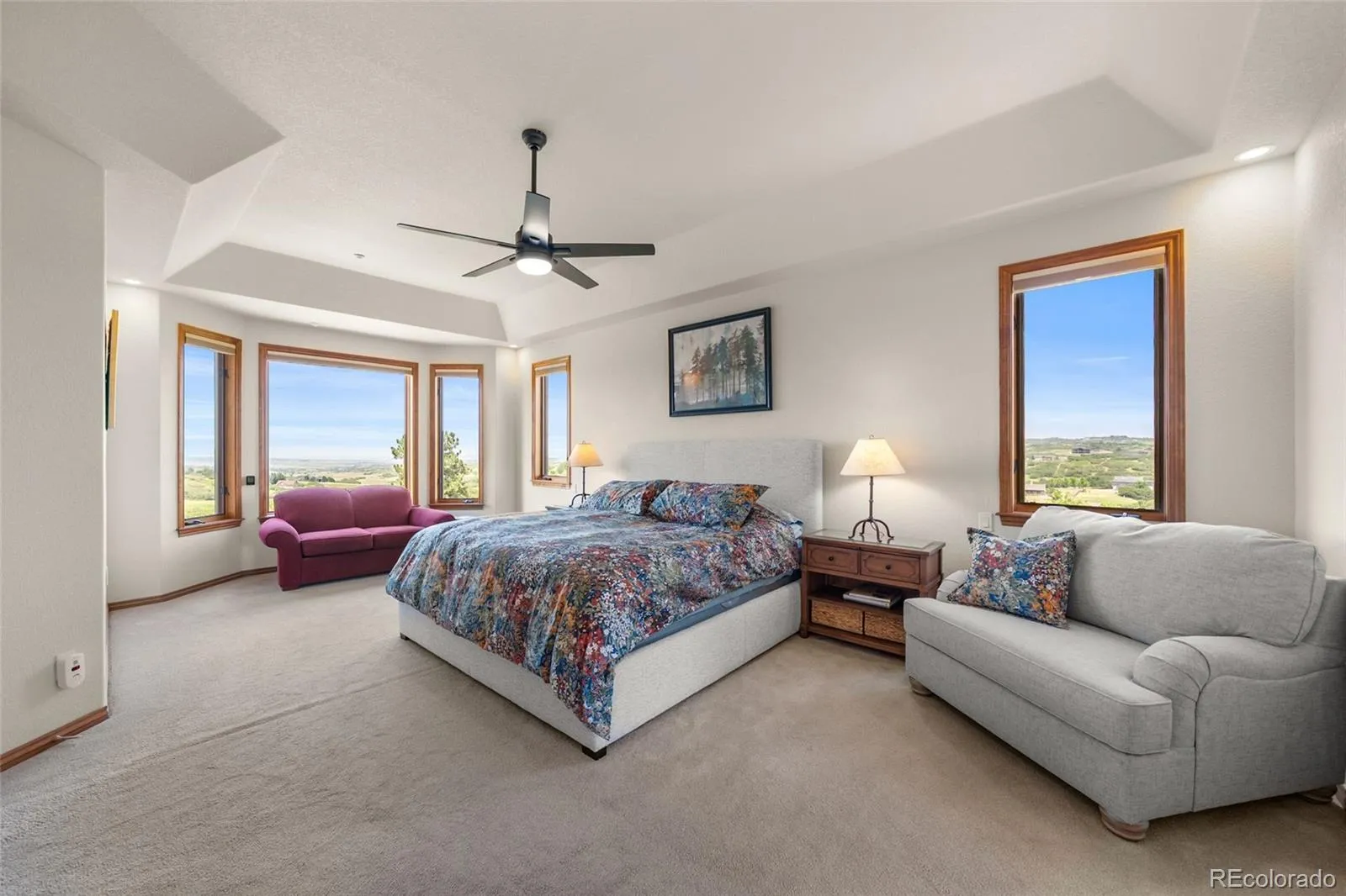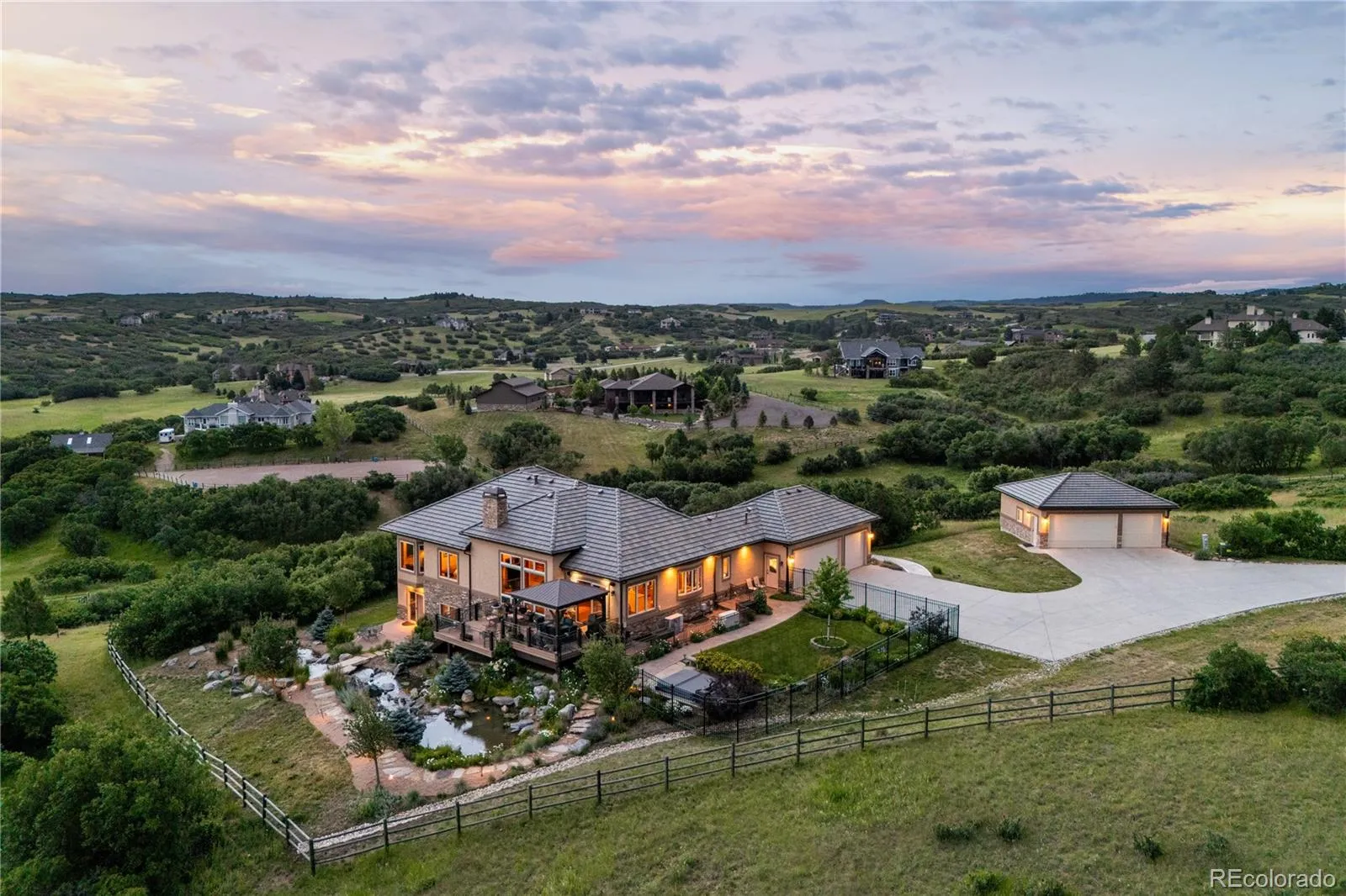Welcome to this stunning retreat nestled on 5.4 private acres in the prestigious equestrian friendly Keene Ranch community. Set back 600 feet from the road, this custom home offers breathtaking panoramic views of the Front Range and twinkling stars at night. Designed for both luxury living and rural tranquility, the property is equine-friendly, allowing up to four horses, with direct access to a network of dedicated community riding trails. The residence features two heated 3-car garages—one attached, one detached—perfect for car enthusiasts or additional storage. Enjoy extensive professional landscaping, a large pond with cascading waterfalls, stamped concrete walkways, and low-voltage underwater lighting that create a magical outdoor ambiance. A fully fenced perimeter with solar-controlled gated entry, matching stone mailbox pillars, and a concrete driveway enhance the property’s privacy and curb appeal. Inside, you’ll find over 5,100 square feet of elegant living space with an open floor plan, vaulted ceilings, and sophisticated finishes throughout. The home boasts two expansive primary suites, each with ensuite baths, along with two additional bedrooms, a second family room, and two dedicated offices. The walkout basement is bright and spacious, and the home is handicap accessible with no-stair garage entry and wide doorways. Additional features include a whole-house Generac generator, Bullfrog in-ground spa, water treatment system with reverse osmosis at the kitchen sink, central vacuum, Hunter Douglas window coverings (6 with power operation), three EV charging stations, radon mitigation system, Boral Concrete Tile Hail and Fire Resistant Roof and more. Included in the sale are a Kabota enclosed cab tractor with snowblower (Model 2650) and a 2018 Kabota zero-turn riding mower (Model Z421KW-54). Keene Ranch offers approx. 247 homes on acreage, friendly neighbors, and an abundance of wildlife, and more. Minutes from Dawson Butte Open Space.